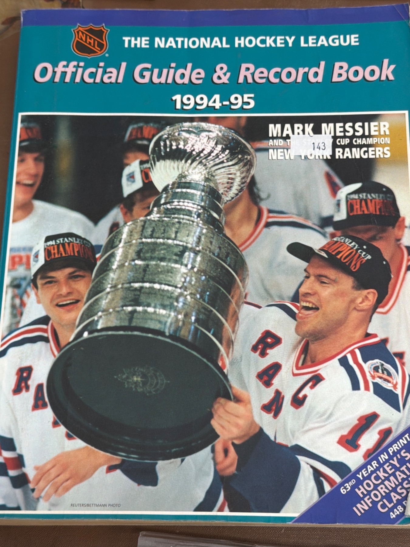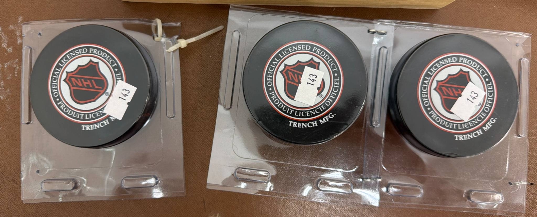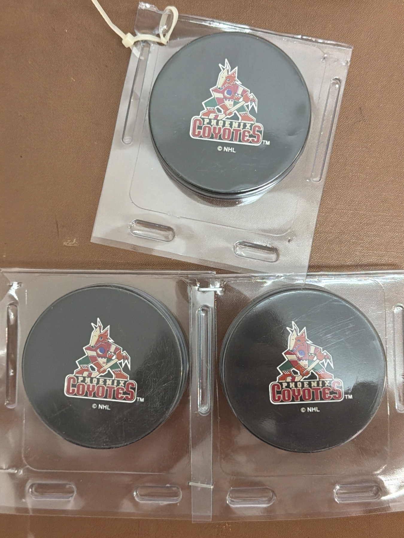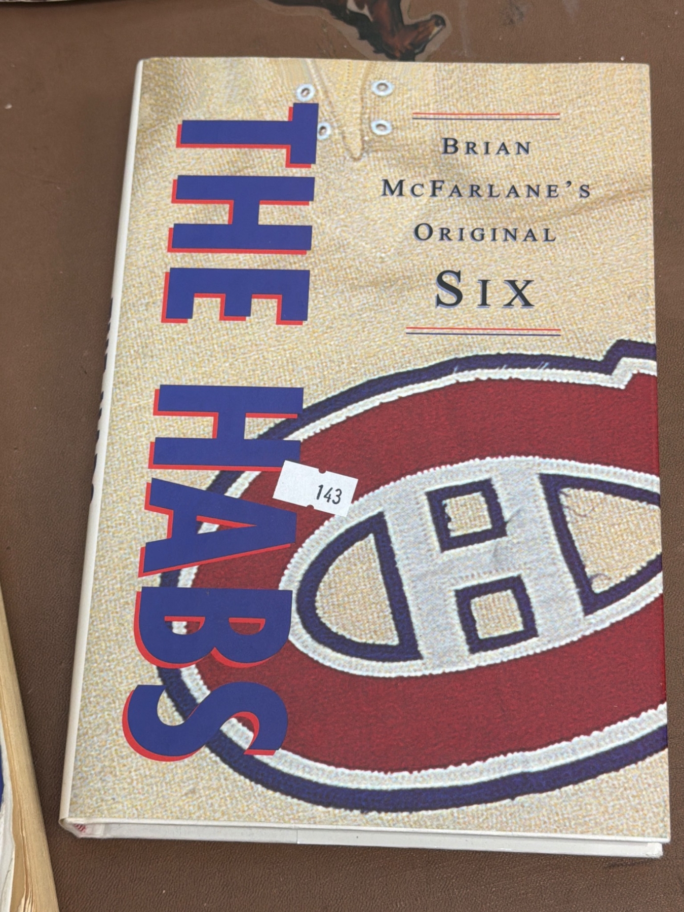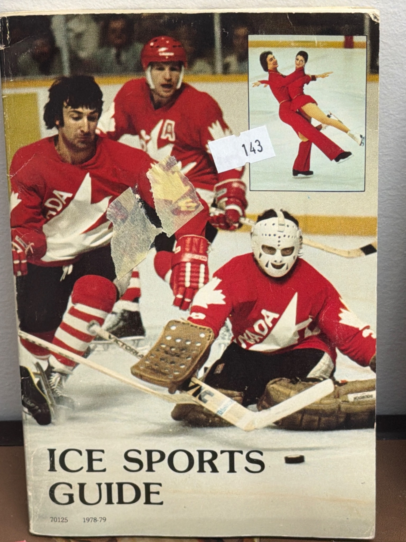 Various hockey memorabilia such as books and guides: Ken Dryden's 'The Game,' 'The Habs - Brian McFarlane's Original Six,' National Hockey League Official Guides (1983-84 and 1994-95), 'Colorado Rockies 1981-82 Media Guide,' 'Ice Sports Guide 1978-79,' and three official NHL pucks featuring Arizona Coyotes branding. Items vary in condition with some wear present due to age.