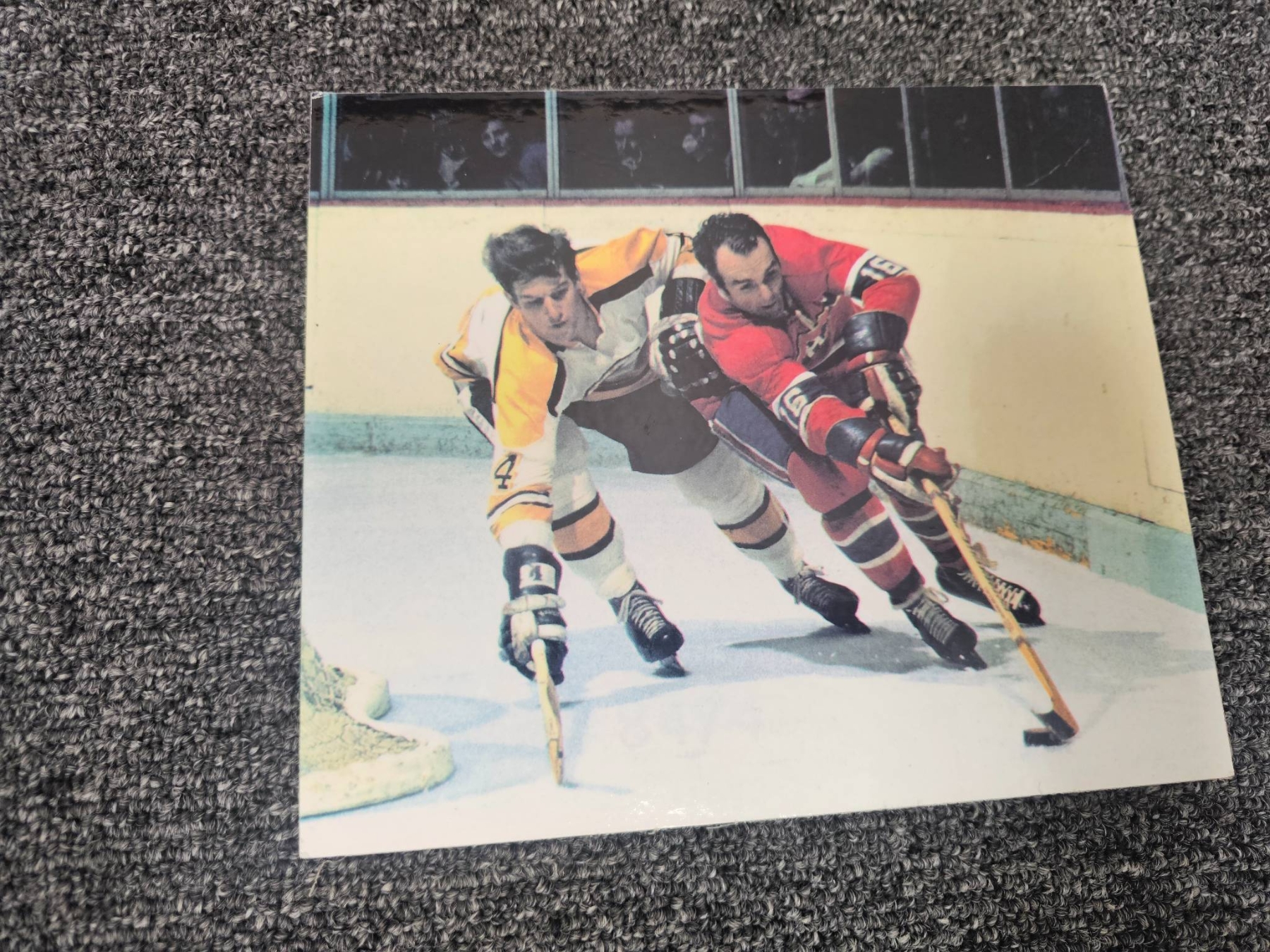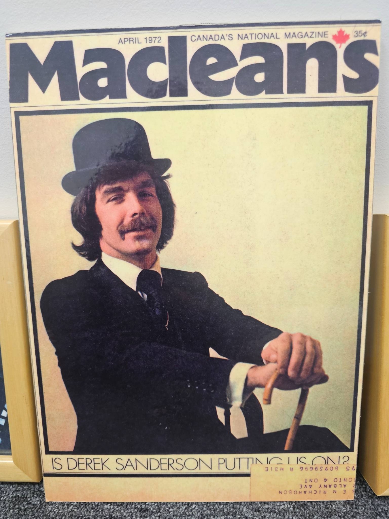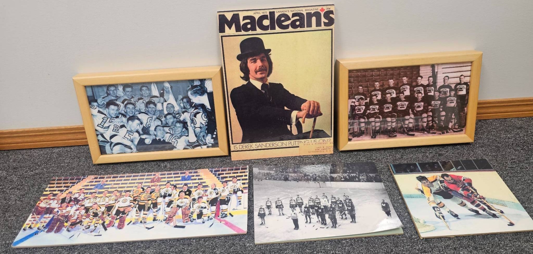 A captivating collection for hockey enthusiasts, featuring framed and unframed historical photographs of hockey teams and players, including color and black-and-white prints. Also includes the April 1972 issue of Maclean's magazine, with a cover story featuring noted hockey figure Derek Sanderson. The photographs showcase moments that reflect the rich heritage of the sport.