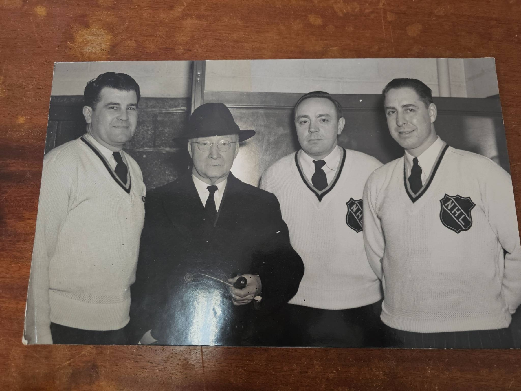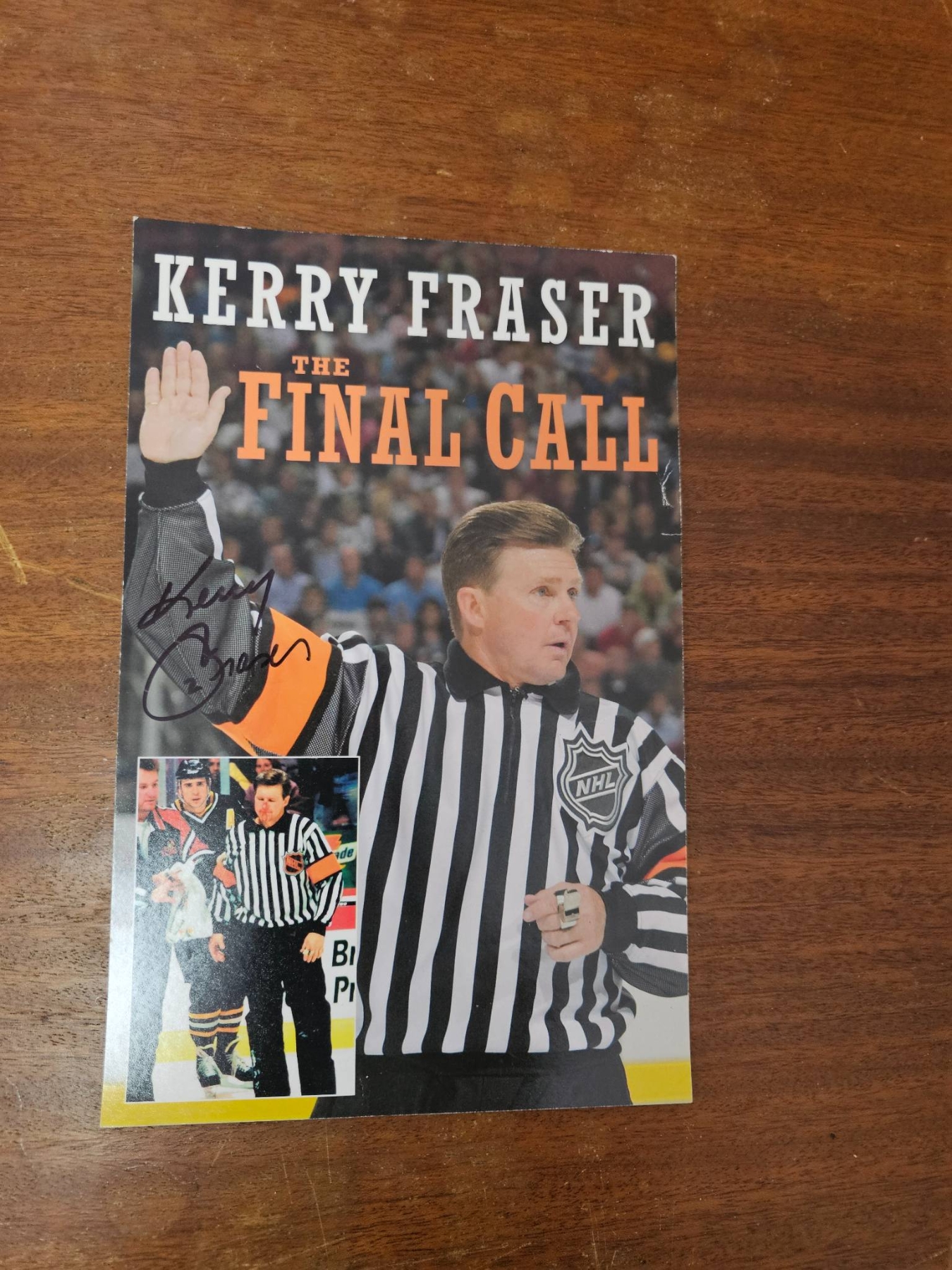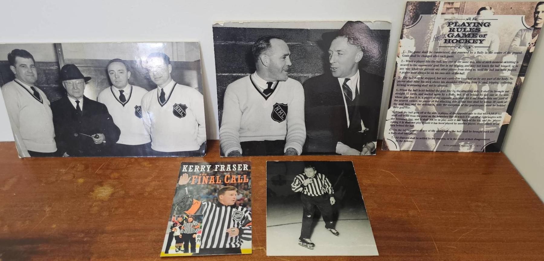 A mix of NHL memorabilia and hockey-related items. Features vintage black-and-white photographs displaying NHL personnel, a signed booklet by Kerry Fraser titled 'The Final Call,' a historical reprint of hockey rules dated February 27, 1877, and additional photographic prints. Certain photos show inscriptions on the reverse. Condition is mixed with minor wear. Historical and collectible pieces for hockey enthusiasts.