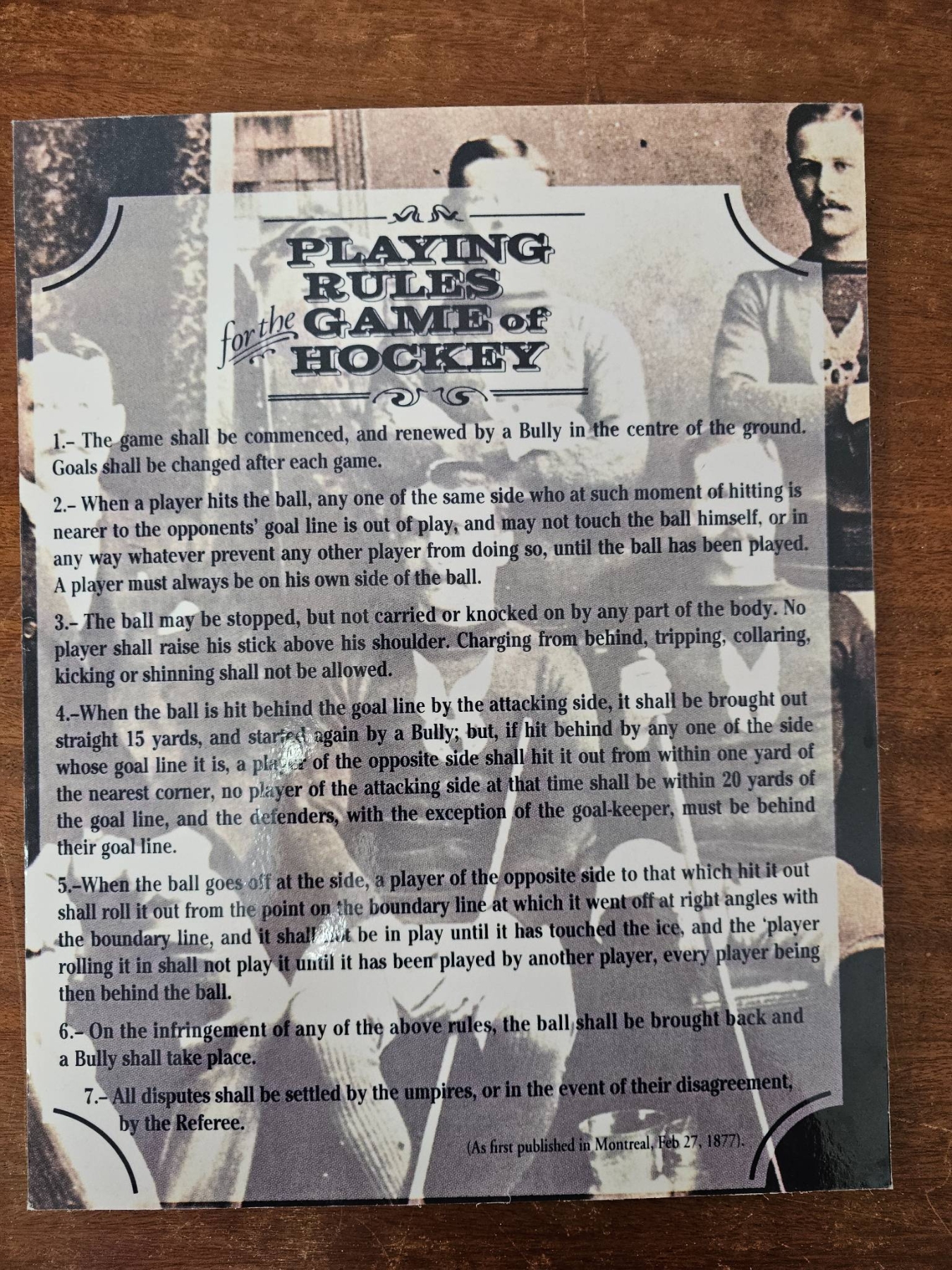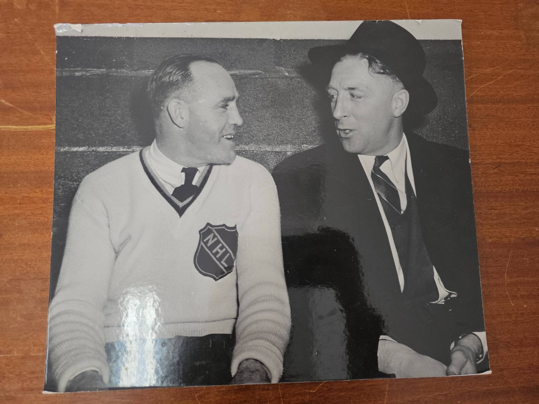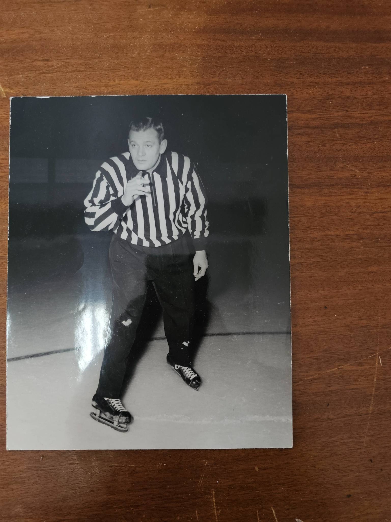 A mix of NHL memorabilia and hockey-related items. Features vintage black-and-white photographs displaying NHL personnel, a signed booklet by Kerry Fraser titled 'The Final Call,' a historical reprint of hockey rules dated February 27, 1877, and additional photographic prints. Certain photos show inscriptions on the reverse. Condition is mixed with minor wear. Historical and collectible pieces for hockey enthusiasts.