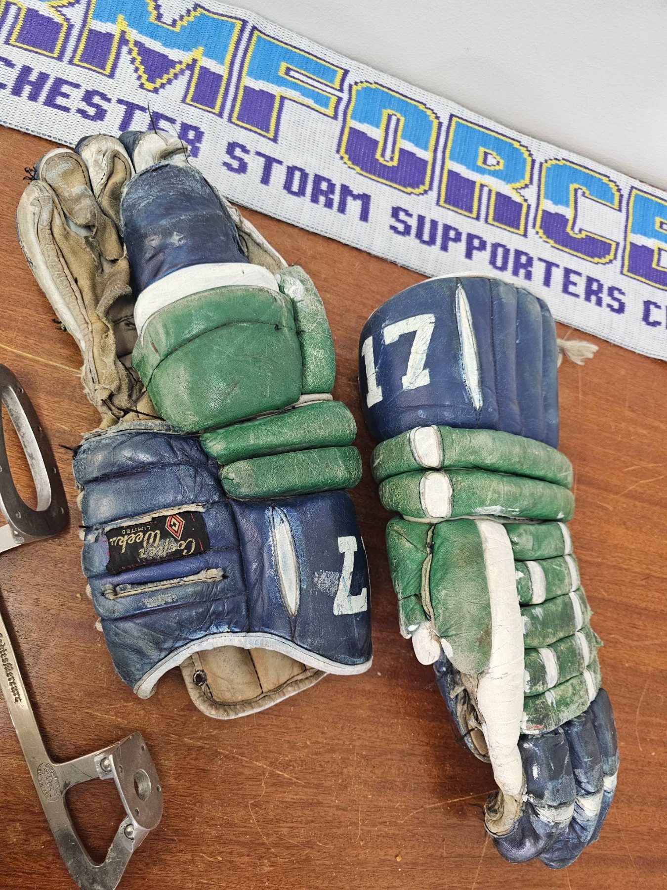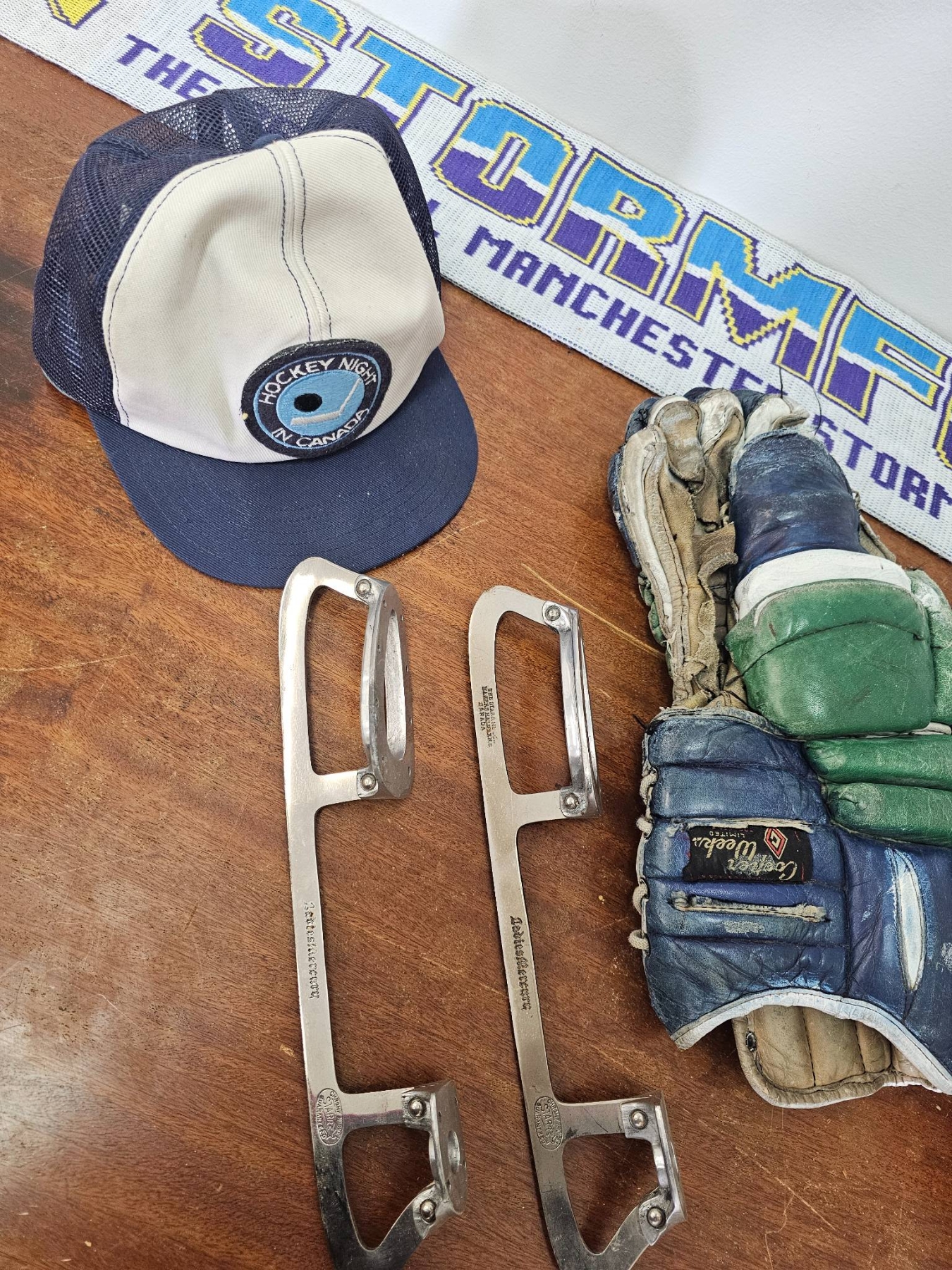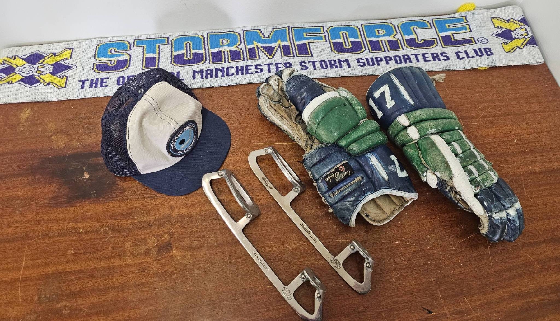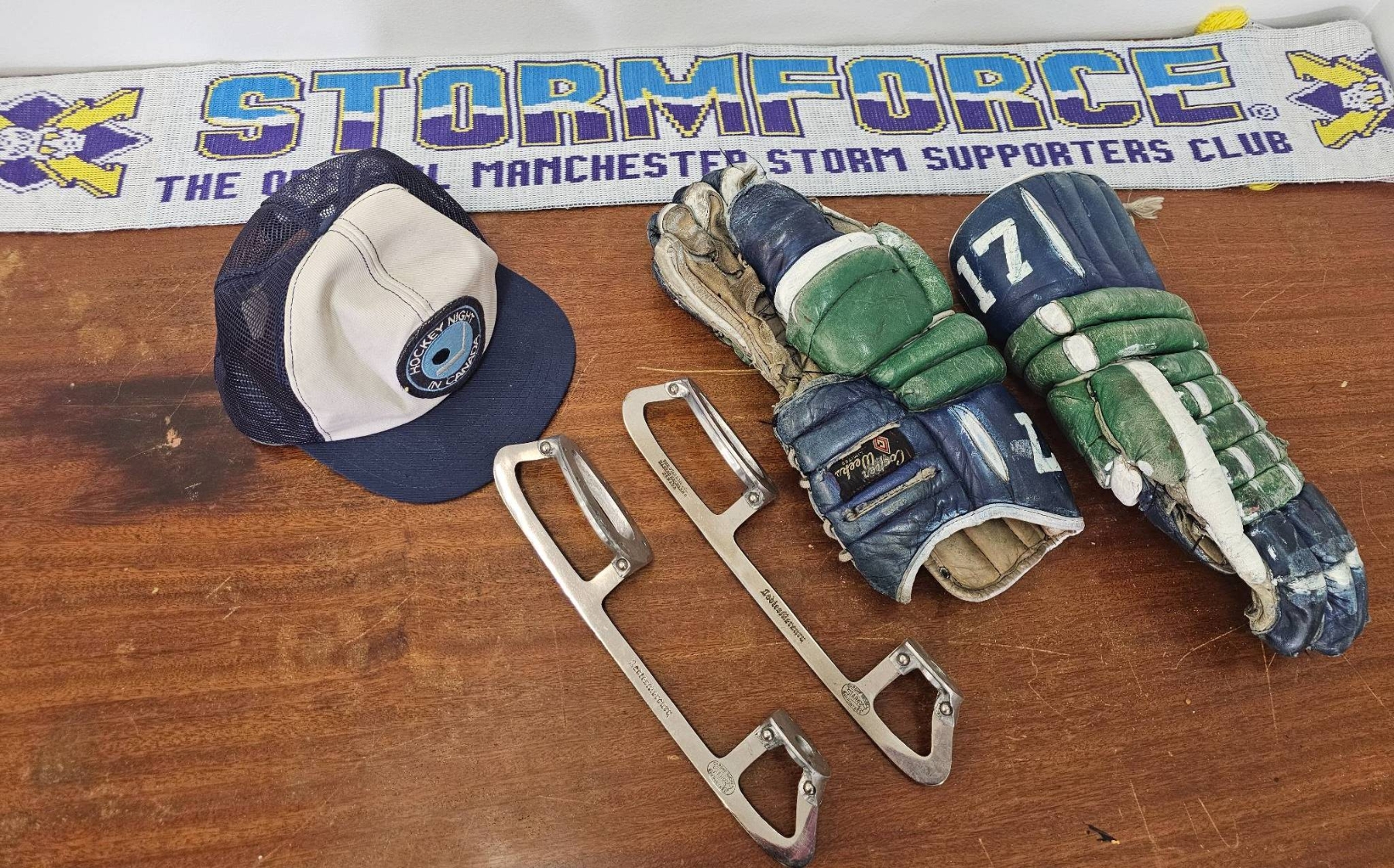 Hockey memorabilia lot including a pair of worn hockey gloves, a Manchester Storm supporters club scarf, a blue and white cap with a hockey-themed patch, and two blade protectors. The gloves feature visible wear and bear the number 17. The scarf showcases 'Stormforce' branding representing the supporters club.