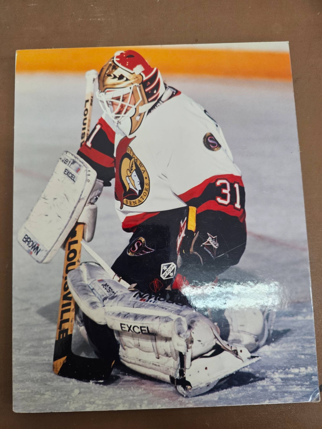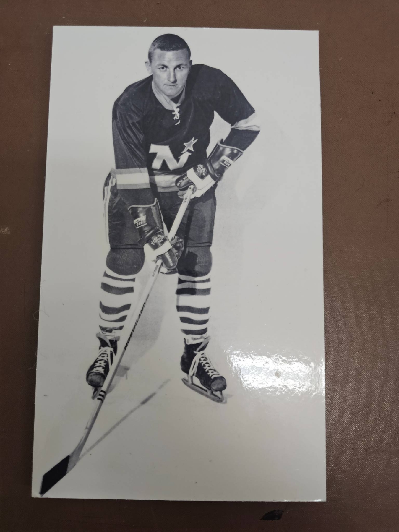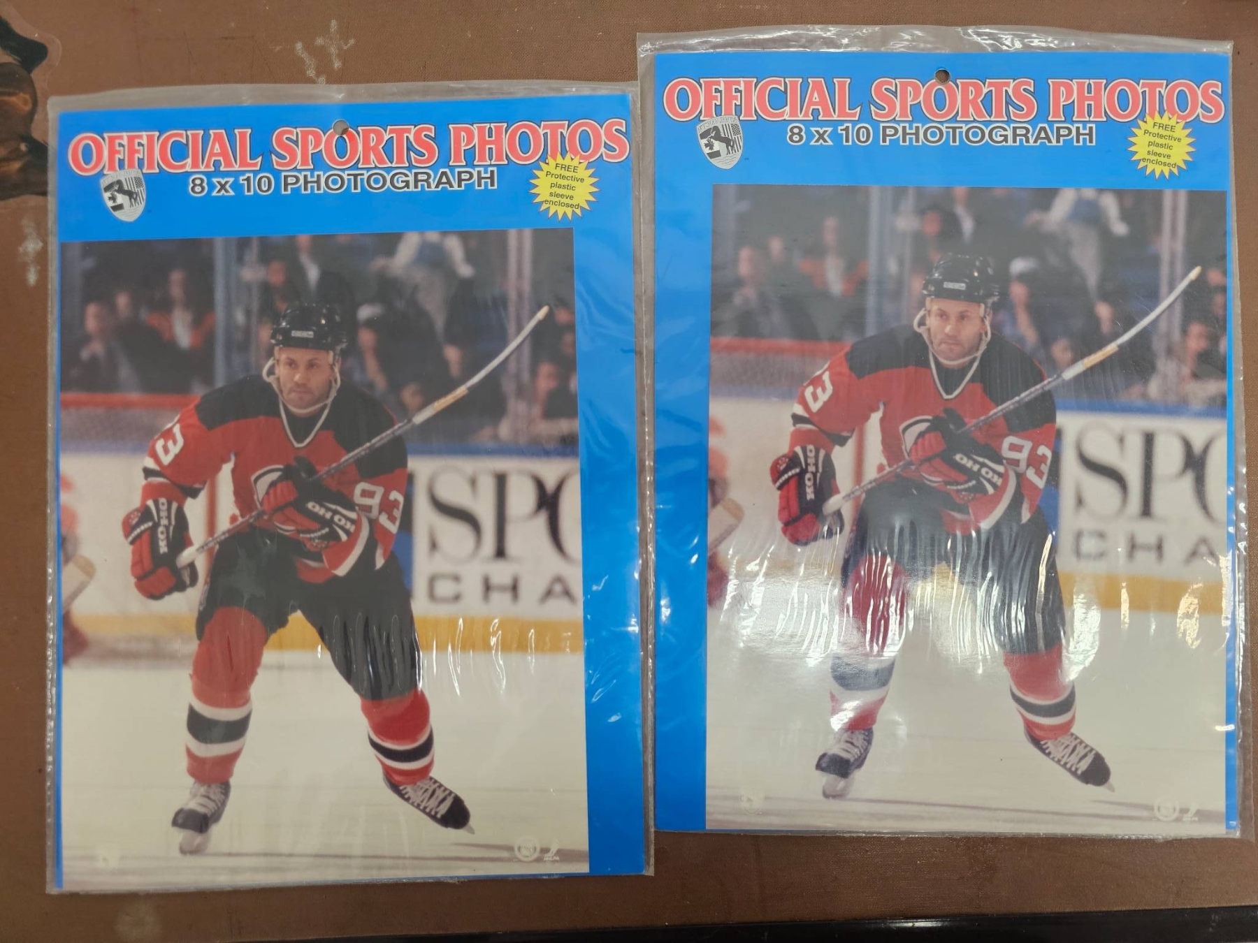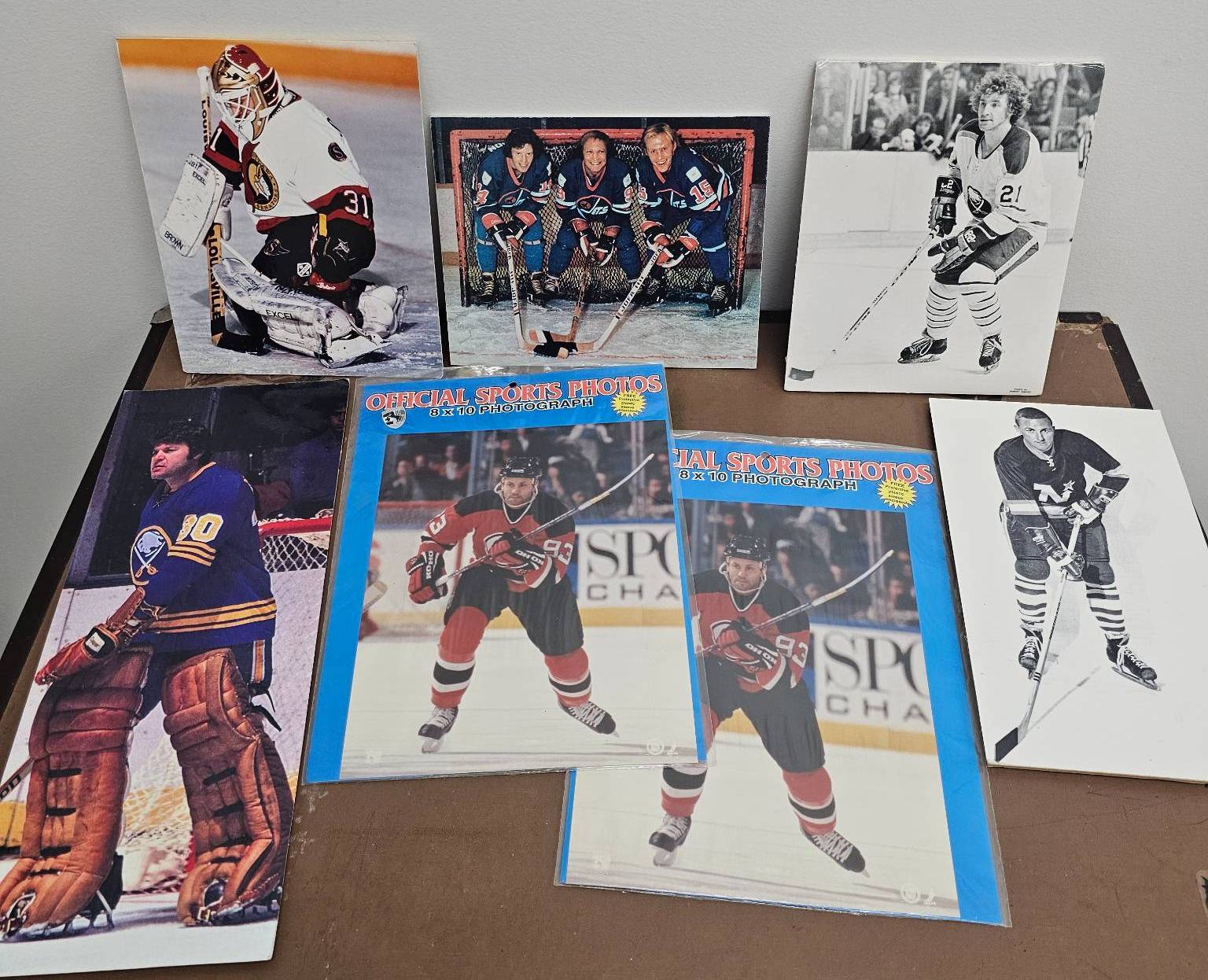 A diverse collection of hockey memorabilia including color and black-and-white photographs of various players and teams. The lot contains classic snapshots, such as goalies in action, individual player portraits, and group team poses. Some photographs include handwritten notes on the back for added context. Ideal for sports enthusiasts or collectors of hockey history.