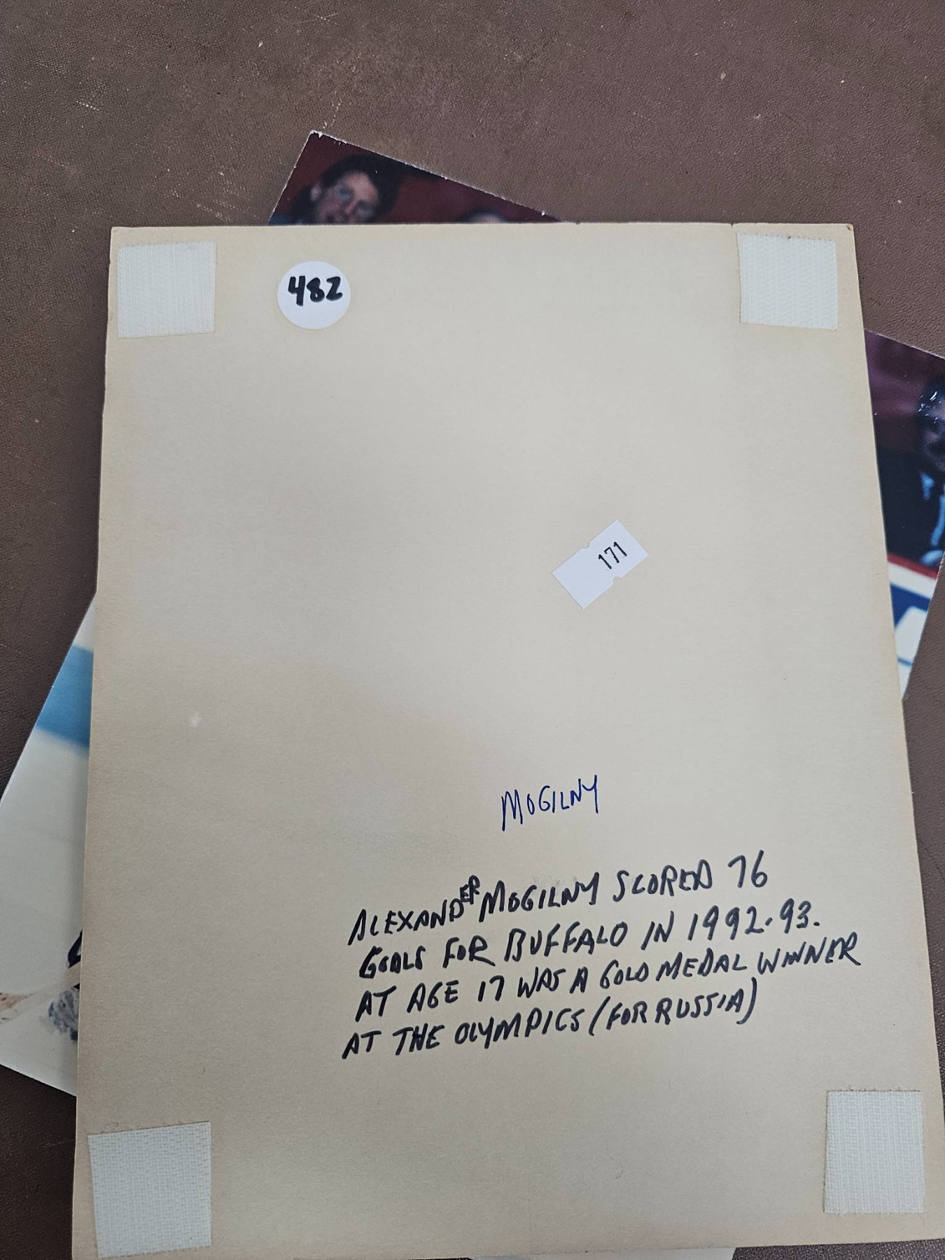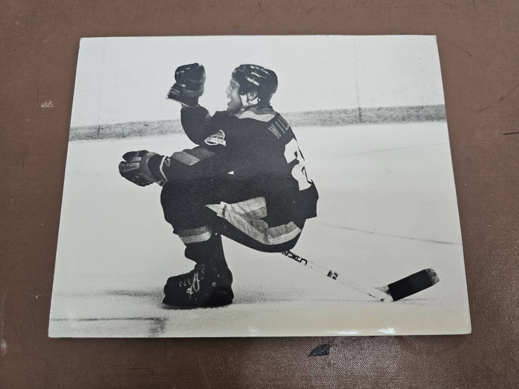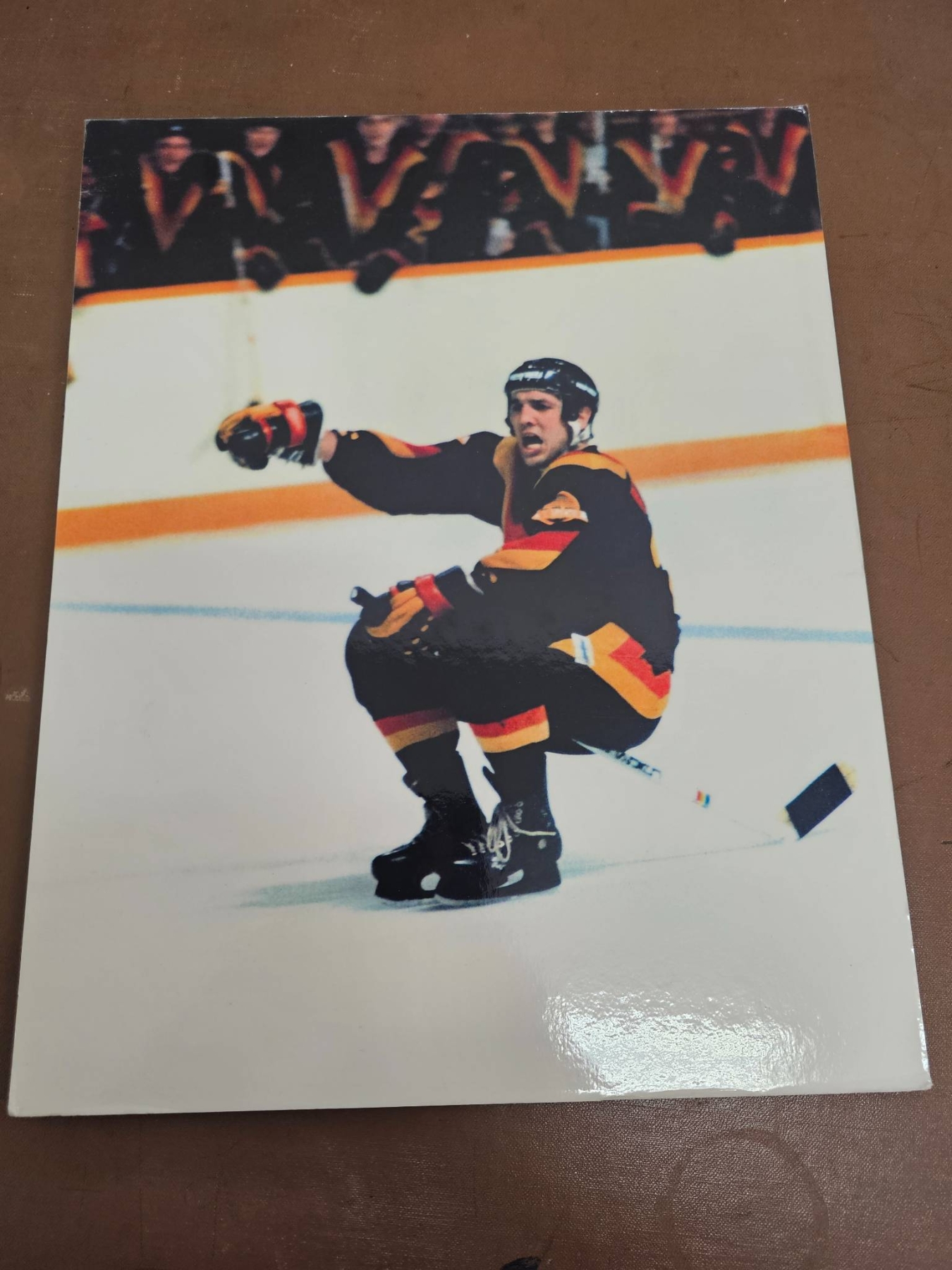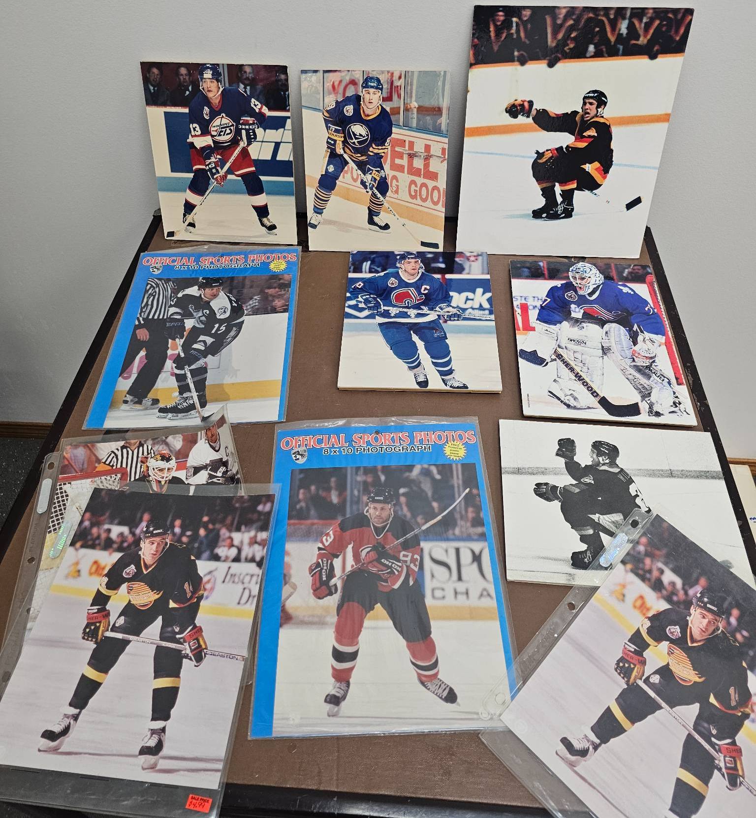 A diverse collection of hockey memorabilia including various 8x10 color and black-and-white photographs featuring NHL players from different teams such as the Quebec Nordiques, Vancouver Canucks, and Buffalo Sabres. Some images are sealed and others contain handwritten notes with details about the players' achievements. A great selection for hockey fans and collectors.