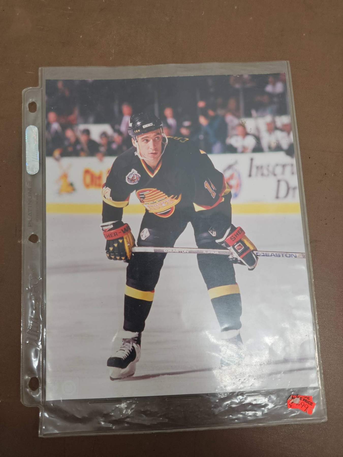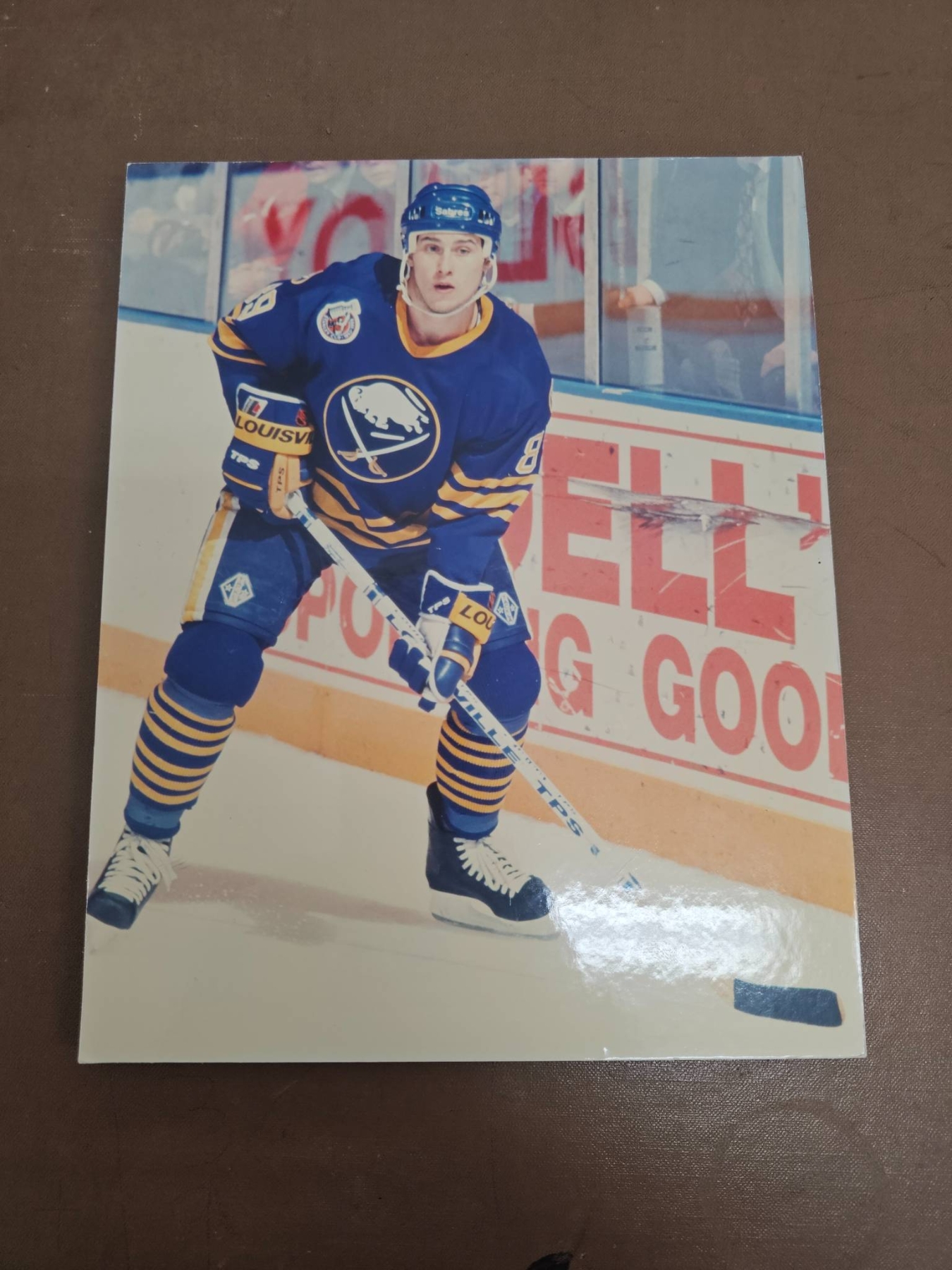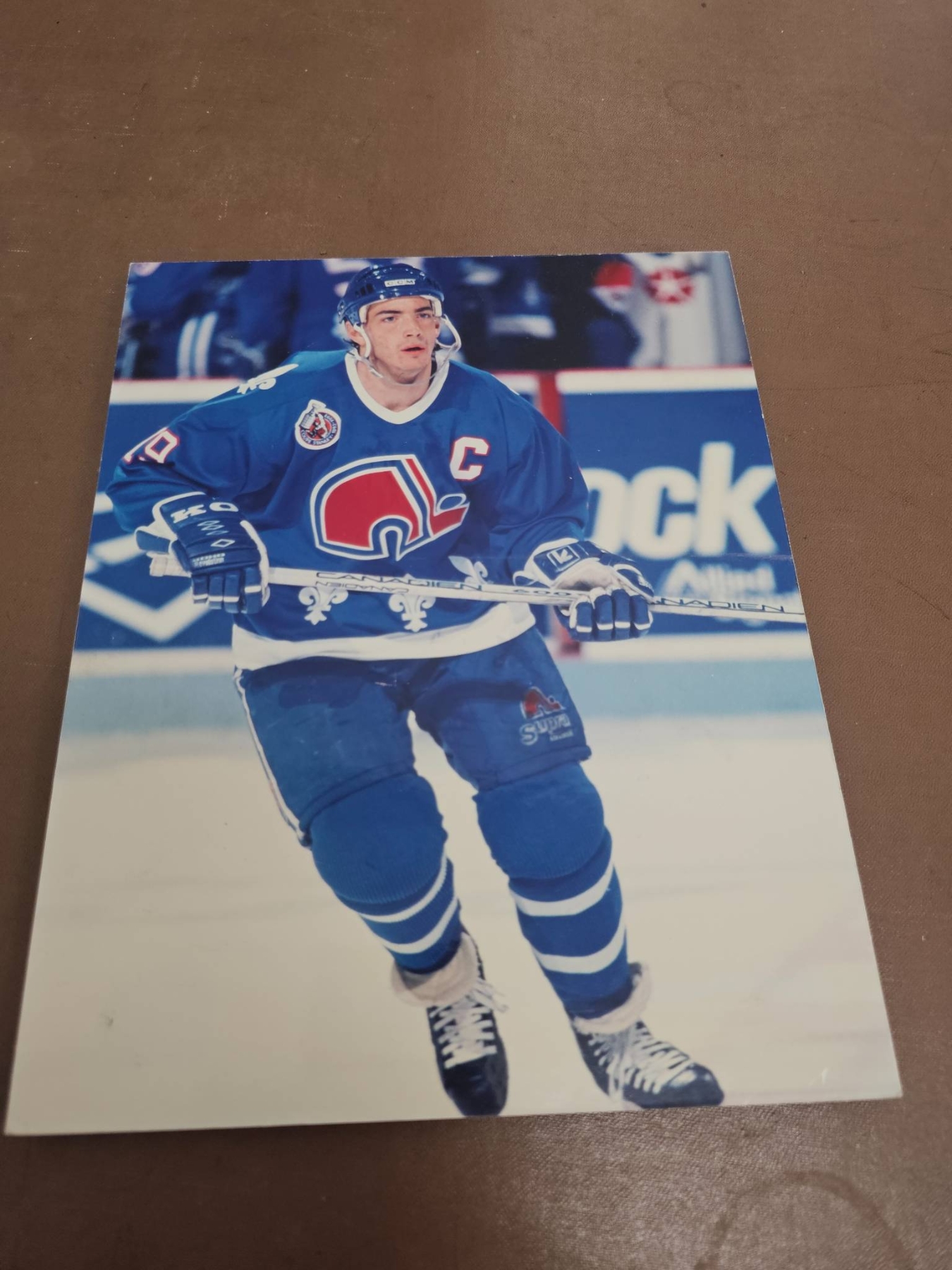 A diverse collection of hockey memorabilia including various 8x10 color and black-and-white photographs featuring NHL players from different teams such as the Quebec Nordiques, Vancouver Canucks, and Buffalo Sabres. Some images are sealed and others contain handwritten notes with details about the players' achievements. A great selection for hockey fans and collectors.