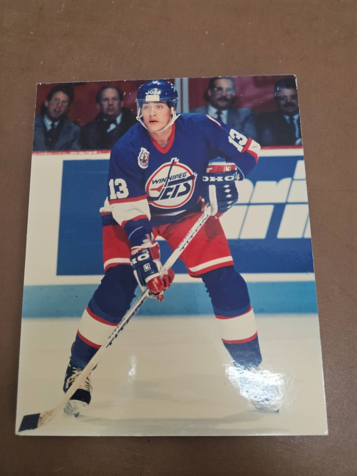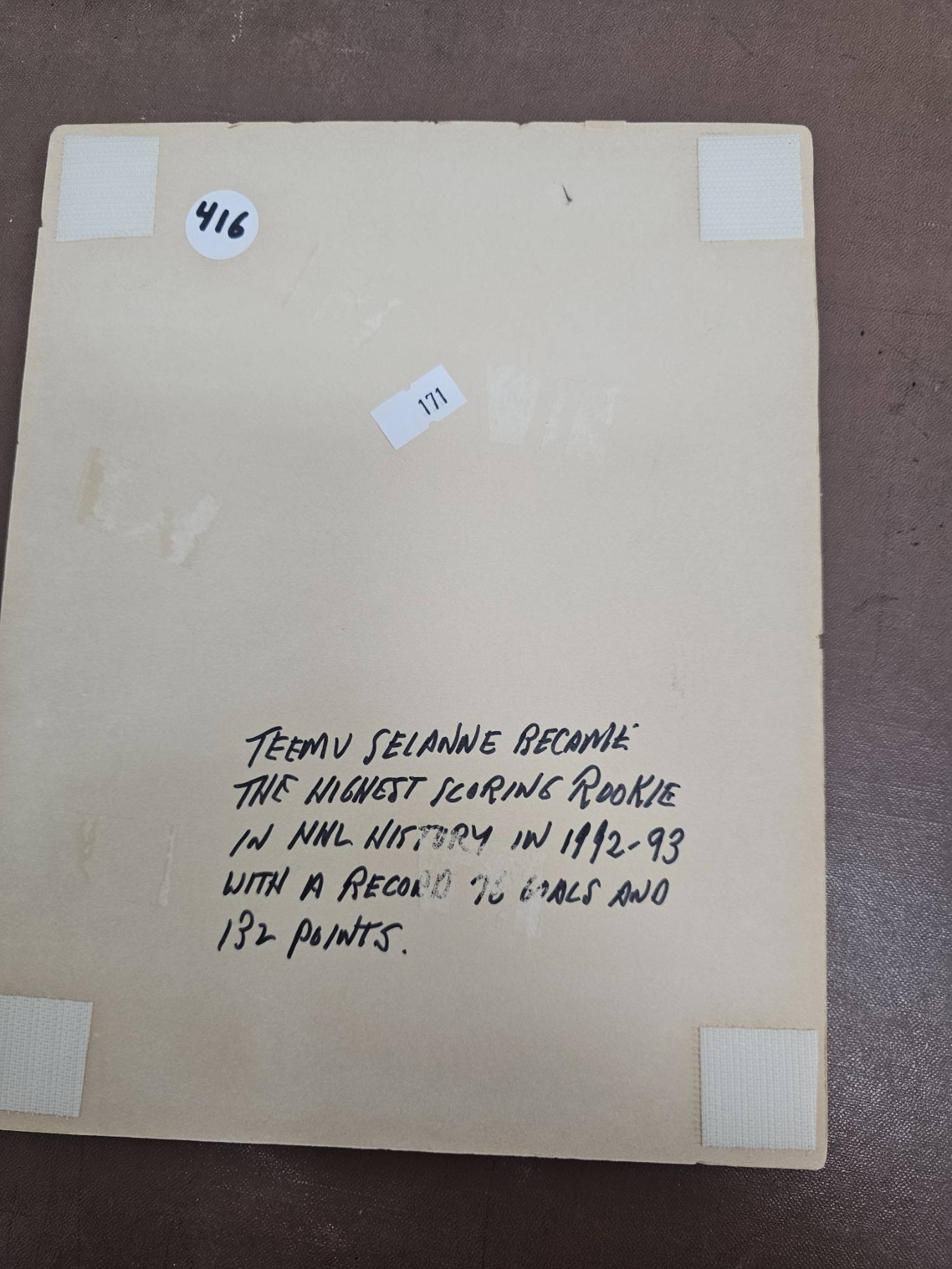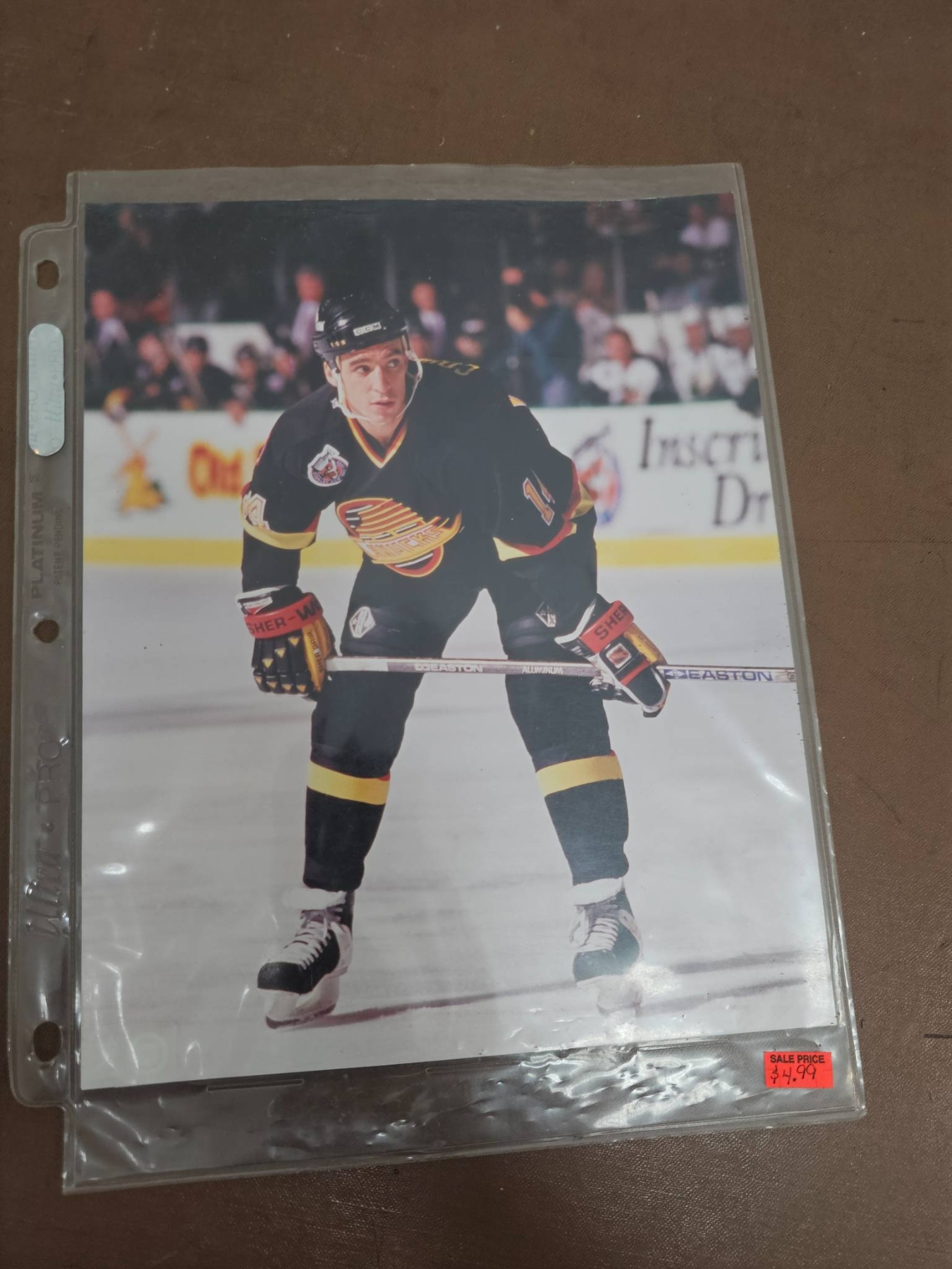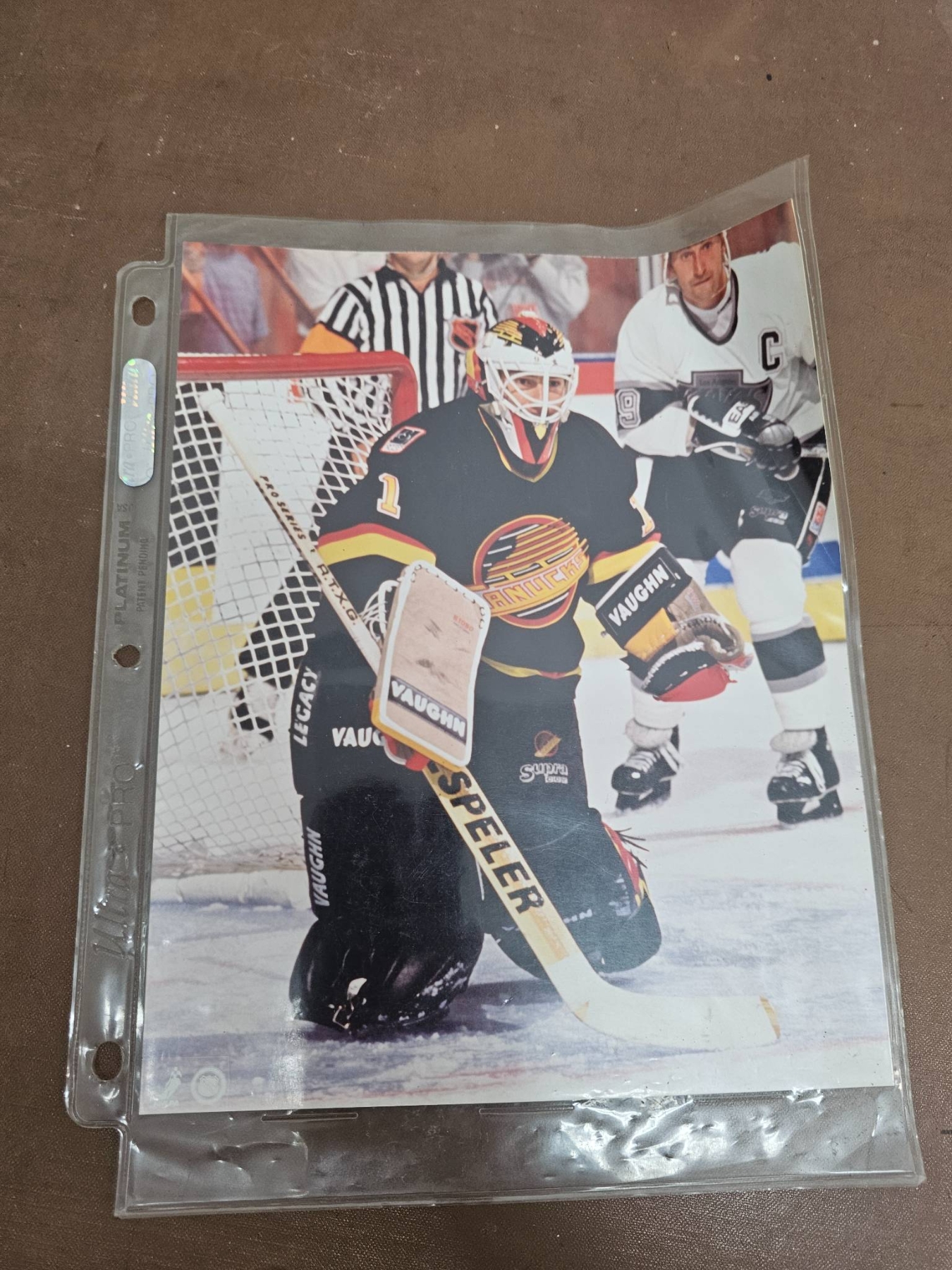 A diverse collection of hockey memorabilia including various 8x10 color and black-and-white photographs featuring NHL players from different teams such as the Quebec Nordiques, Vancouver Canucks, and Buffalo Sabres. Some images are sealed and others contain handwritten notes with details about the players' achievements. A great selection for hockey fans and collectors.