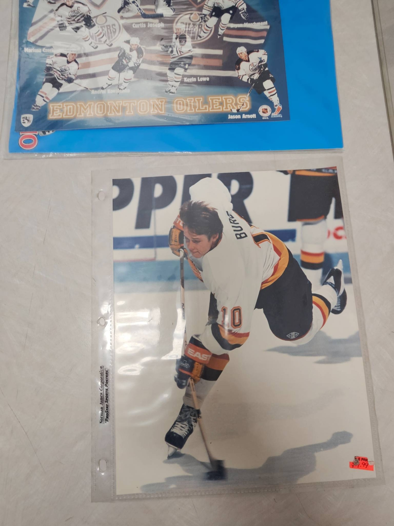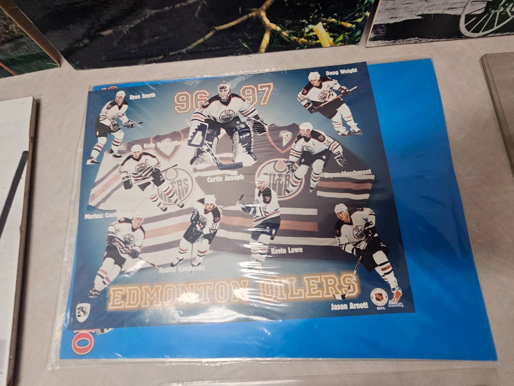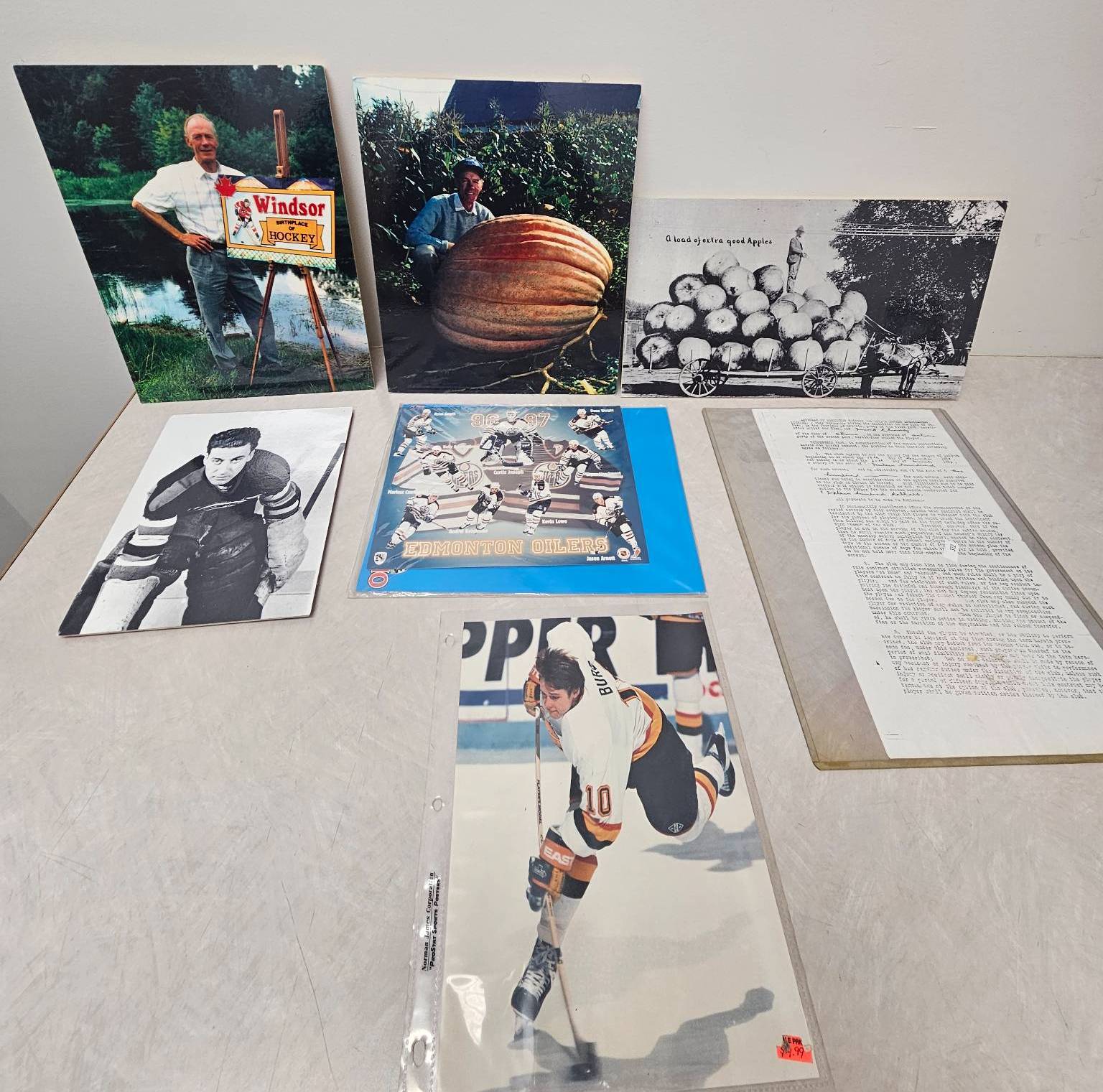 Unique collection of memorabilia including a color photo of a hockey player in action, an Edmonton Oilers team photo, a black-and-white image of a vintage hockey player, and additional vintage photographs depicting various settings, such as agriculture and community scenes. Includes a typewritten document. A diverse lot for hockey enthusiasts and vintage photo collectors.