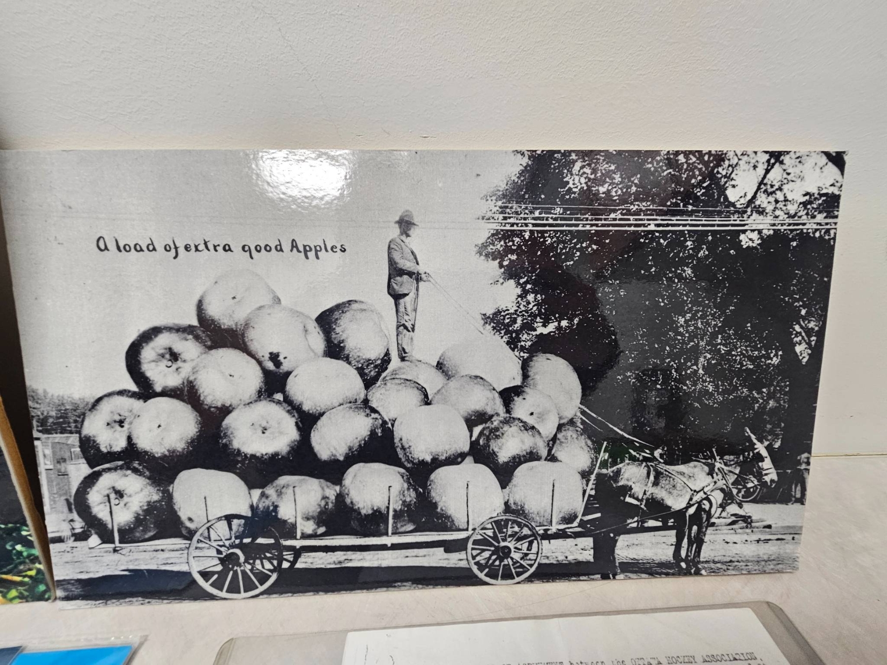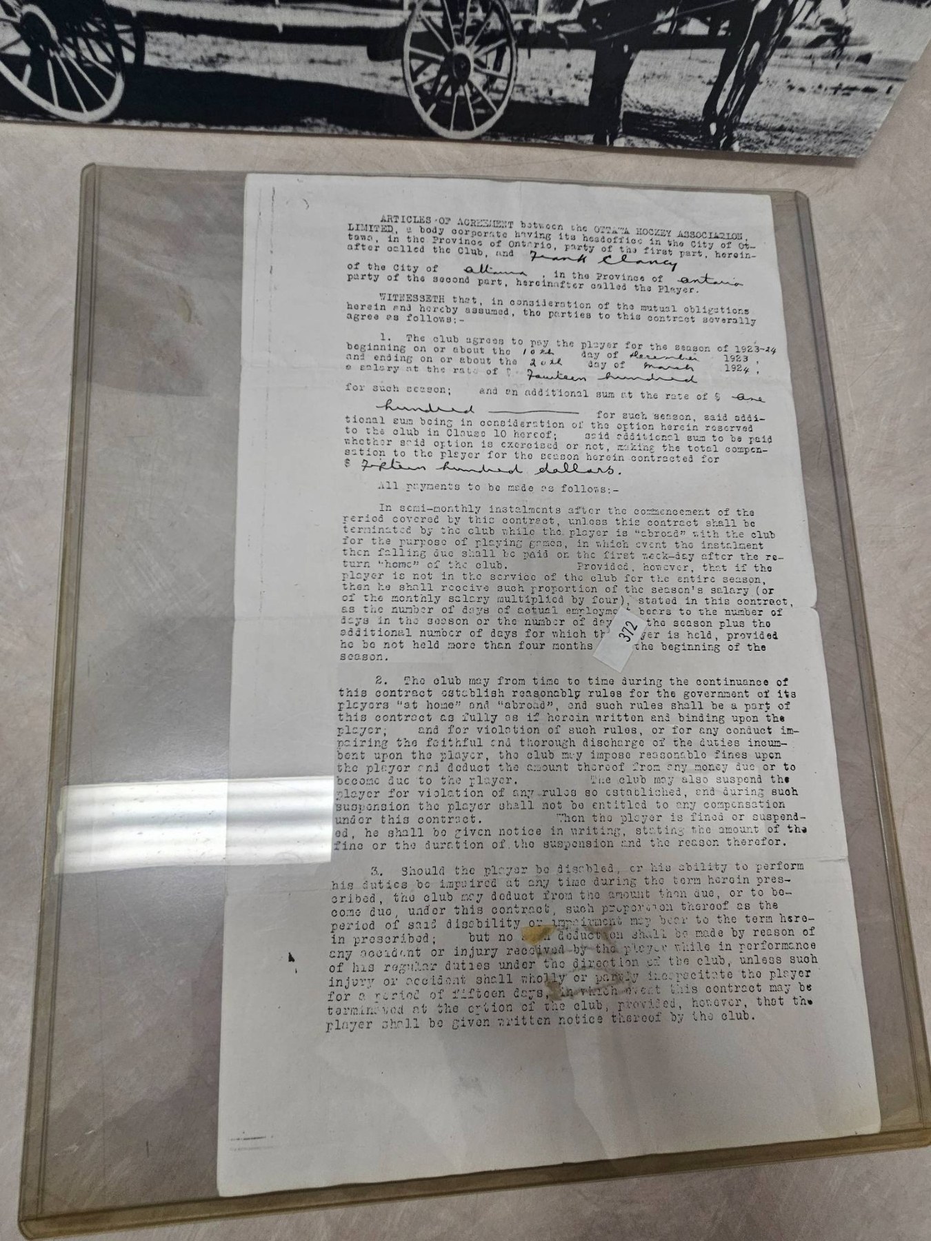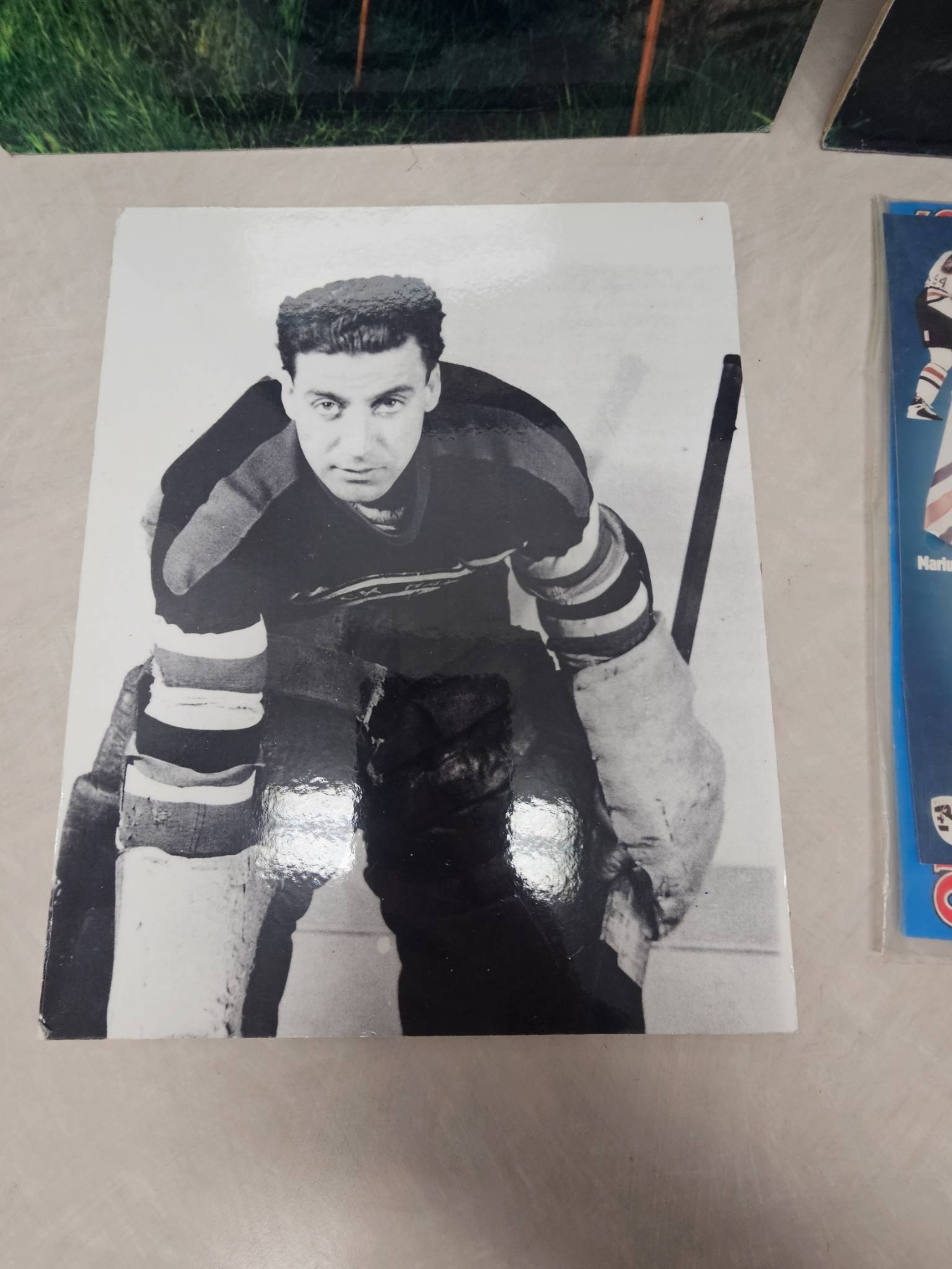 Unique collection of memorabilia including a color photo of a hockey player in action, an Edmonton Oilers team photo, a black-and-white image of a vintage hockey player, and additional vintage photographs depicting various settings, such as agriculture and community scenes. Includes a typewritten document. A diverse lot for hockey enthusiasts and vintage photo collectors.