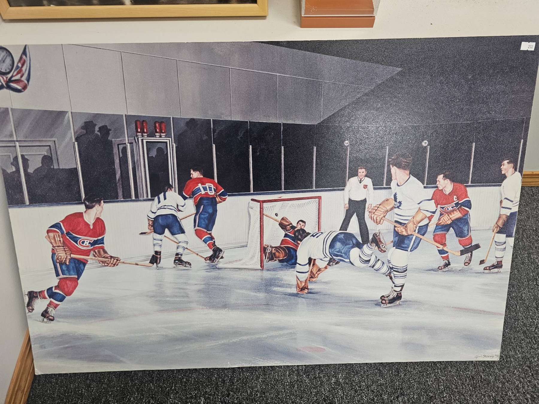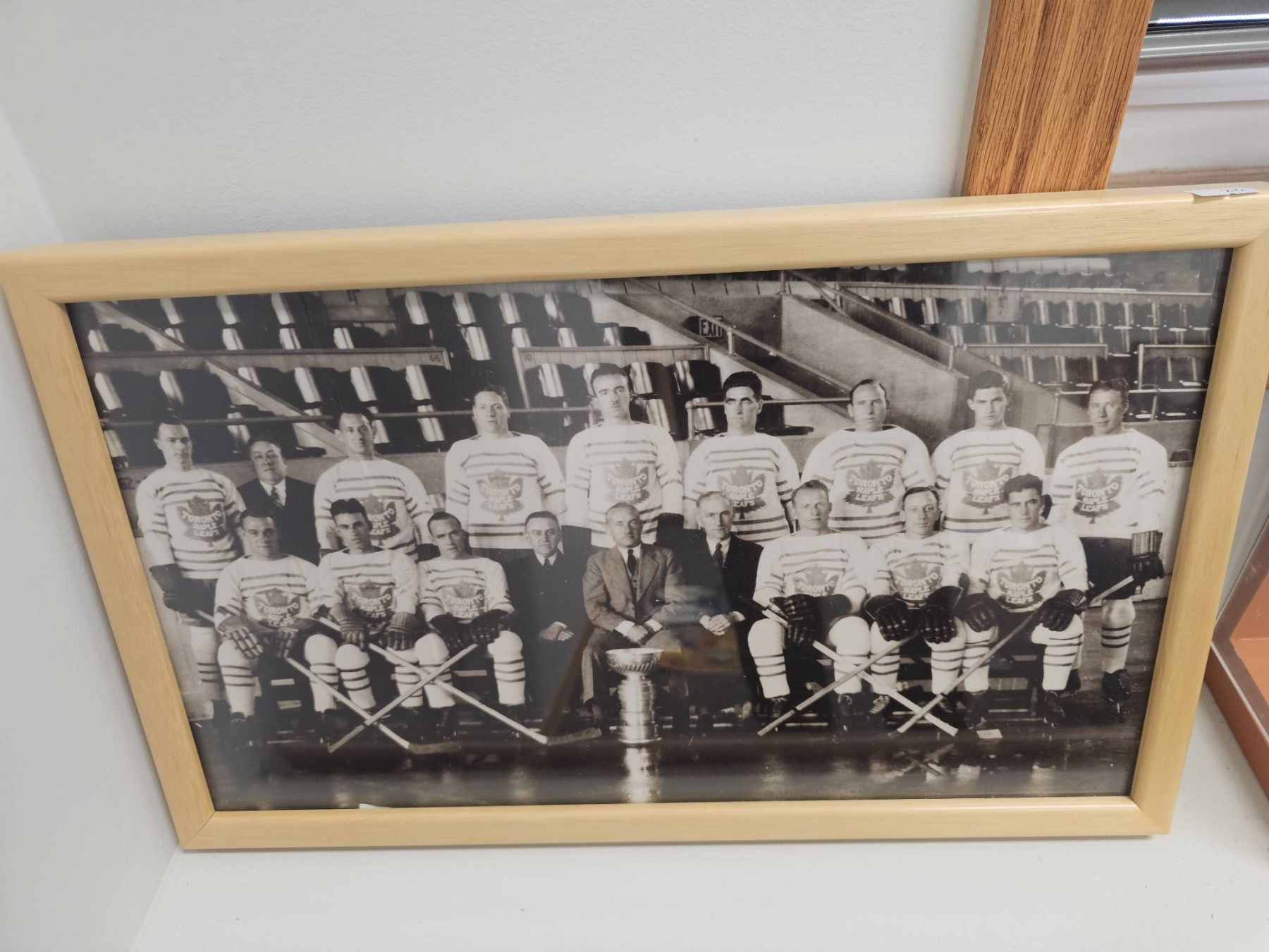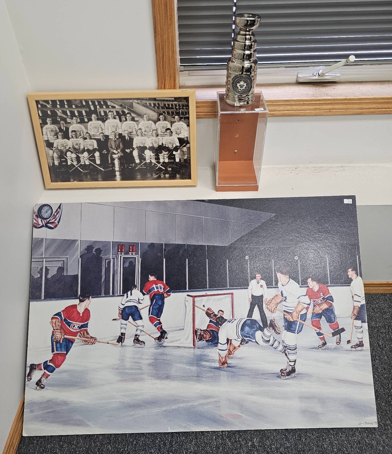 This collection includes a 36x24 hockey canvas artwork capturing an on-ice action scene, a Stanley Cup-style trophy replica, and a framed black-and-white historical team photograph. Perfect for sports enthusiasts and collectors of hockey memorabilia, this set brings a mix of art and history to any space.
