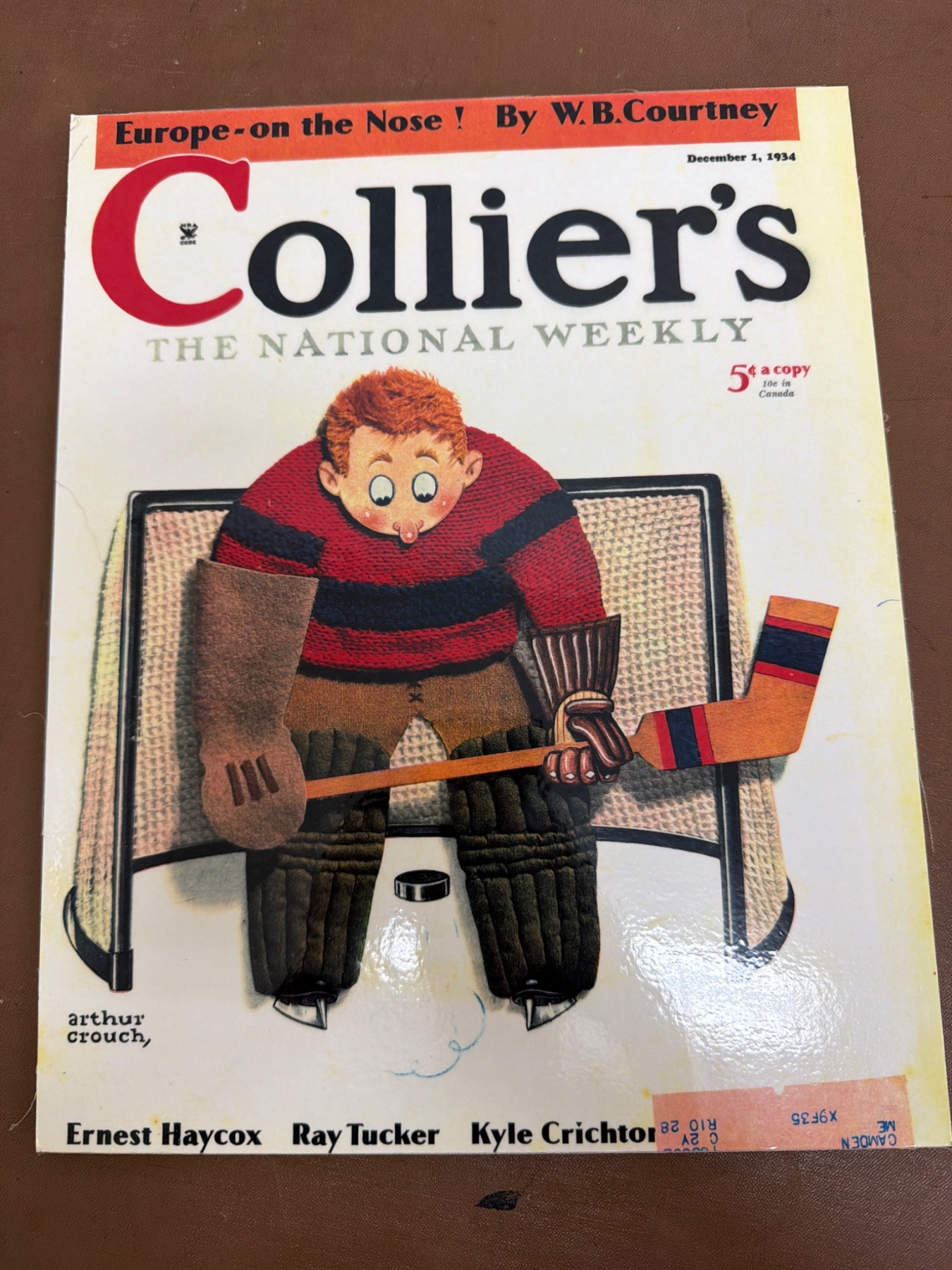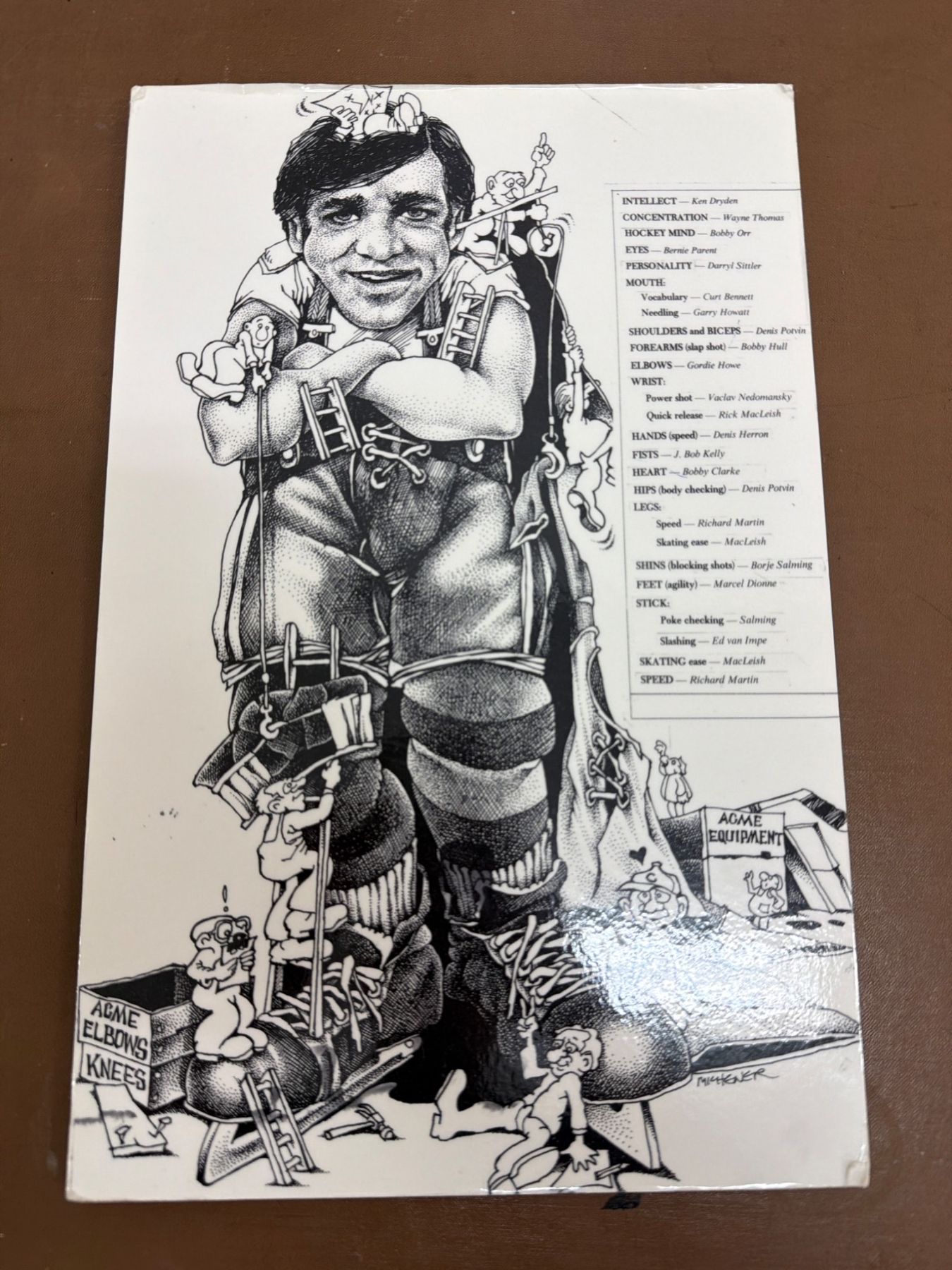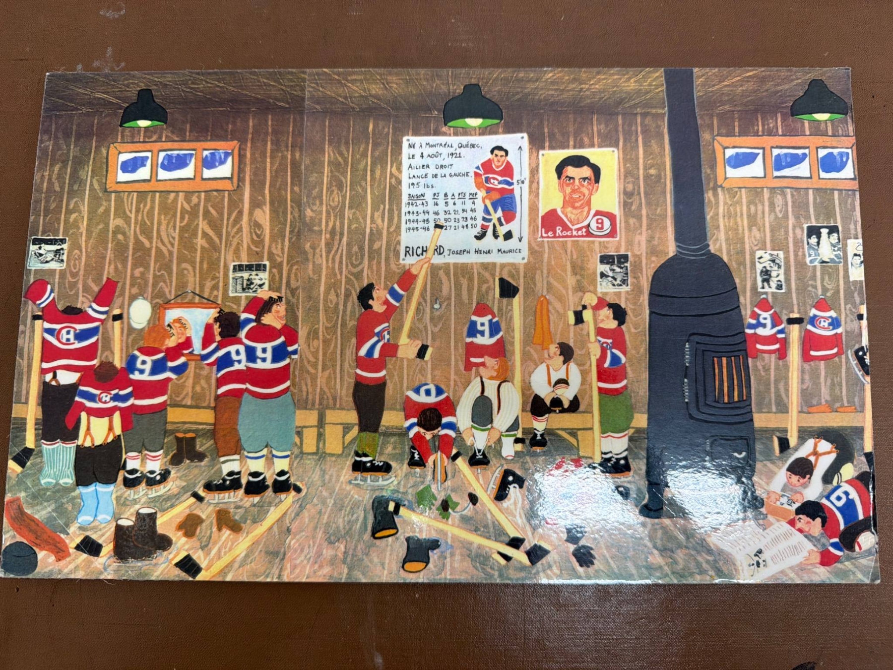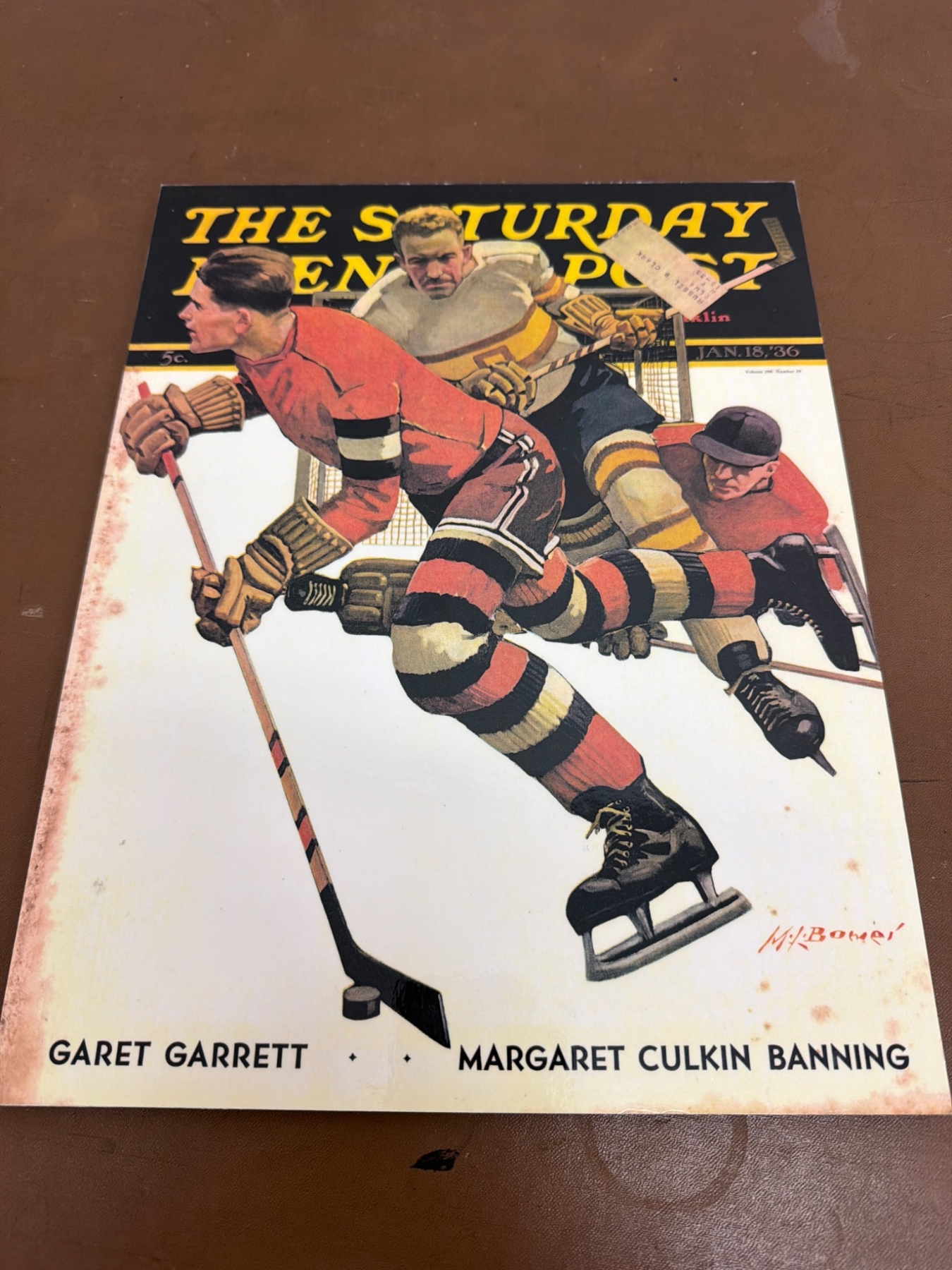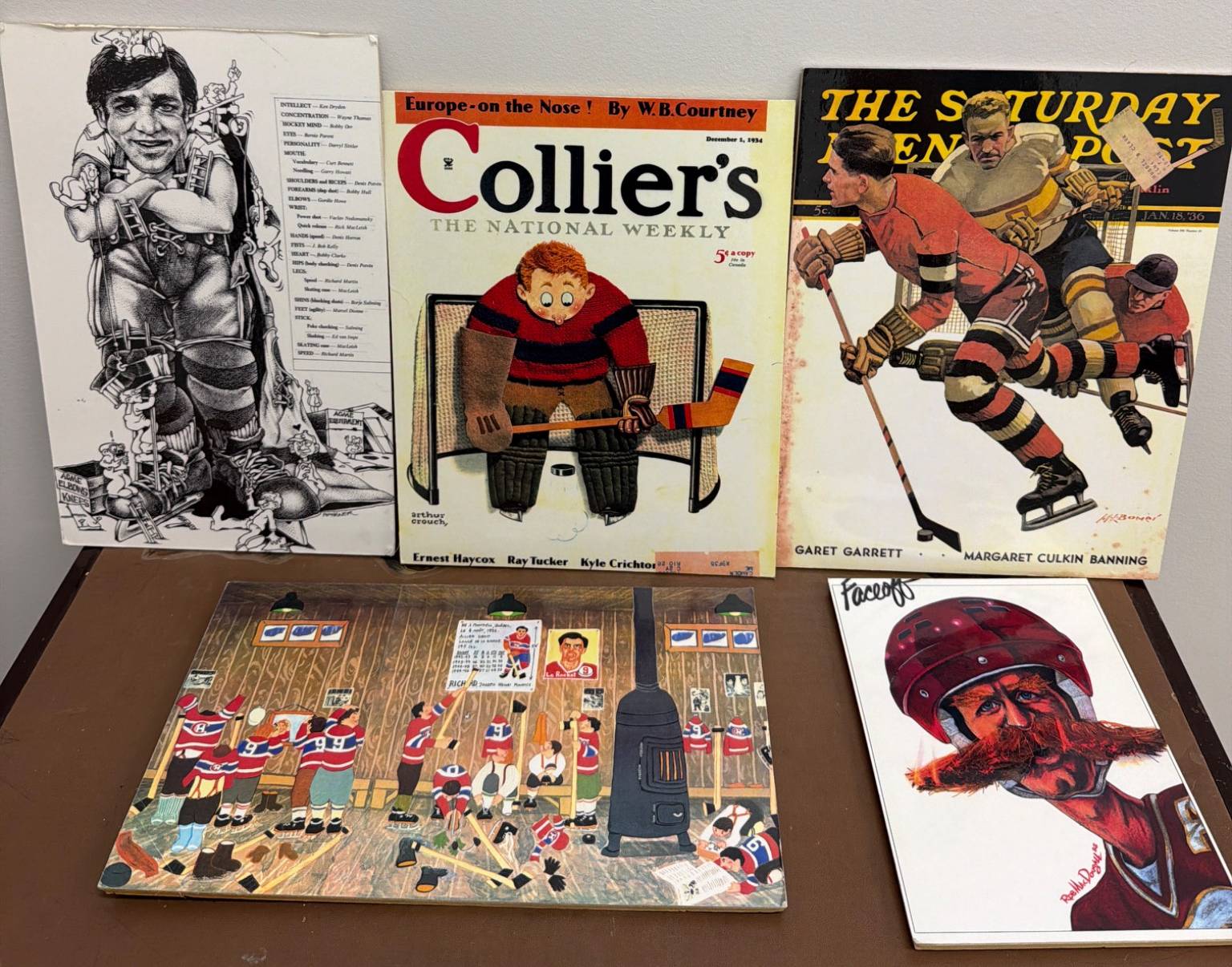 A variety of hockey-inspired prints and magazines. This includes two publications: a copy of "Collier's" and "The Saturday Evening Post," both with hockey-themed covers; a stylized caricature sketch titled "The Million Dollar Player" by Ted Michener; prints of locker room illustrations and a vibrant piece titled "Faceoff" with bold colors. Items show minor wear consistent with age.