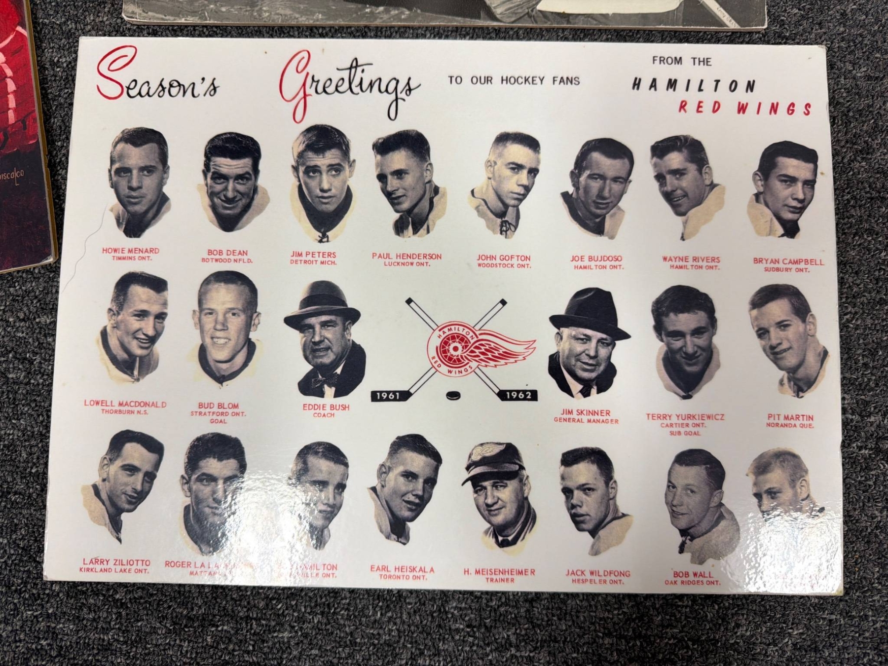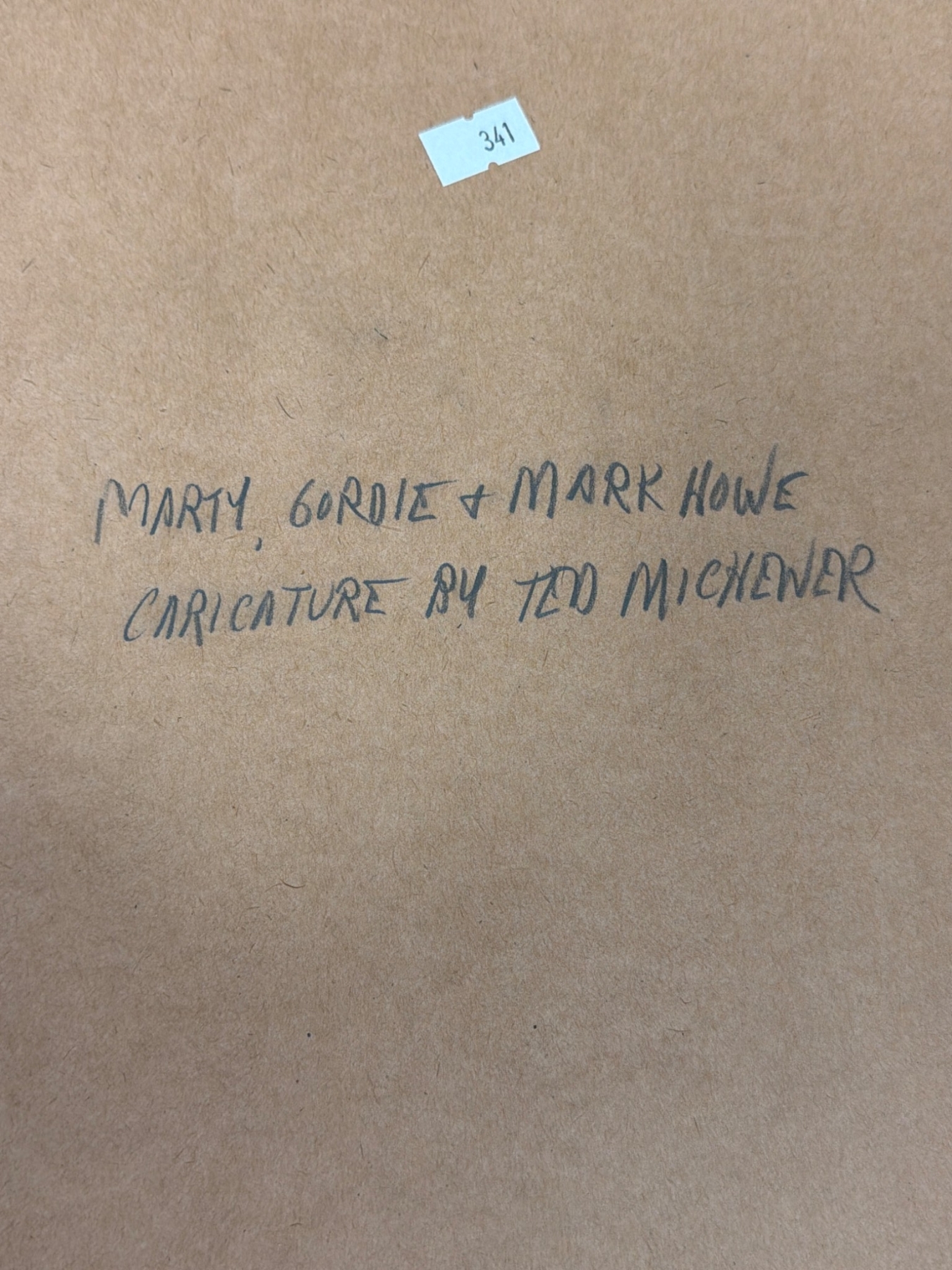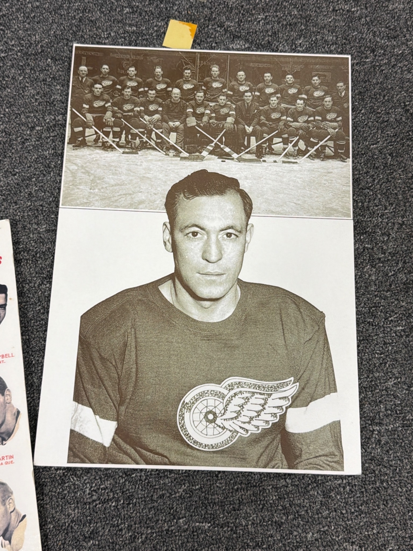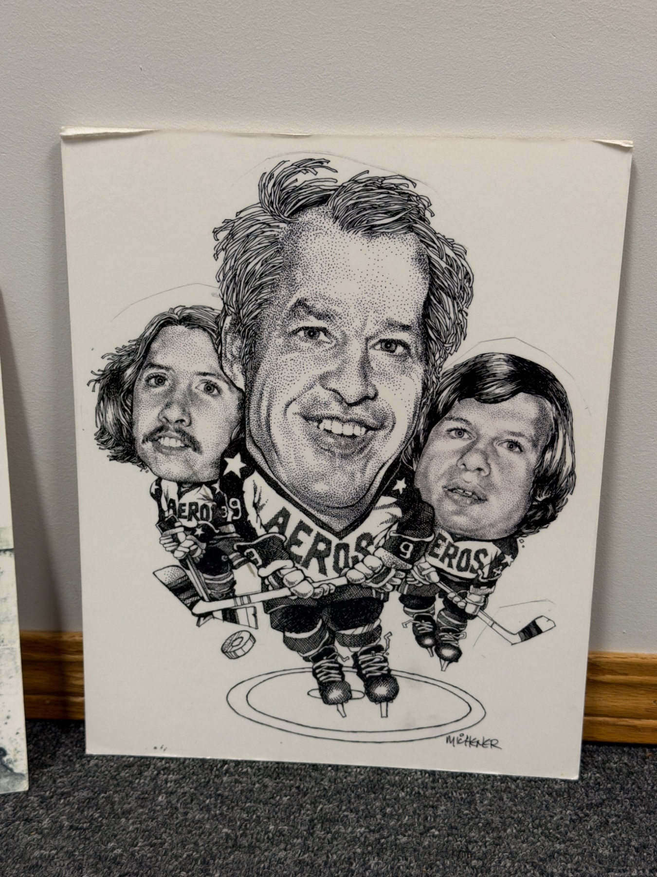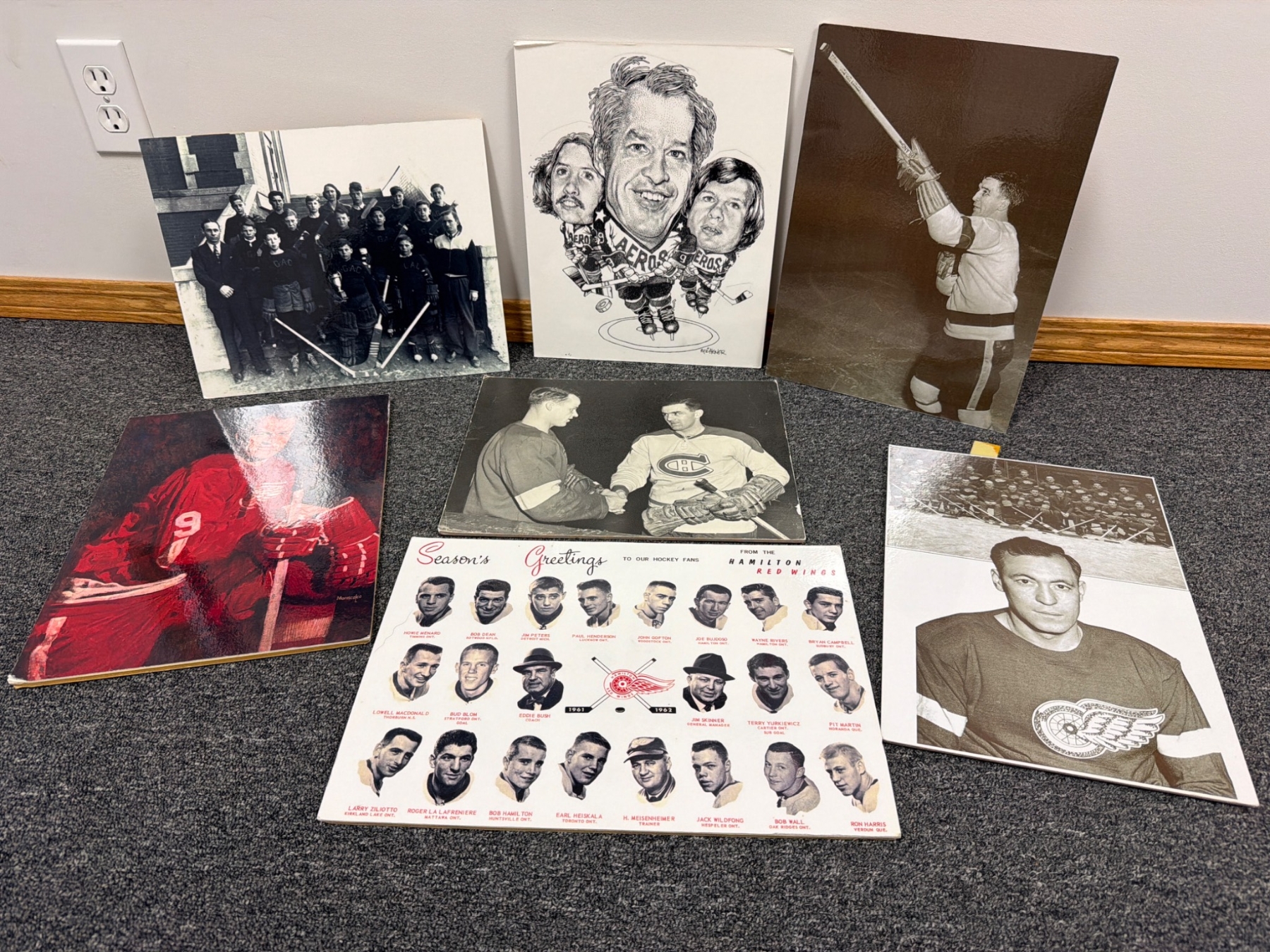 A diverse collection of hockey-themed prints and memorability, including portraits, caricatures, and team group images. Highlights include a seasonal greeting card featuring the Hamilton Red Wings team, a caricature of Marty, Gordie, & Mark Howe by Ted Michener, and a historic photo depicting hockey legends Maurice 'Rocket' Richard and Gordie Howe. Condition varies across pieces, with rich nostalgic value for hockey enthusiasts.
