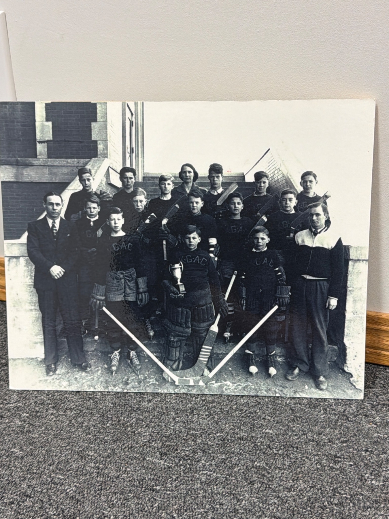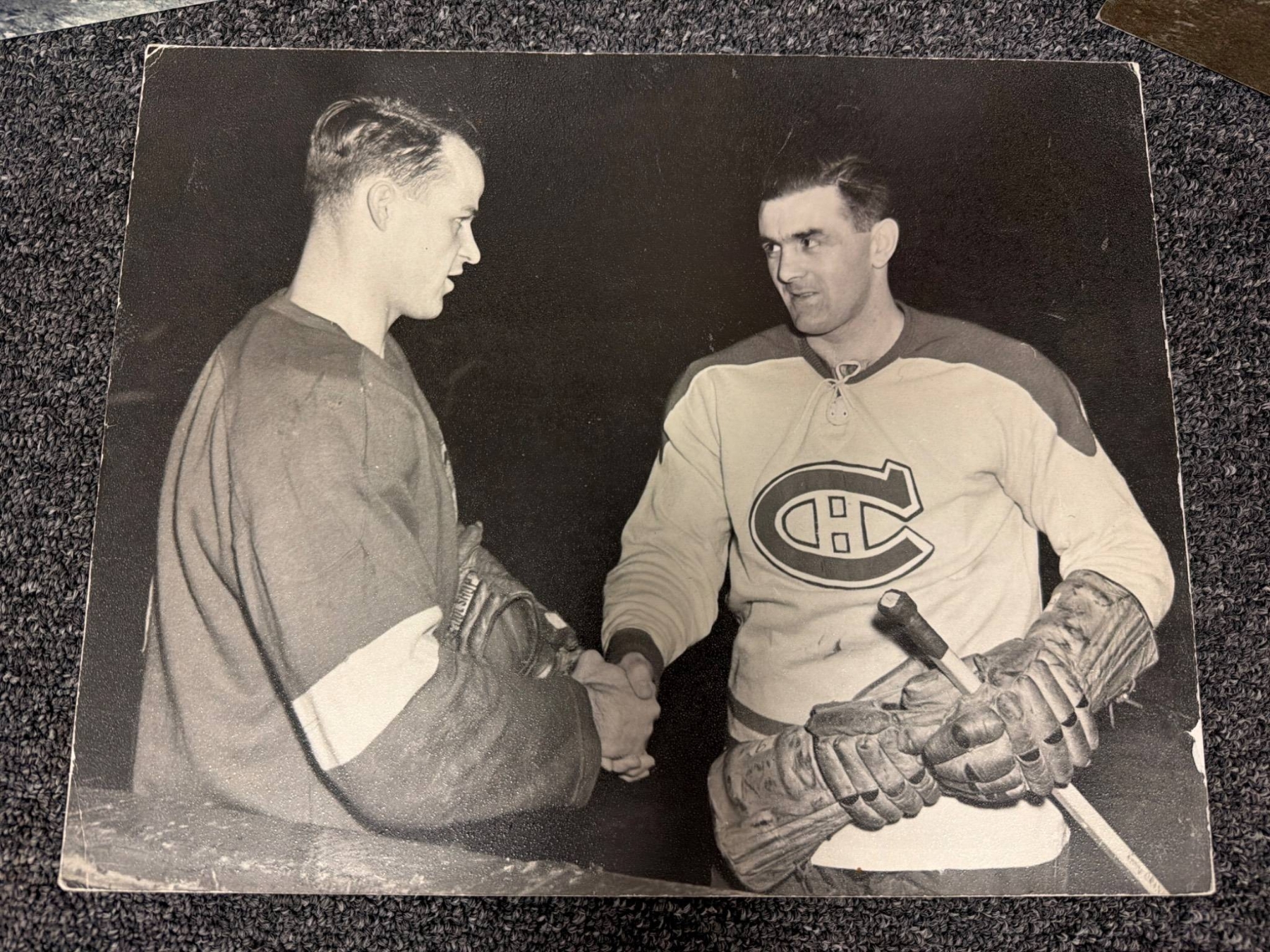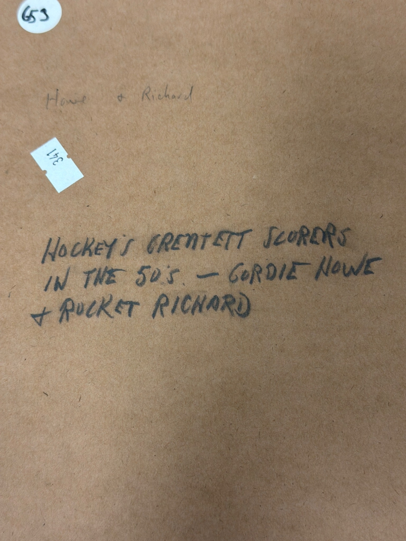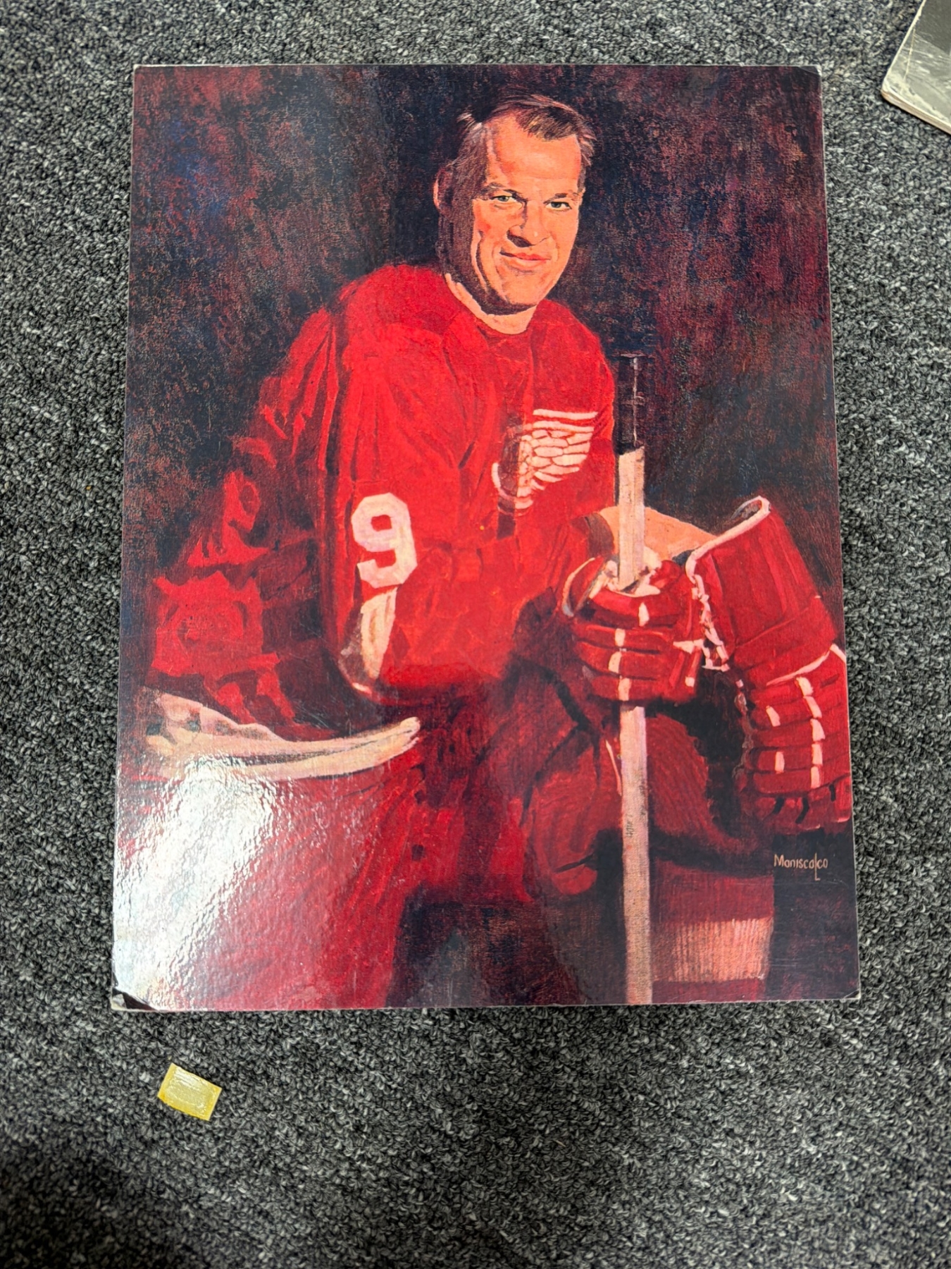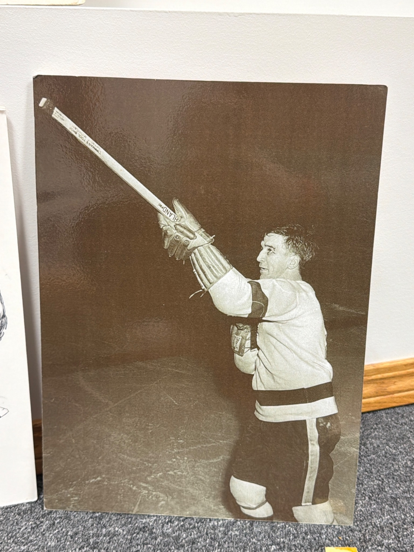 A diverse collection of hockey-themed prints and memorability, including portraits, caricatures, and team group images. Highlights include a seasonal greeting card featuring the Hamilton Red Wings team, a caricature of Marty, Gordie, & Mark Howe by Ted Michener, and a historic photo depicting hockey legends Maurice 'Rocket' Richard and Gordie Howe. Condition varies across pieces, with rich nostalgic value for hockey enthusiasts.