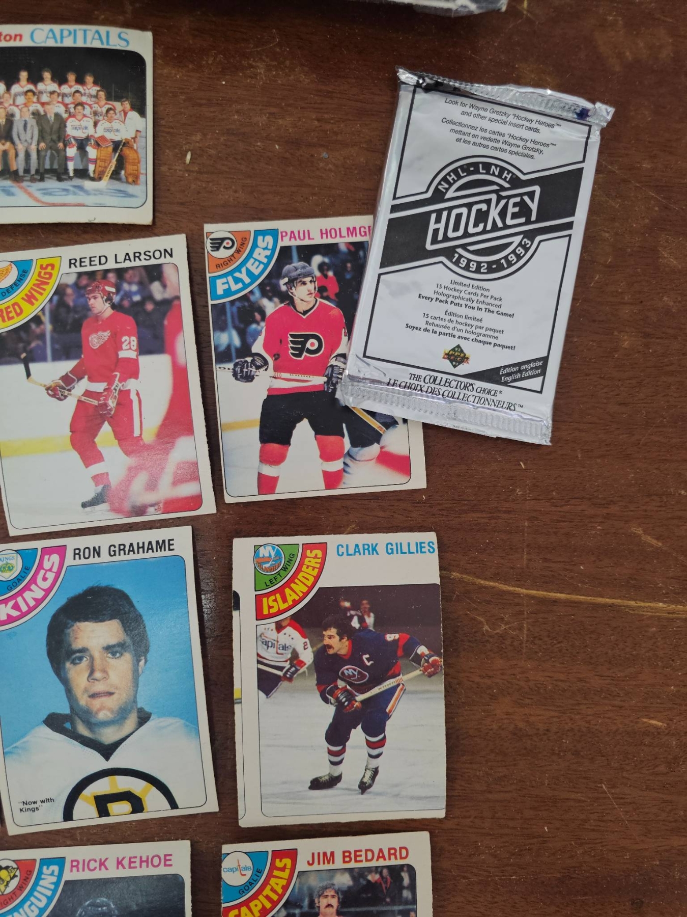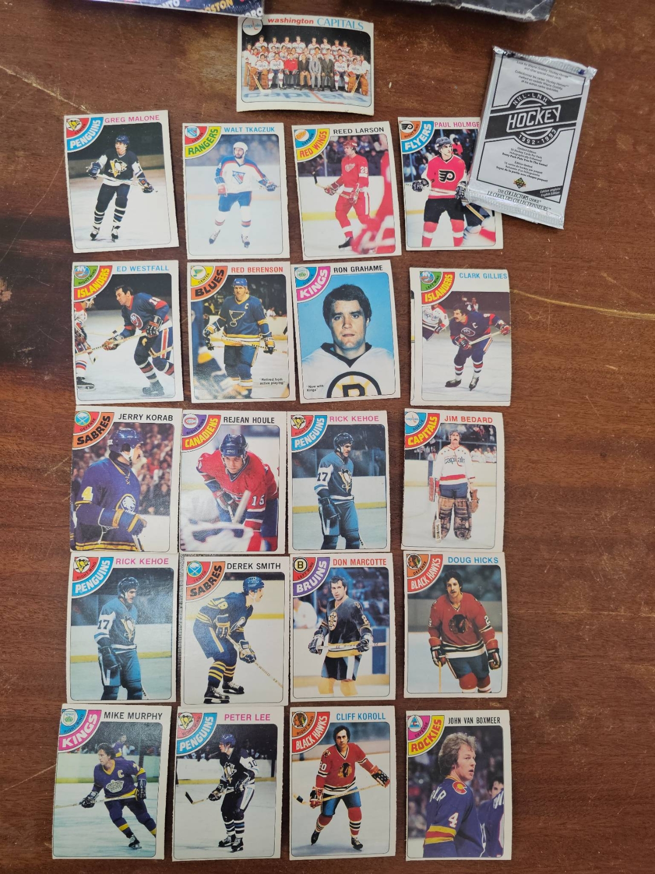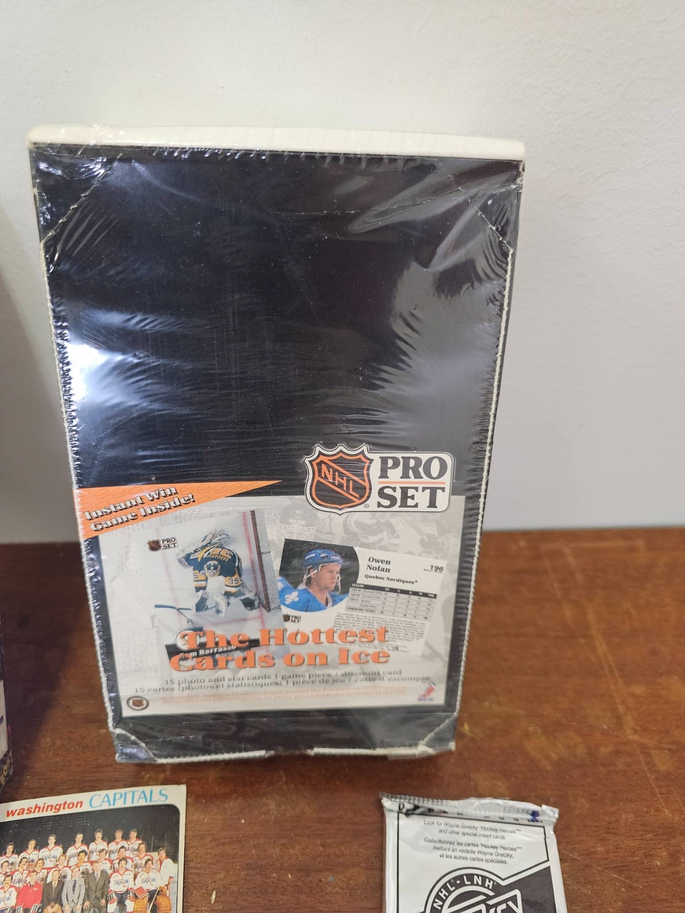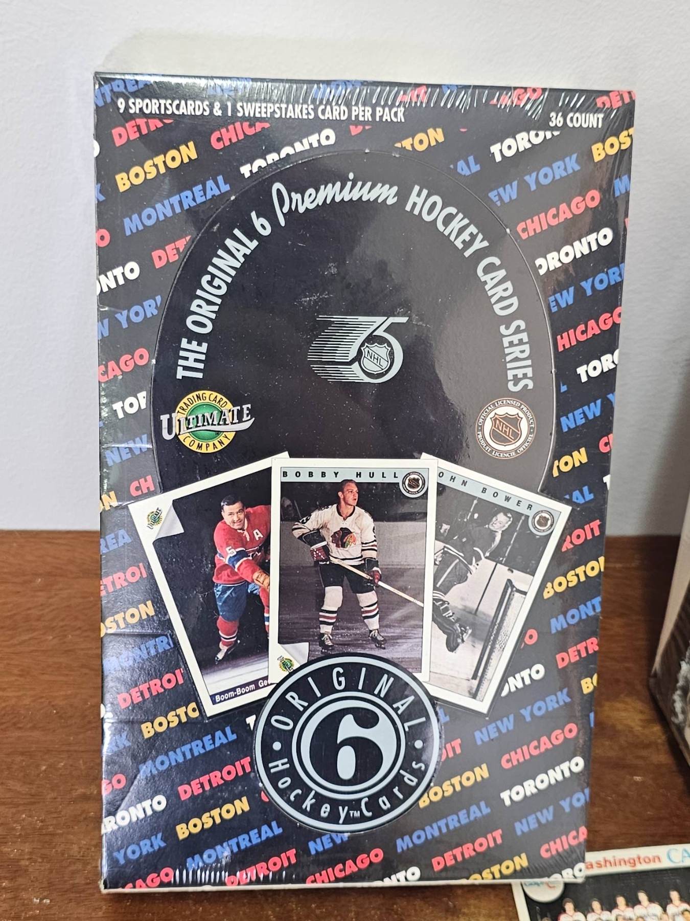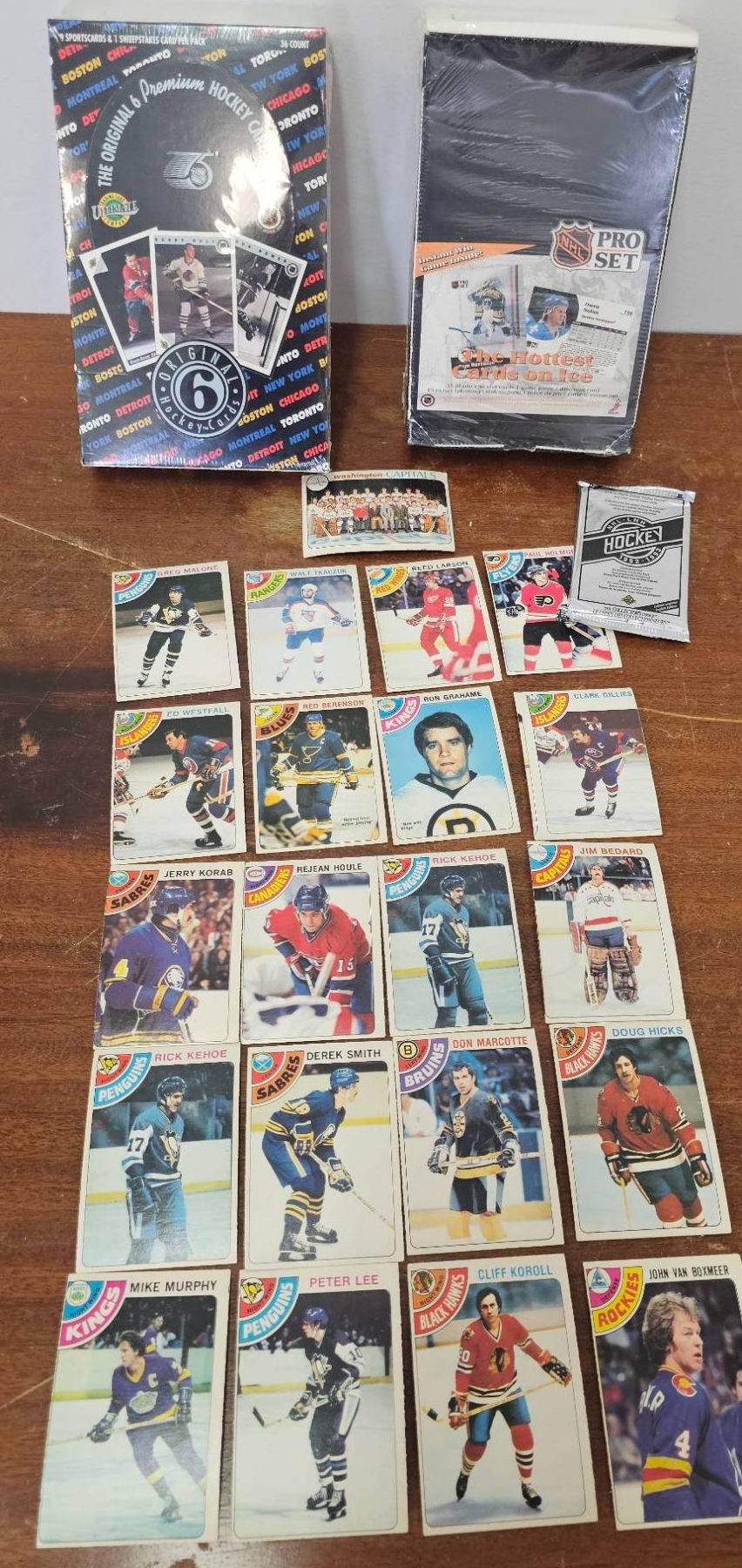 Hockey trading cards that includes two factory-sealed boxes: 'The Original 6 Premium Hockey Card Series' by Ultimate and 'Pro Set NHL Hockey'. Also included are 20 loose cards featuring players from various teams, as well as one unopened foil pack labeled 'Hockey Legends 1990 Edition'. Condition varies across the collection. A great variety for hockey enthusiasts or collectors.