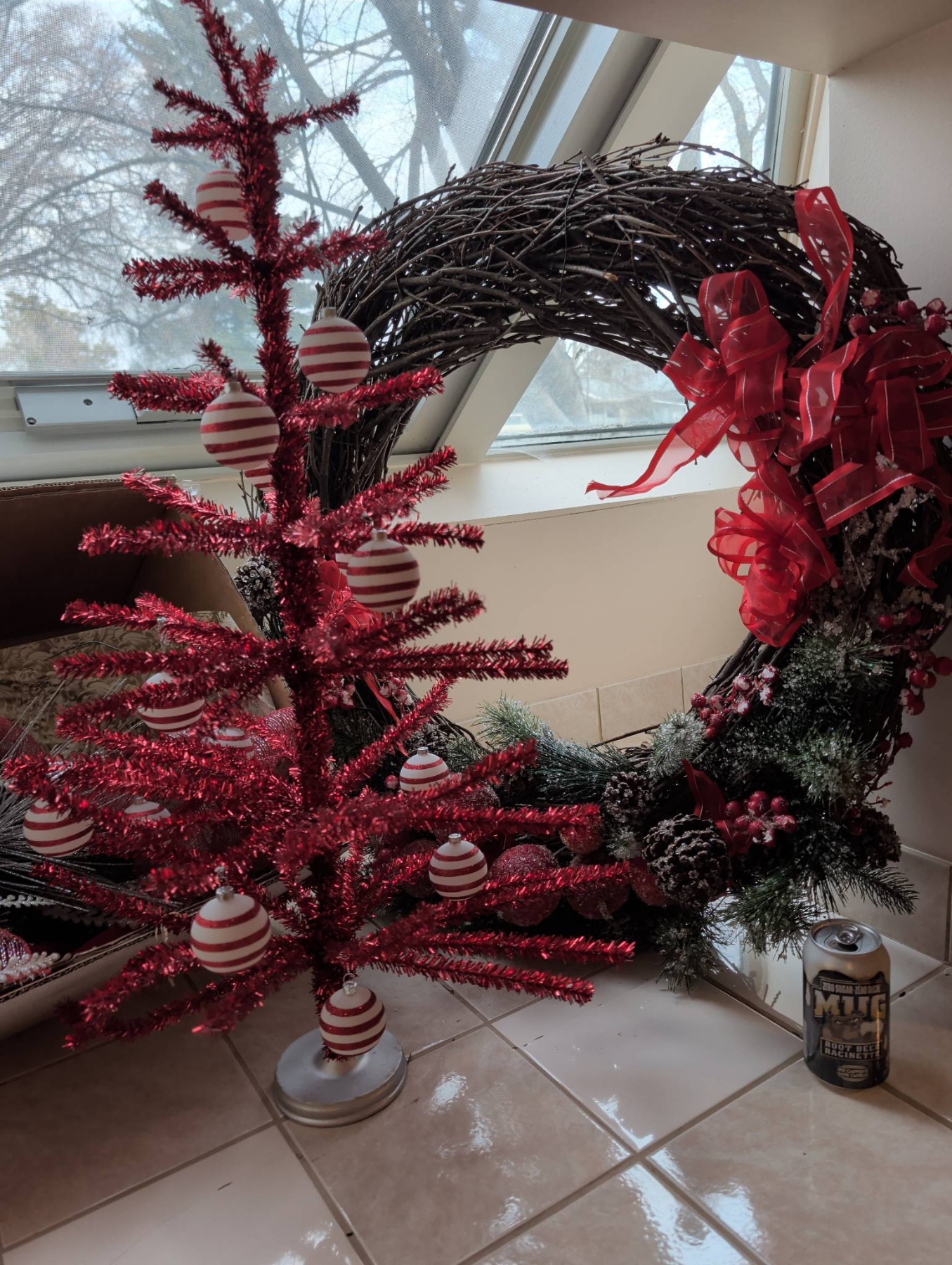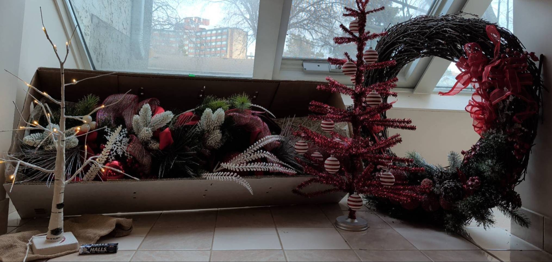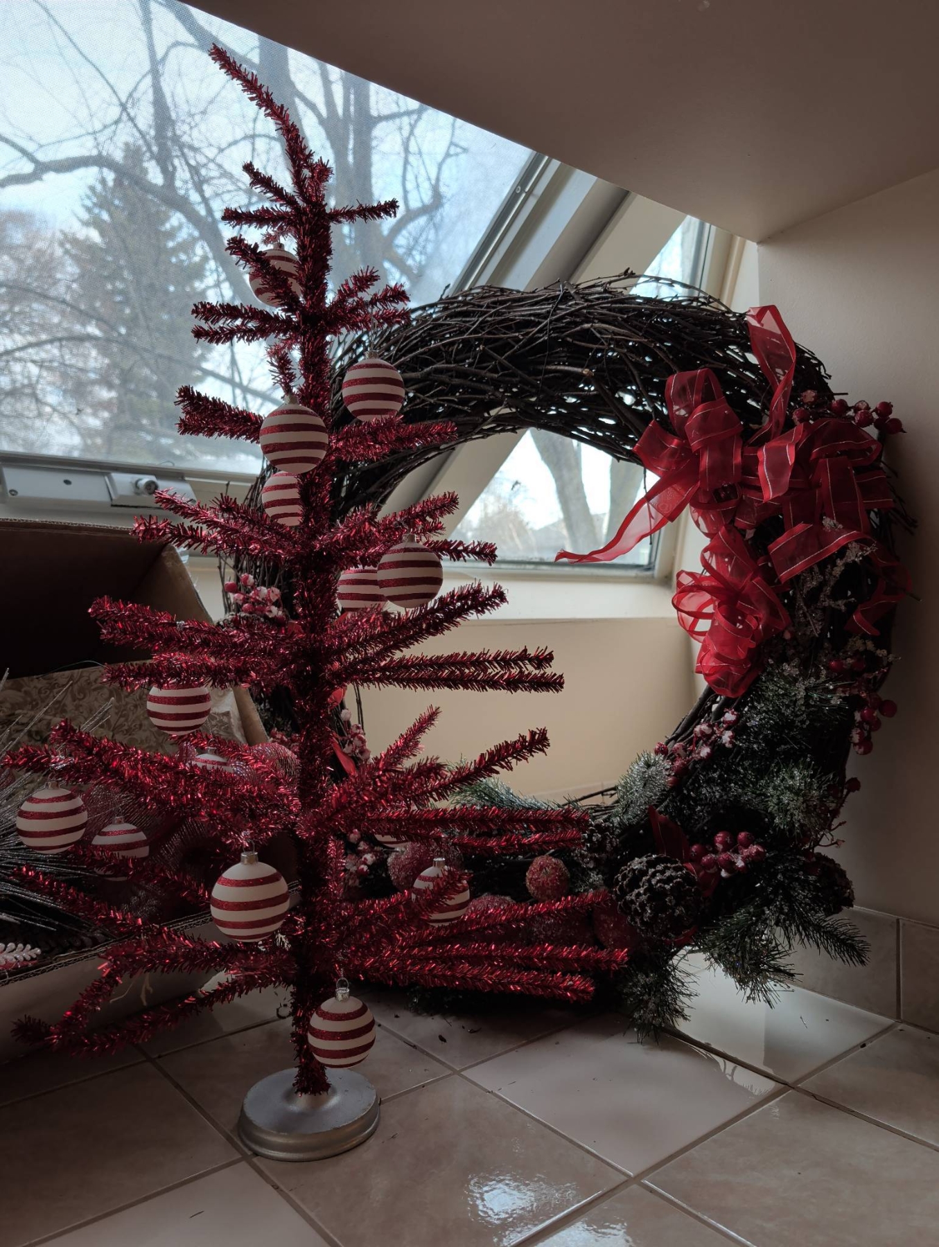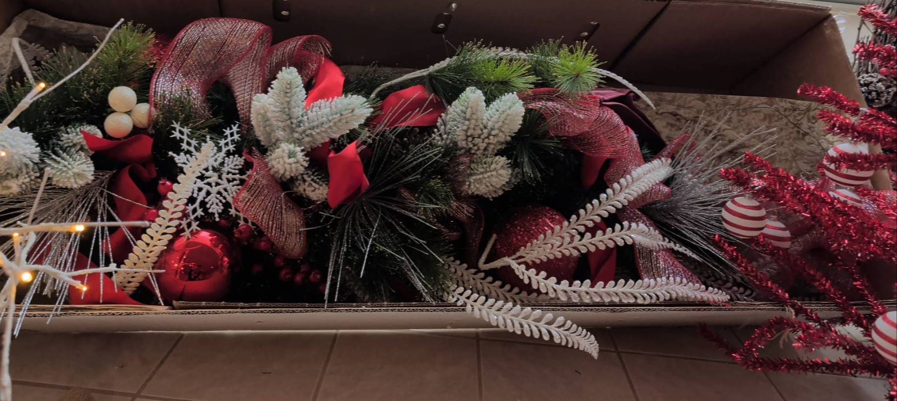 Holiday decor featuring a large decorated wreath (approx. 3′ diameter), a bright red tinsel tree with striped ornaments (approx. 2.5′-3′ tall), and a small lighted birch-style tree (approx. 2′ tall). Includes additional greenery with red and white ornaments, ribbons, and bows, alongside smaller wreaths with lights and large red bows. Ideal for festive displays.