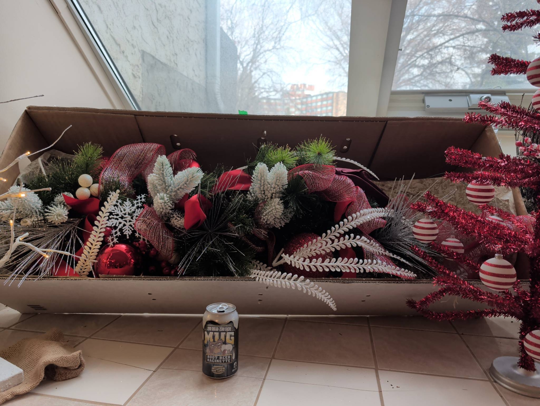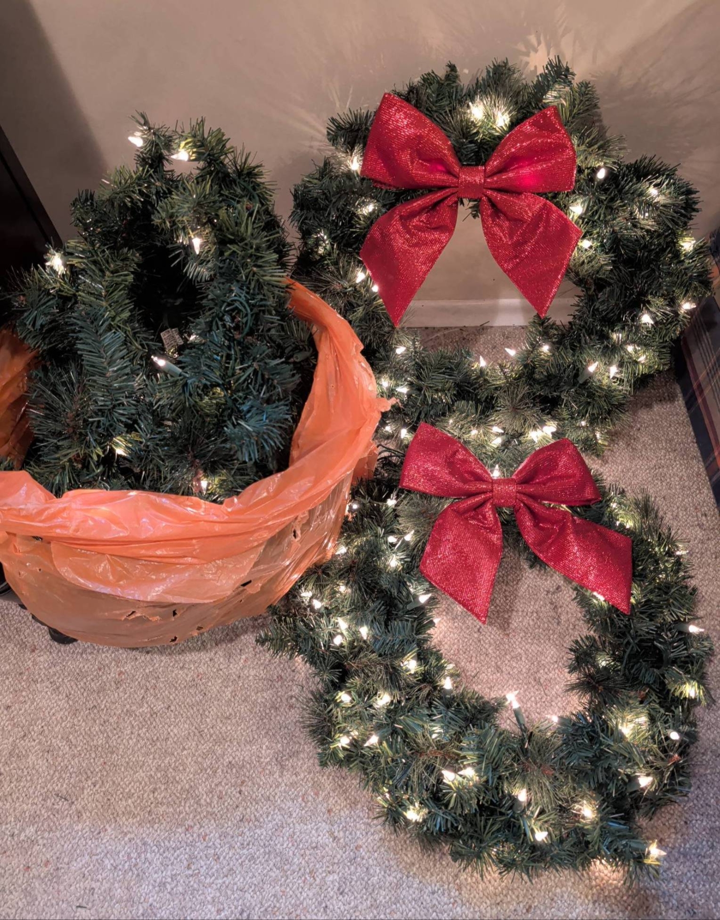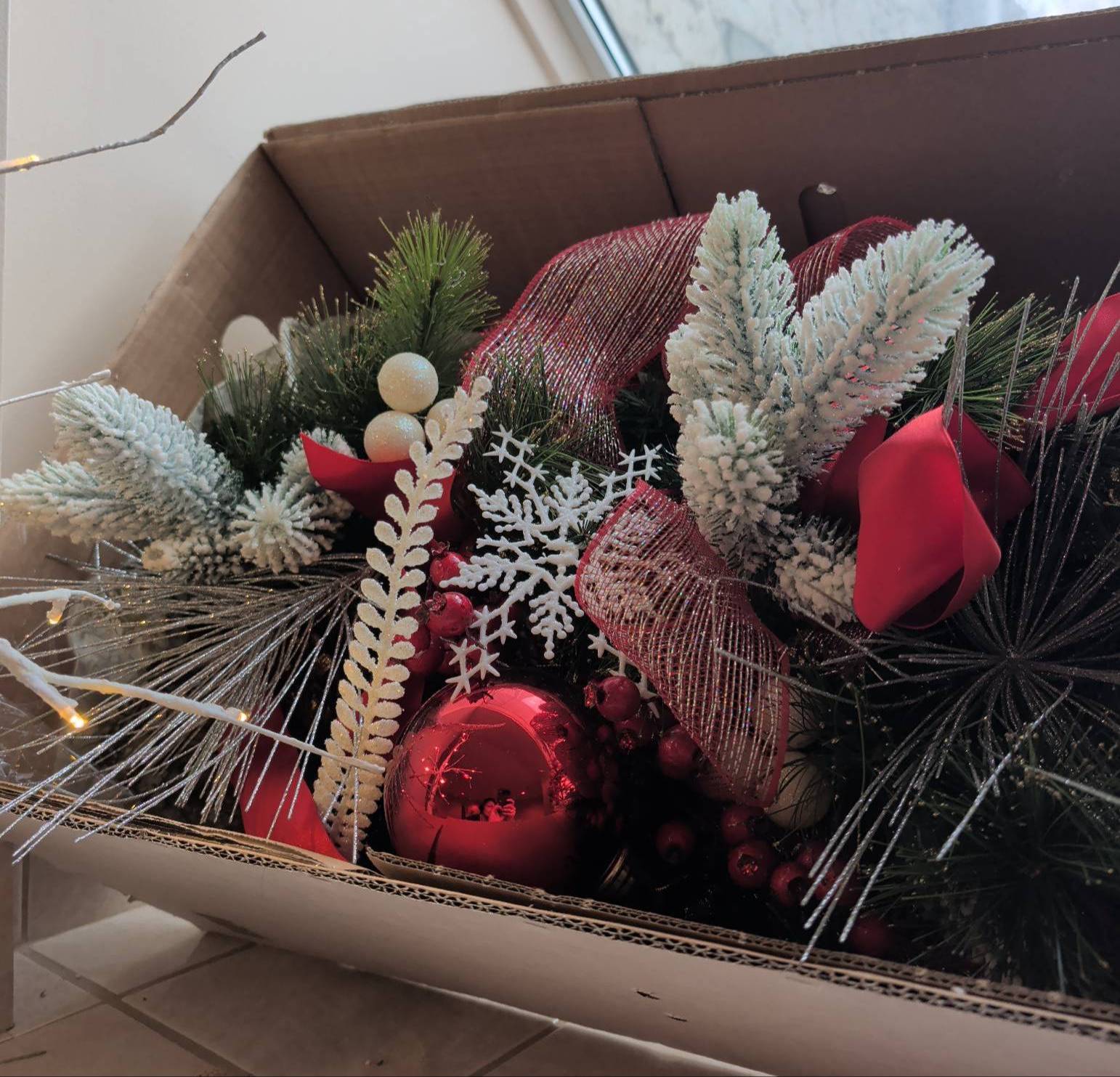 Holiday decor featuring a large decorated wreath (approx. 3′ diameter), a bright red tinsel tree with striped ornaments (approx. 2.5′-3′ tall), and a small lighted birch-style tree (approx. 2′ tall). Includes additional greenery with red and white ornaments, ribbons, and bows, alongside smaller wreaths with lights and large red bows. Ideal for festive displays.