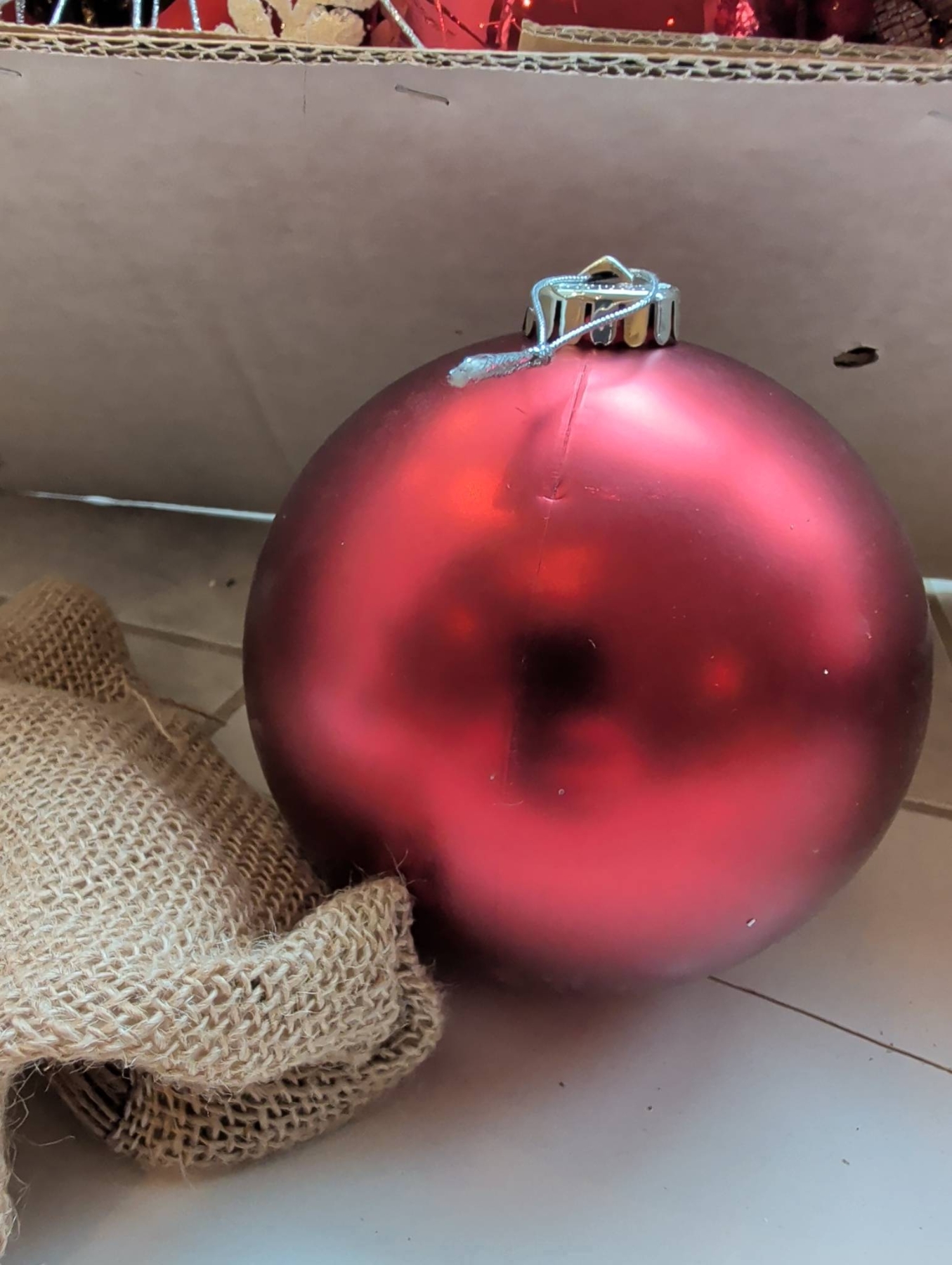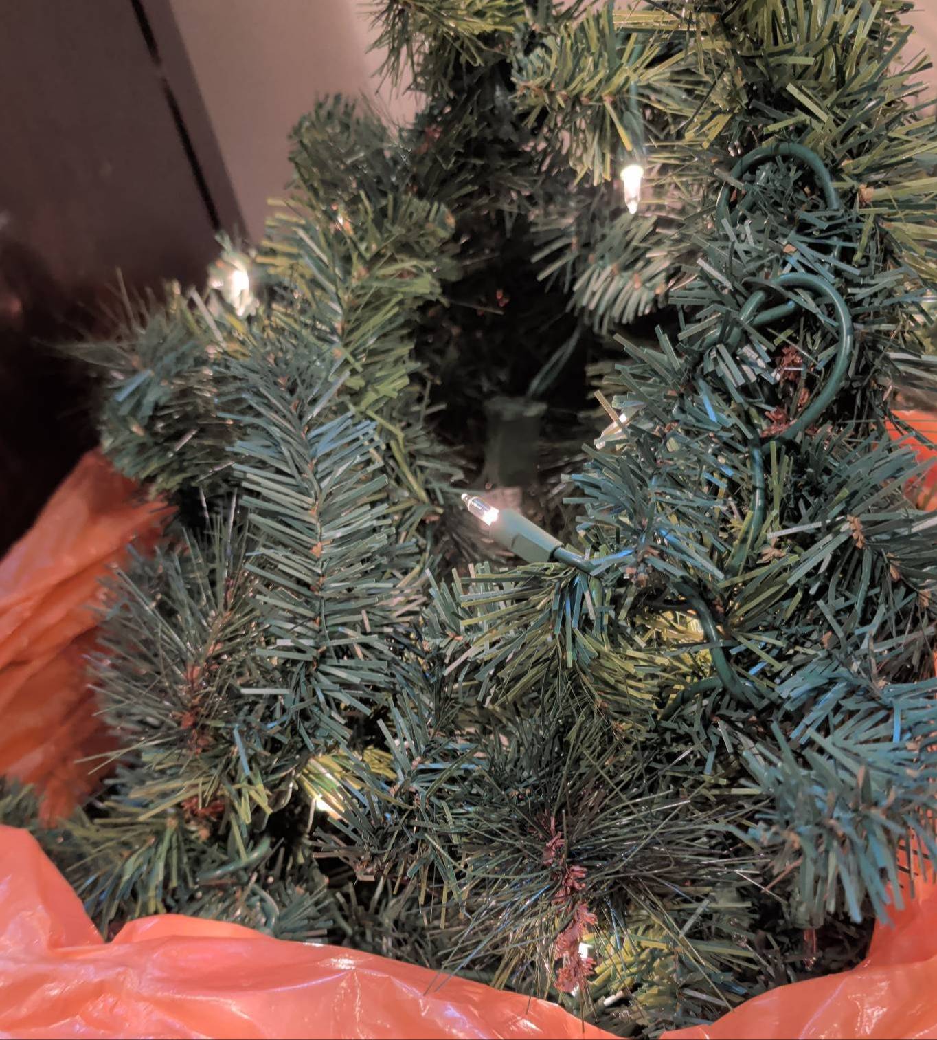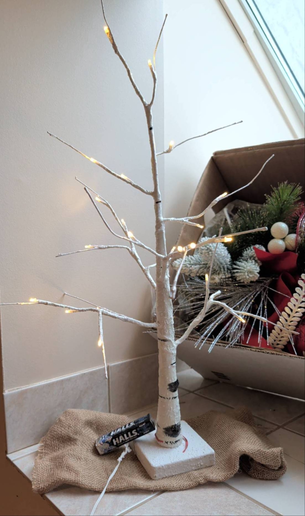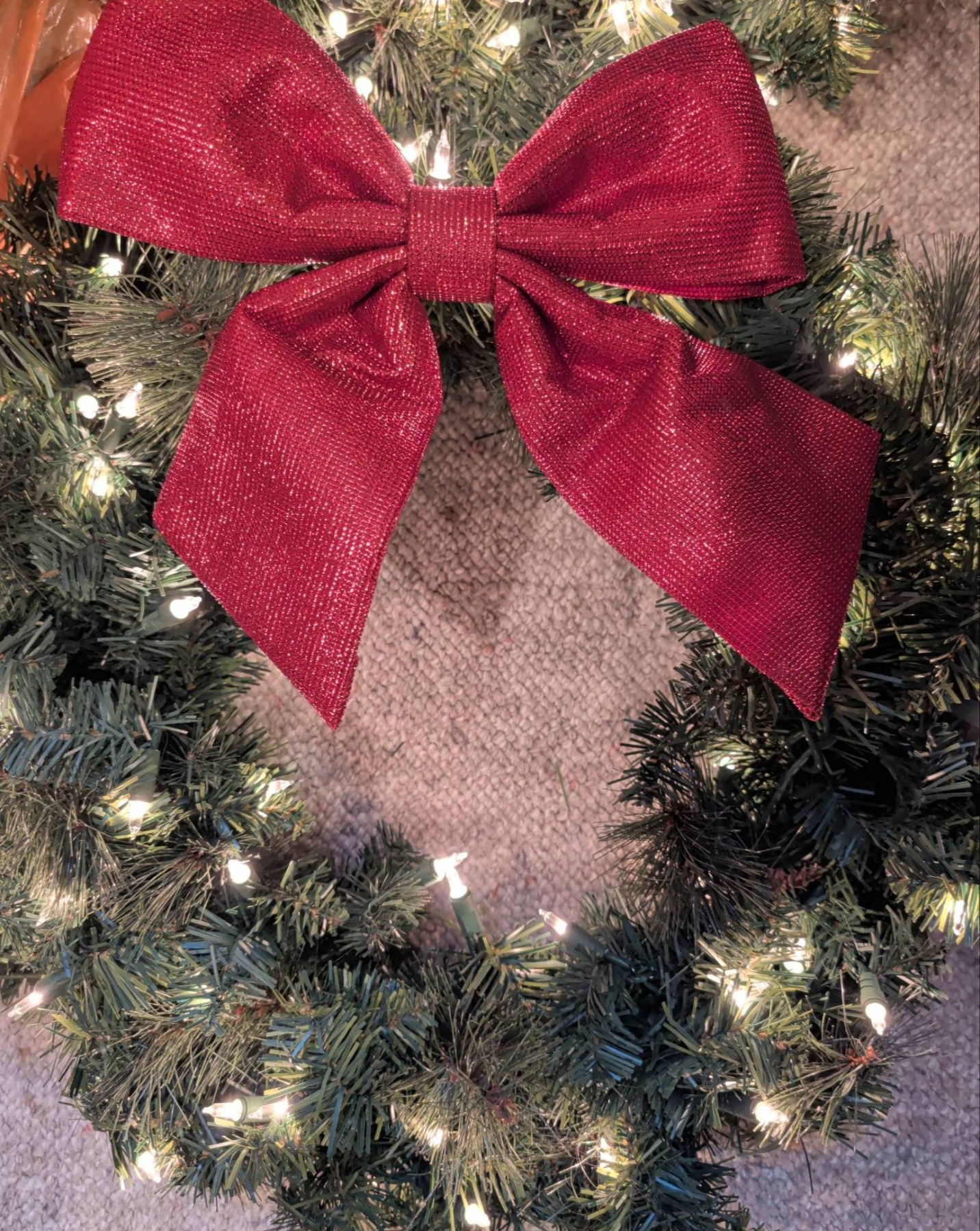 Holiday decor featuring a large decorated wreath (approx. 3′ diameter), a bright red tinsel tree with striped ornaments (approx. 2.5′-3′ tall), and a small lighted birch-style tree (approx. 2′ tall). Includes additional greenery with red and white ornaments, ribbons, and bows, alongside smaller wreaths with lights and large red bows. Ideal for festive displays.