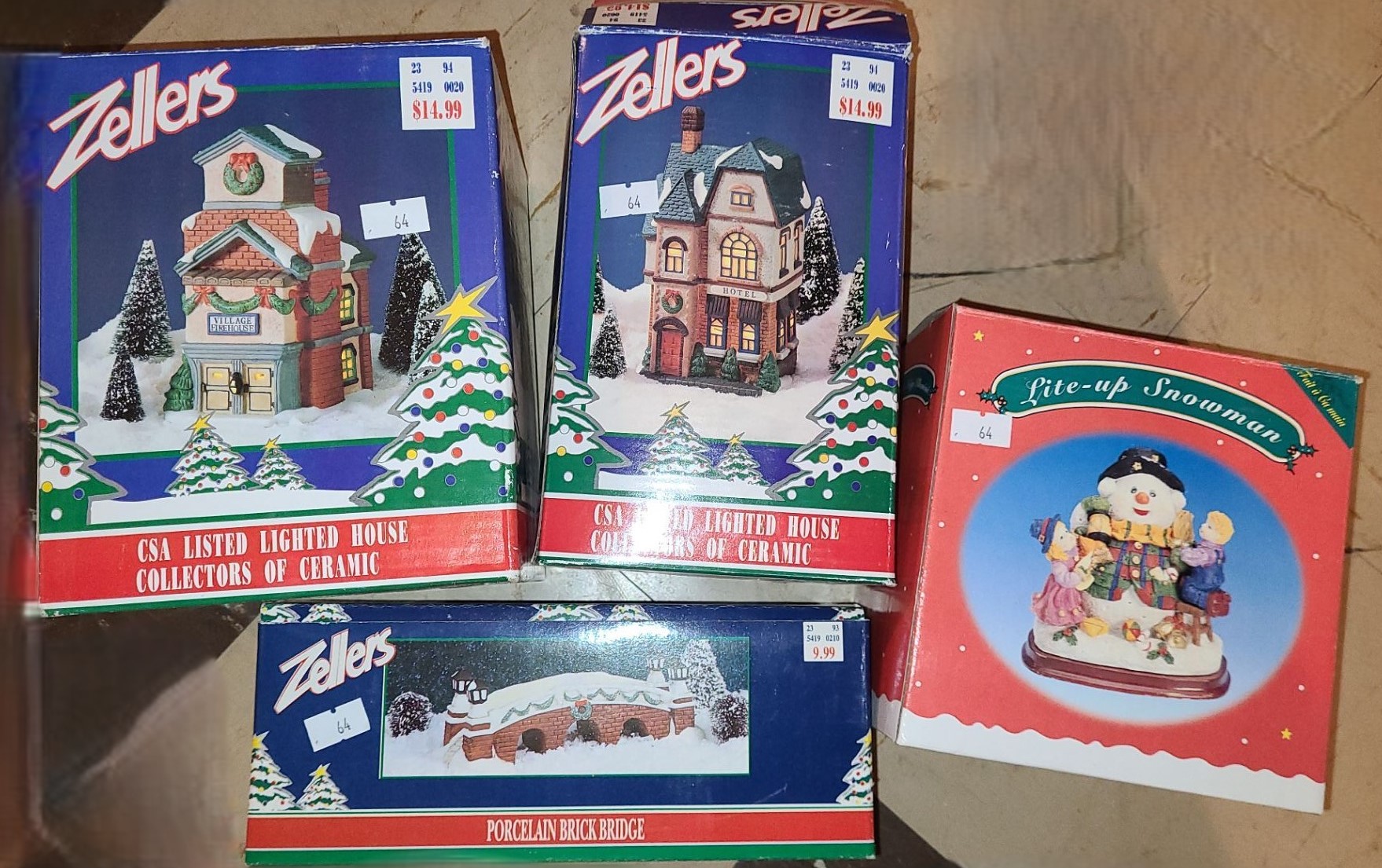 Holiday Decor by Zellers: 2 X Ceramic Lighted Houses and Porcelain Bridge; also Lite-Up Snowman