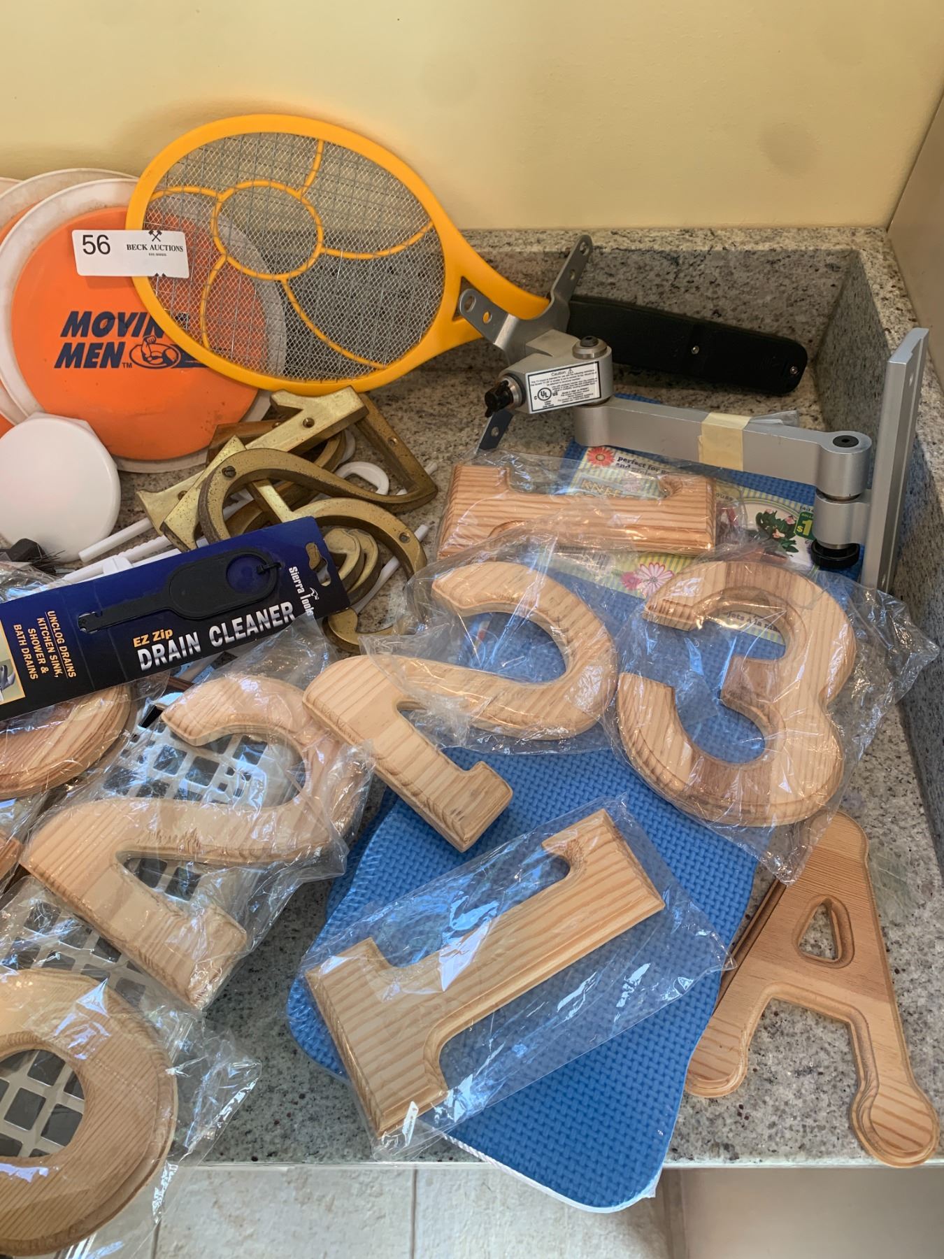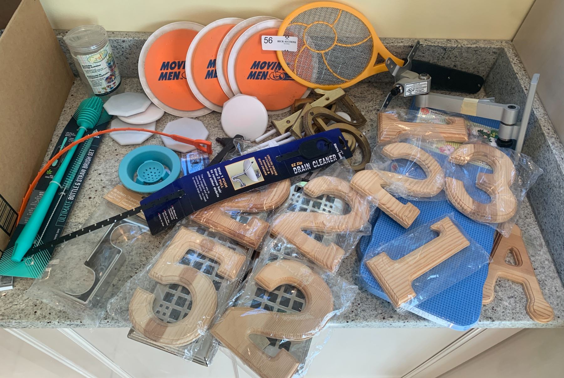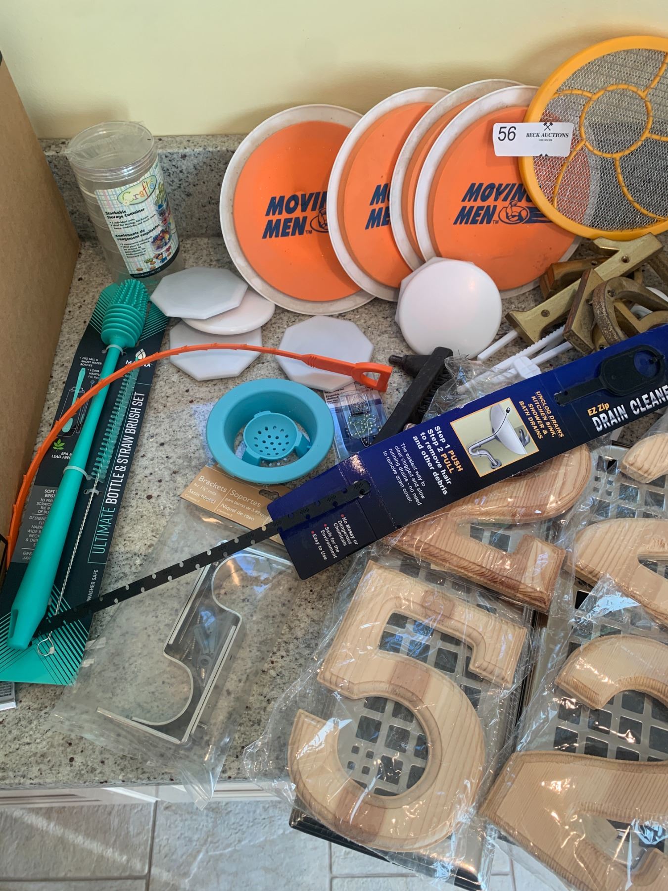 Home Cleaning and Improvement Lot. Includes bottle brush, drain snake, address numbers, furniture sliders, zapper fly swatter, and more!