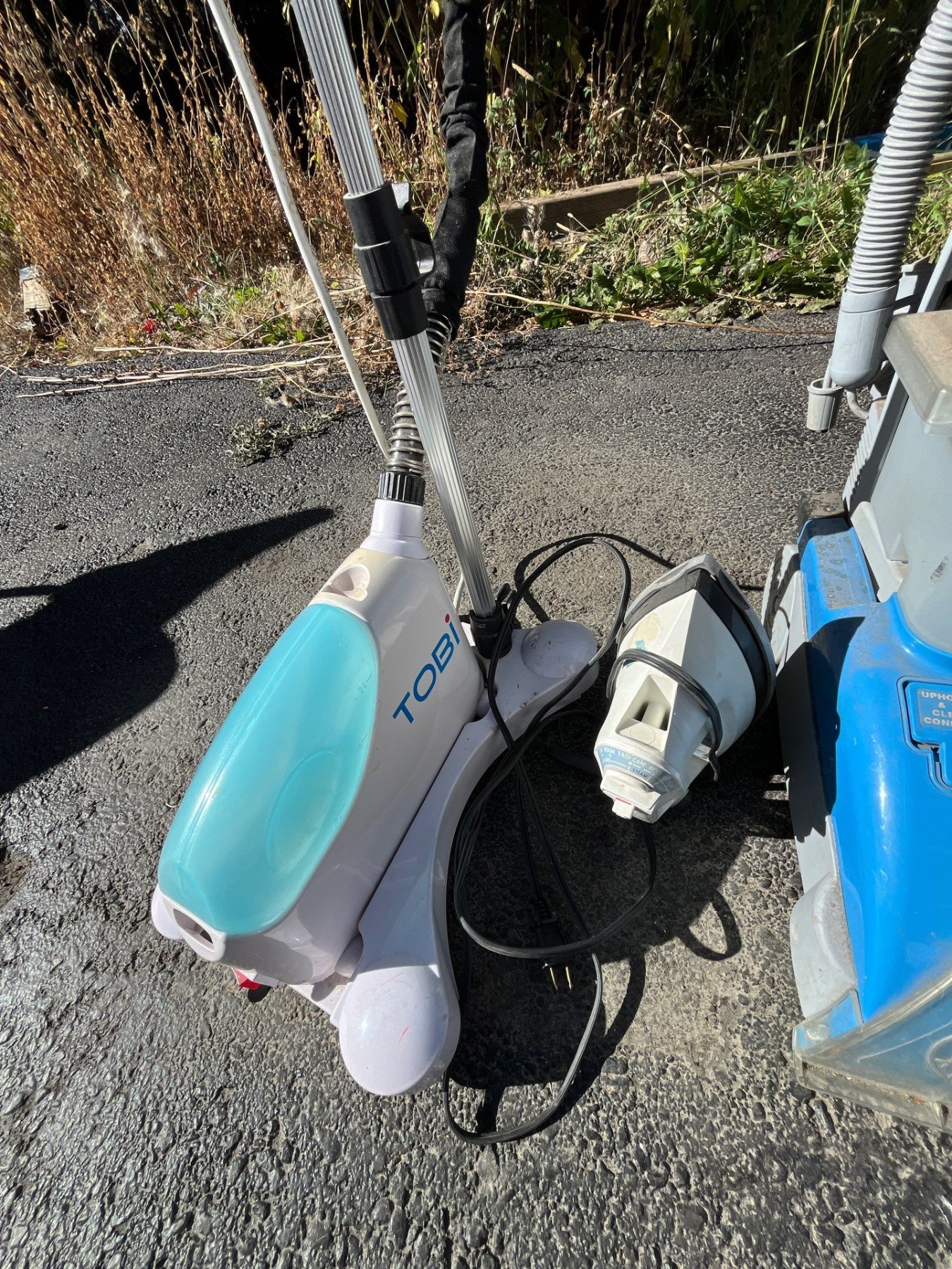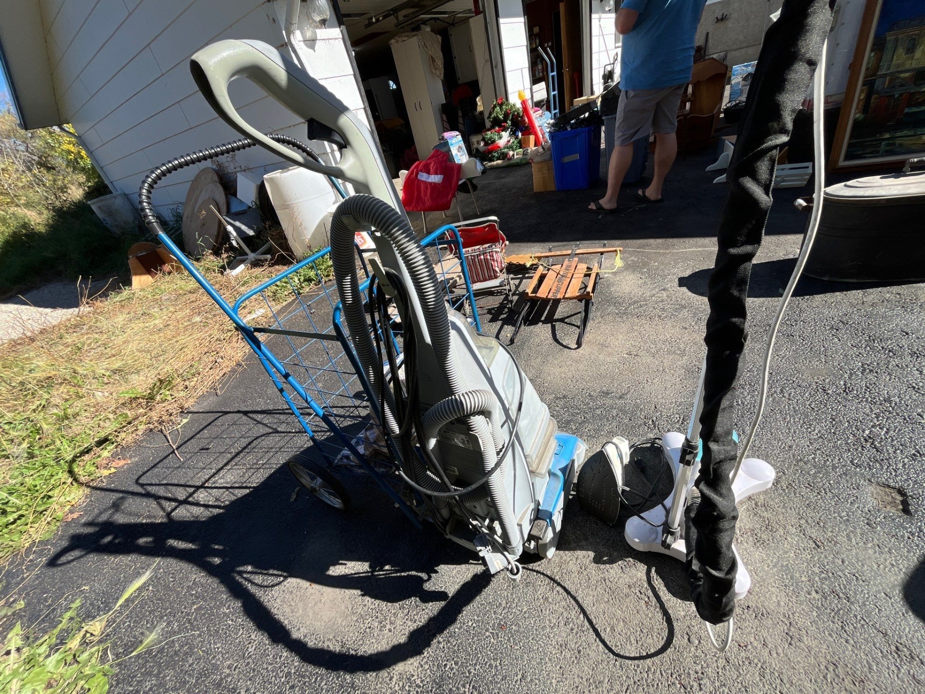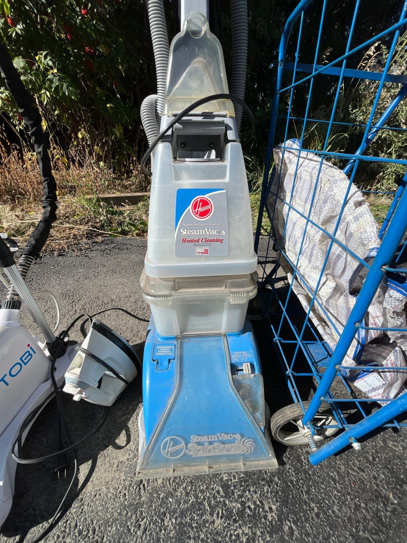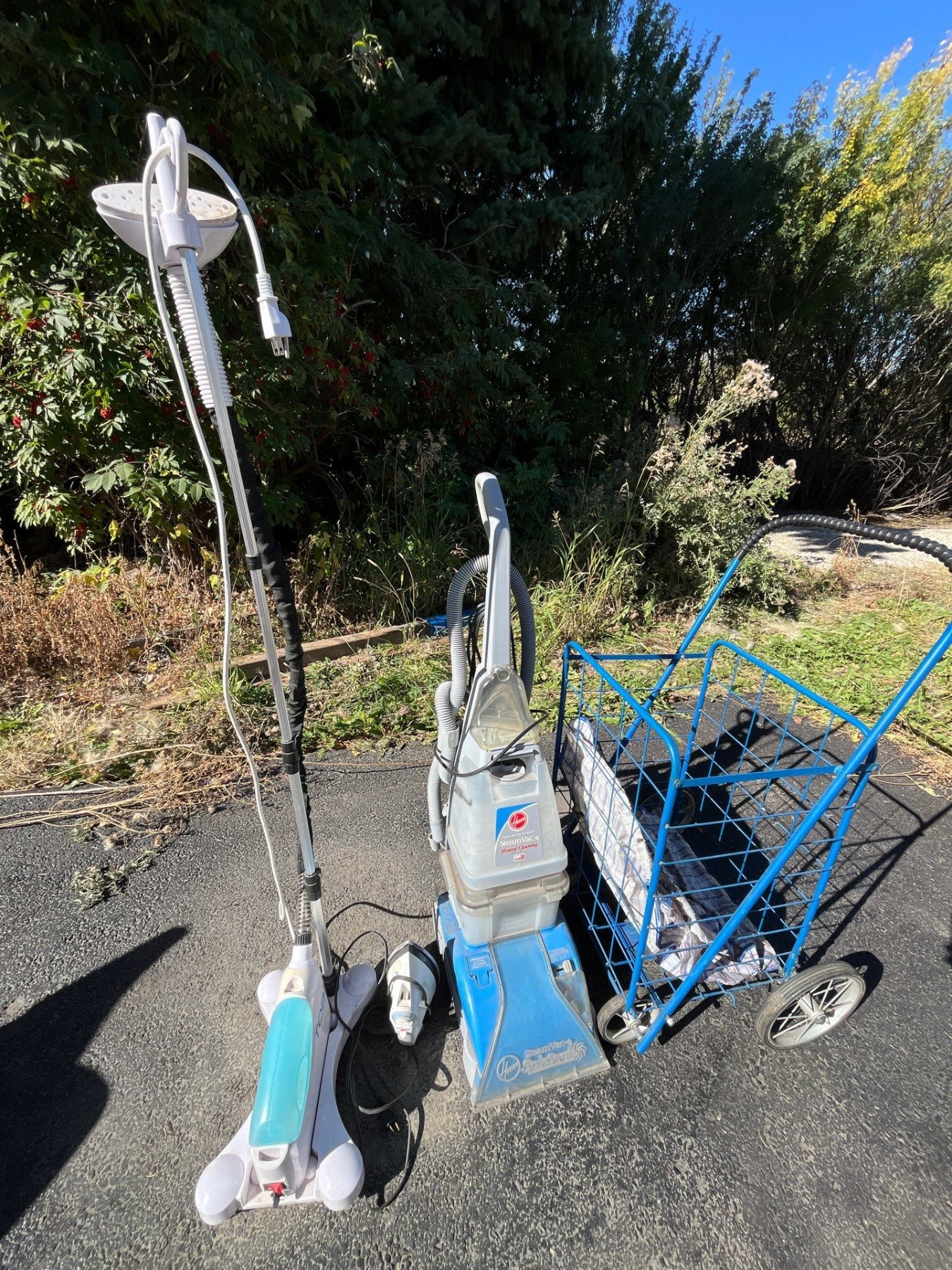 Hoover steam cleaner with Toby, stand-up clothing, steamer, and vintage grocery cart