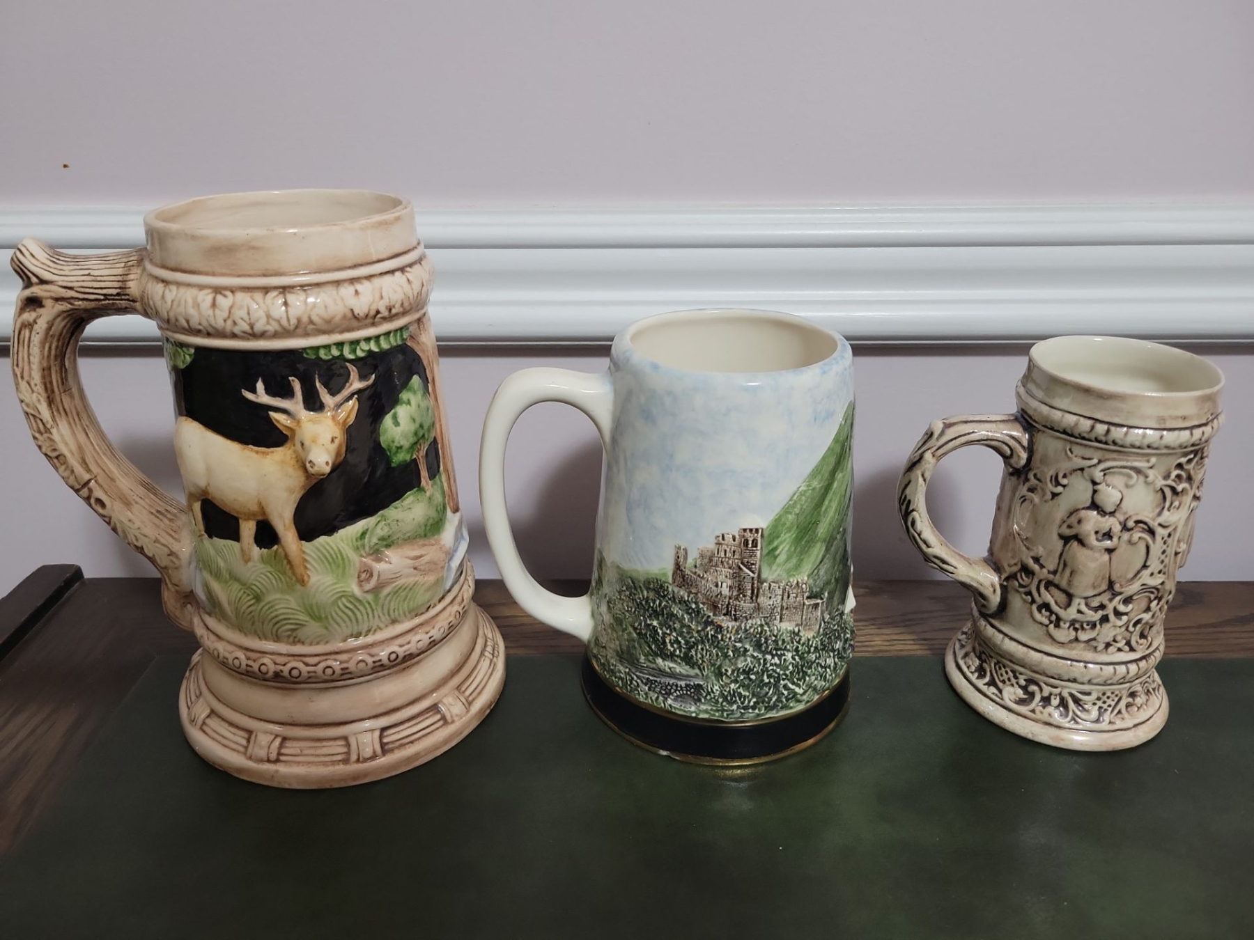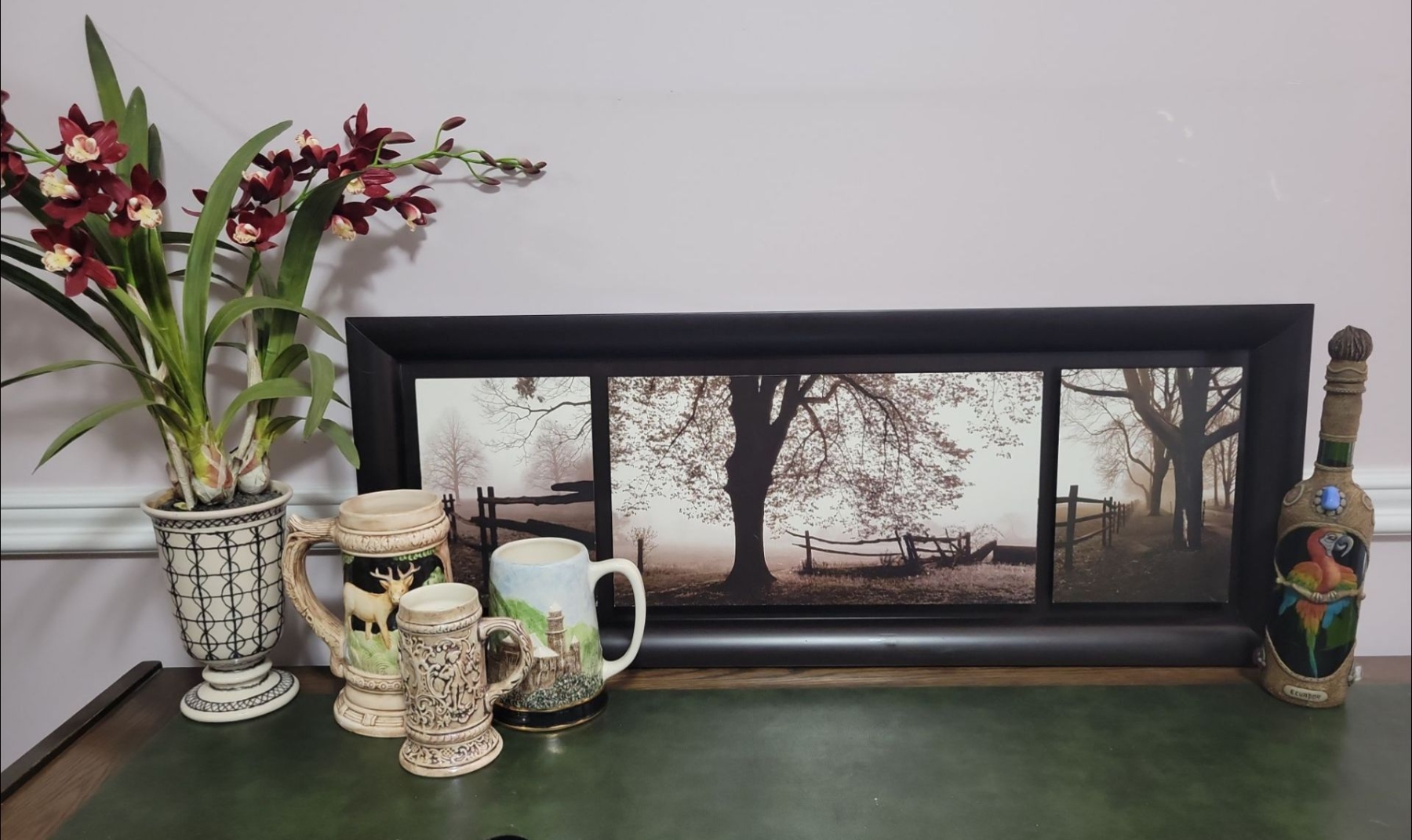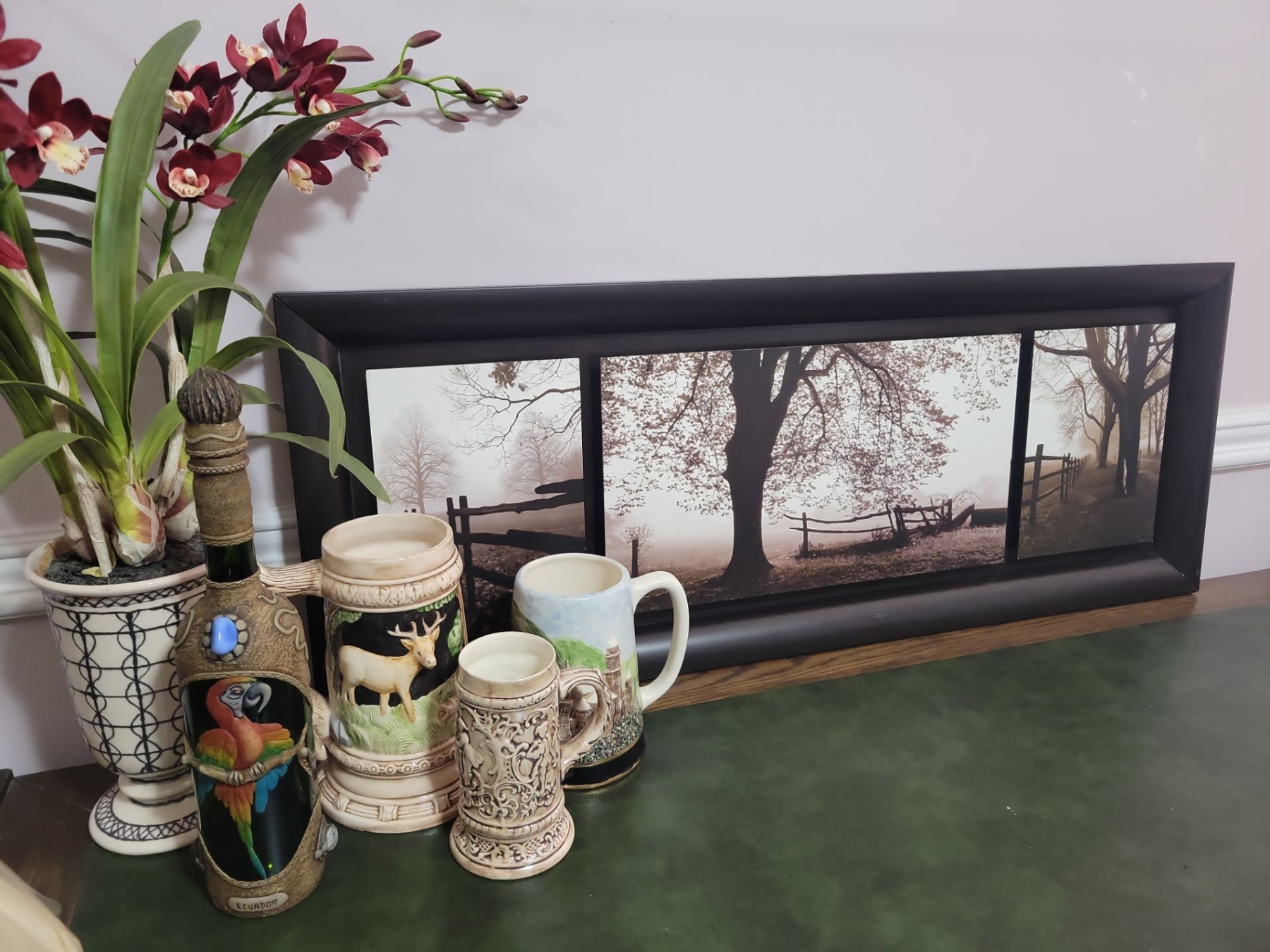 Horizontal Art Print 42W w/ Faux Orchid Plant & Foreign Collectable Beer Steins