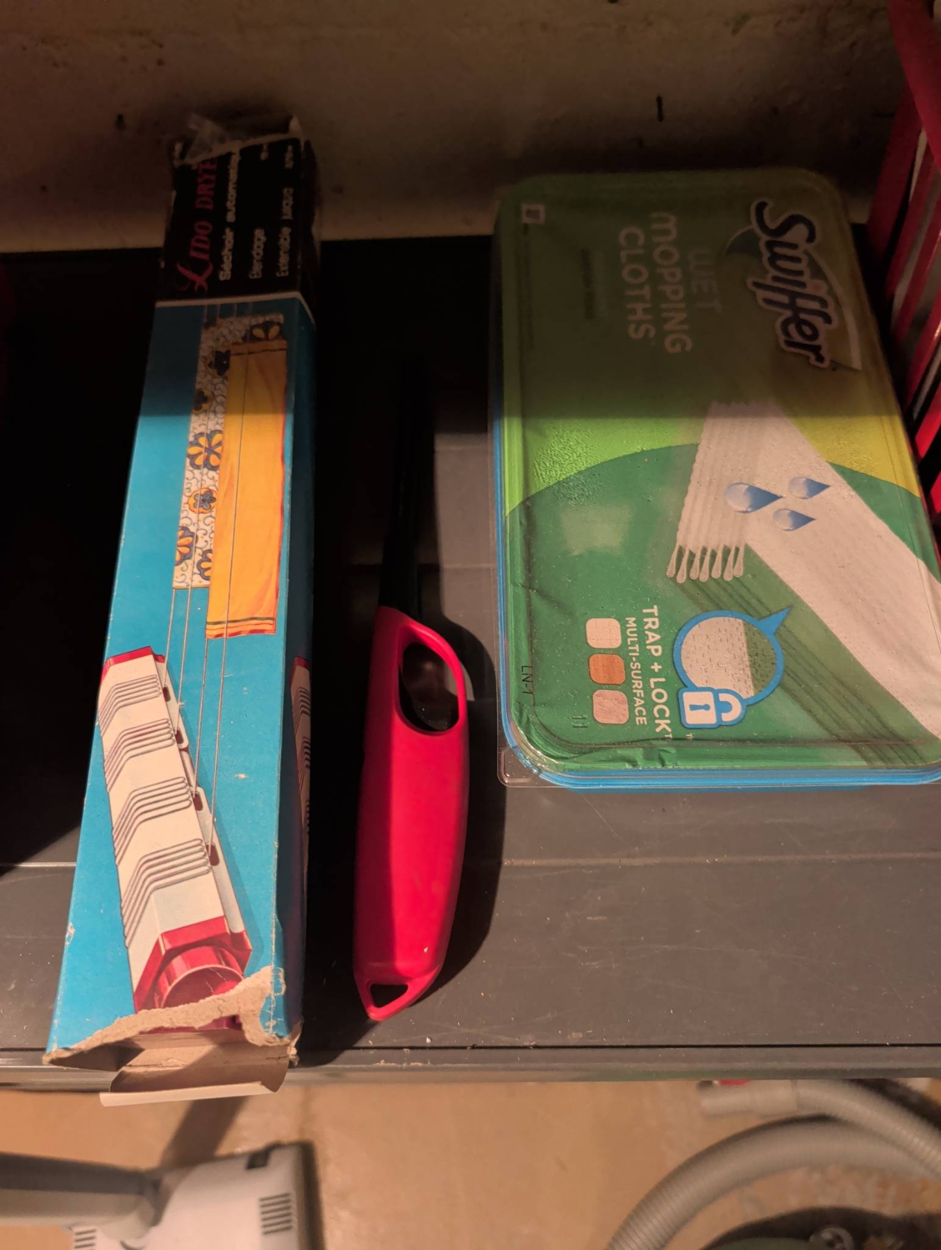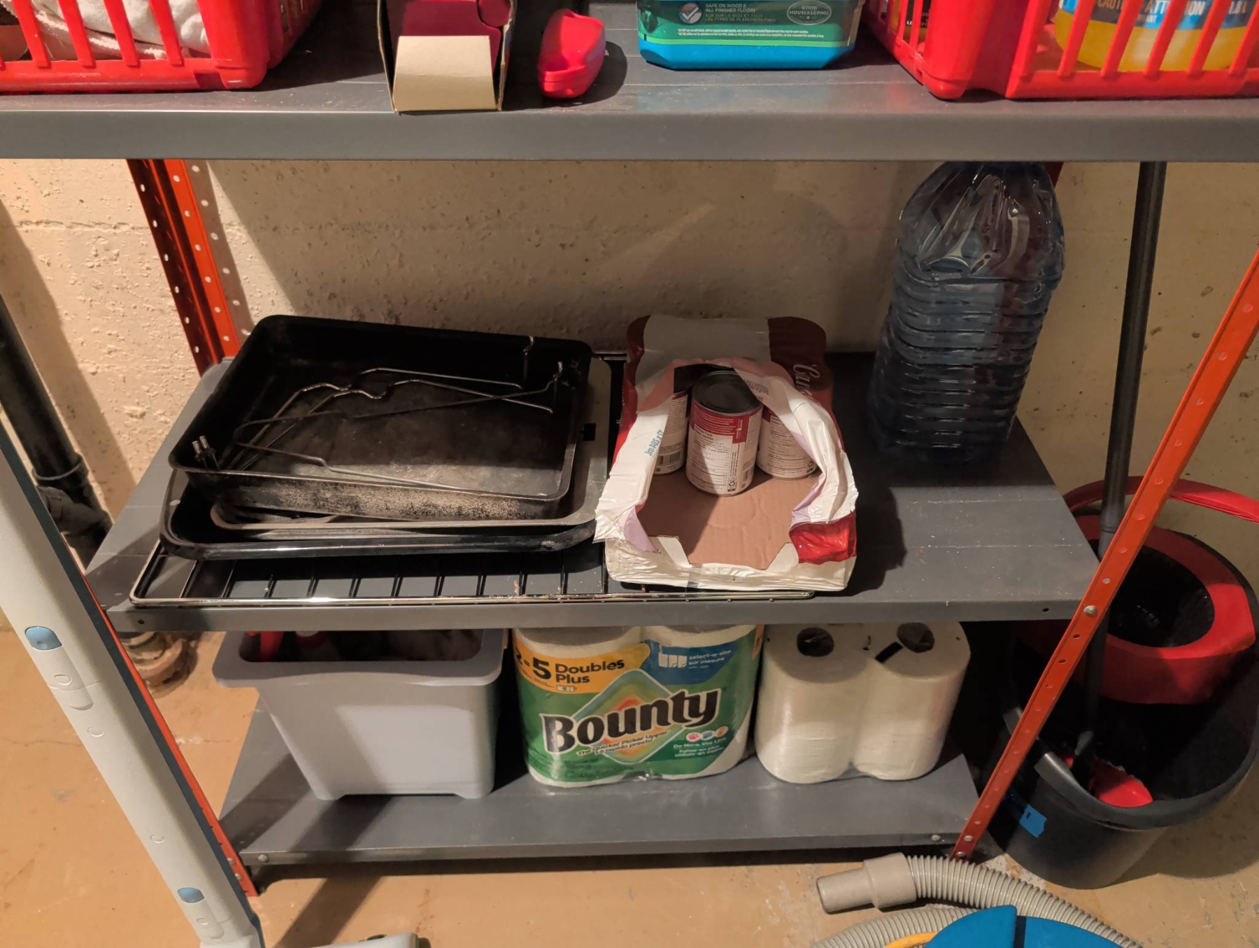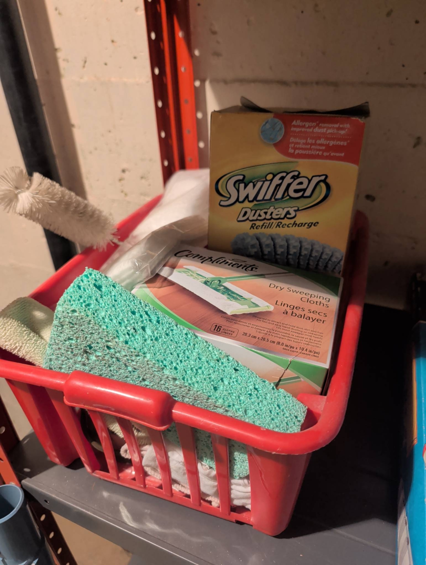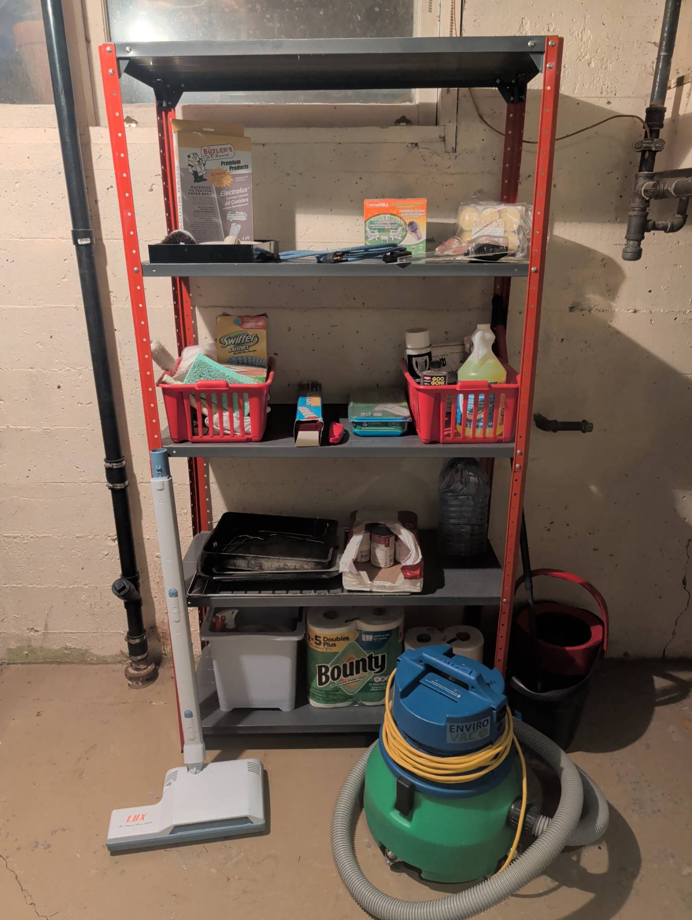 A multi-shelf metal storage rack (approximately 72in H x 30in W x 14in D) stocked with various cleaning supplies and related items. Features include a wet/dry vacuum labeled ‘Enviro Vac,’ mop bucket with wringer, paper towels, cleaning agents, Swiffer items, brushes, vacuum bags, gardening accessories, and thermometers. Most items show light to moderate use. Convenient starter set for household cleaning needs.