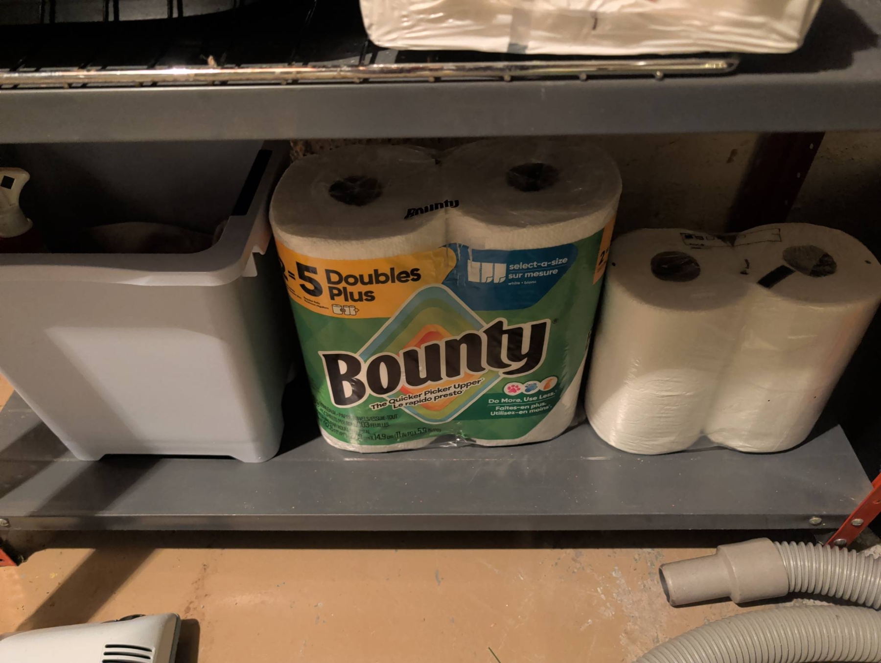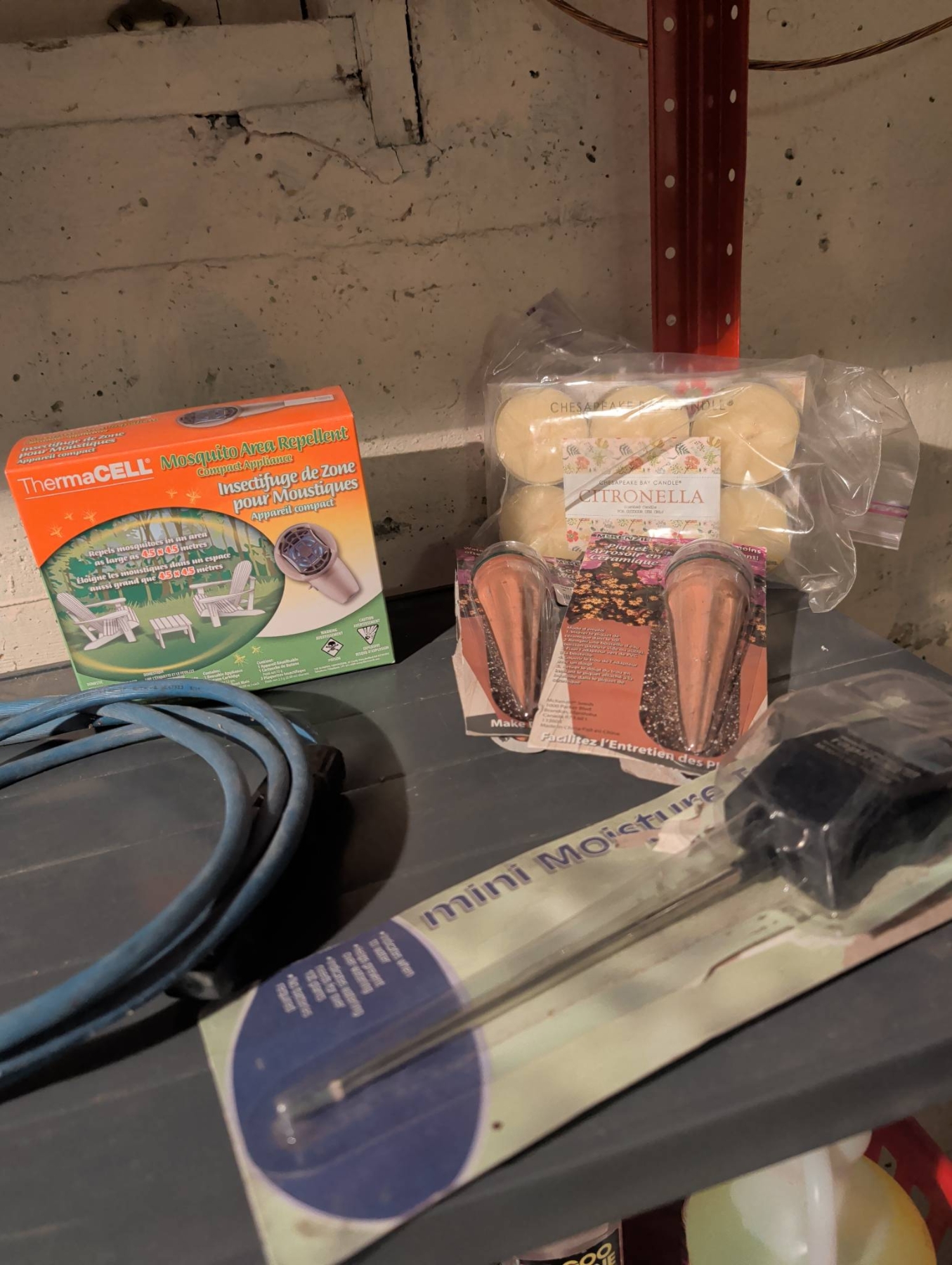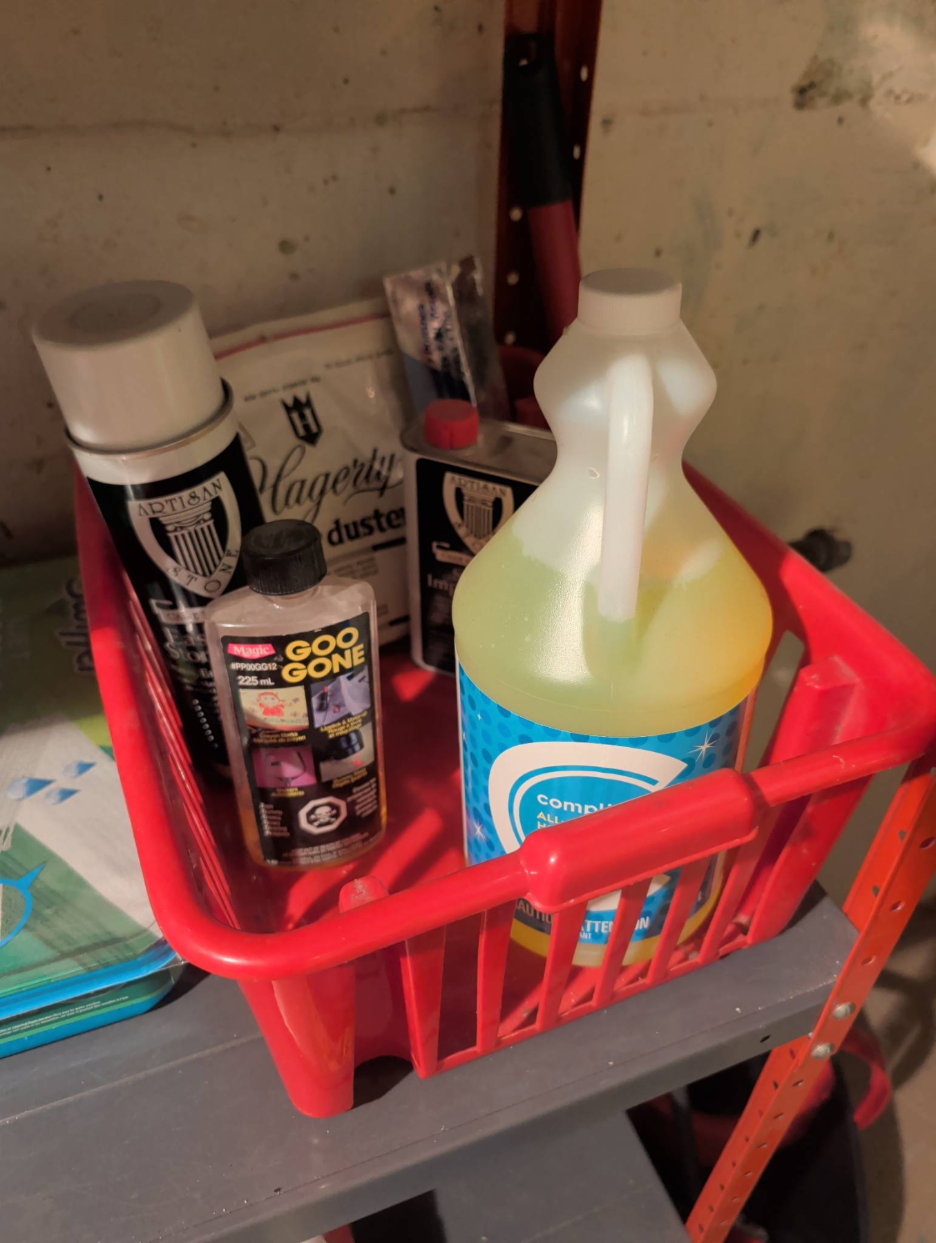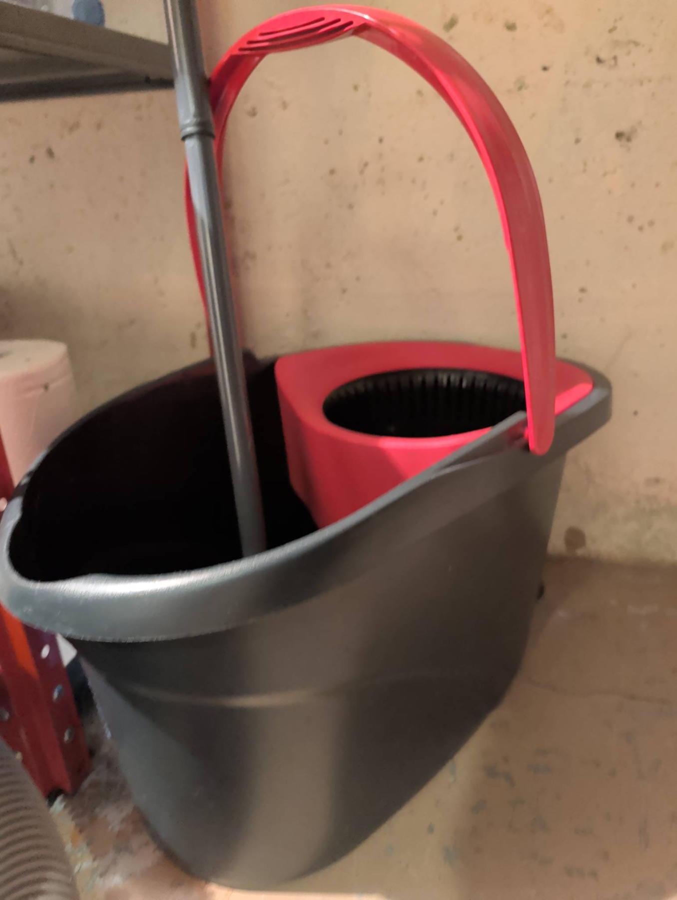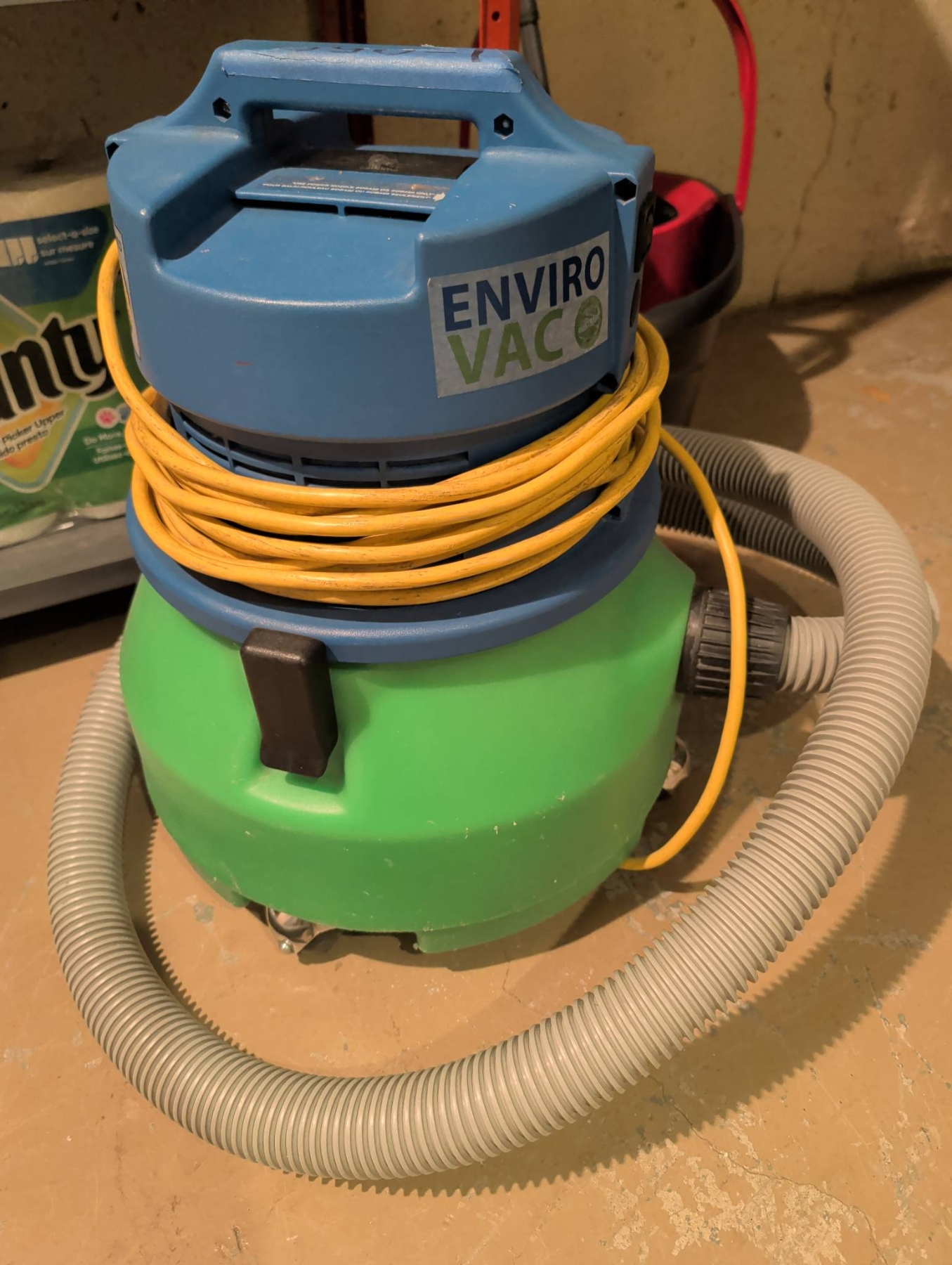 A multi-shelf metal storage rack (approximately 72in H x 30in W x 14in D) stocked with various cleaning supplies and related items. Features include a wet/dry vacuum labeled ‘Enviro Vac,’ mop bucket with wringer, paper towels, cleaning agents, Swiffer items, brushes, vacuum bags, gardening accessories, and thermometers. Most items show light to moderate use. Convenient starter set for household cleaning needs.