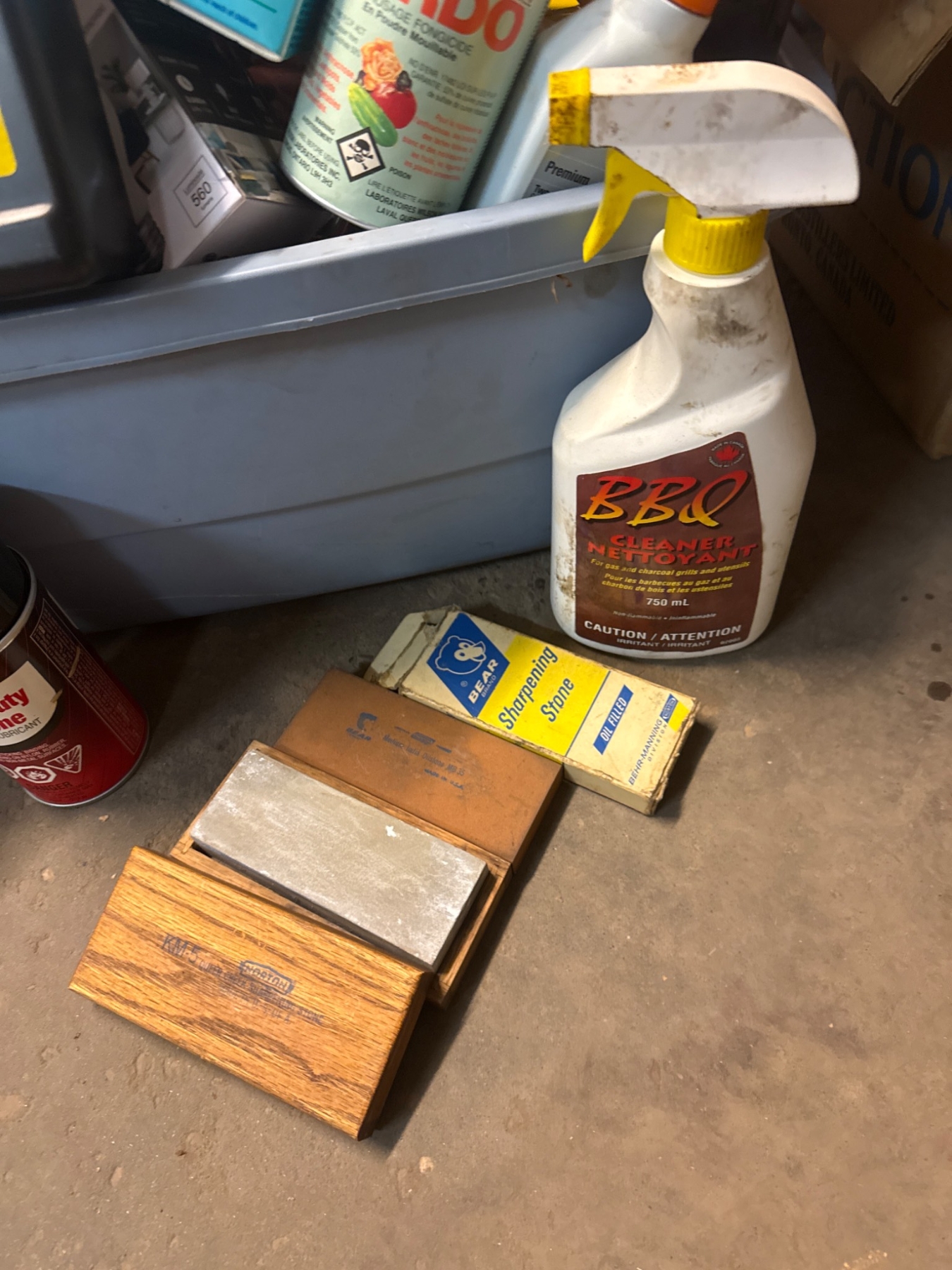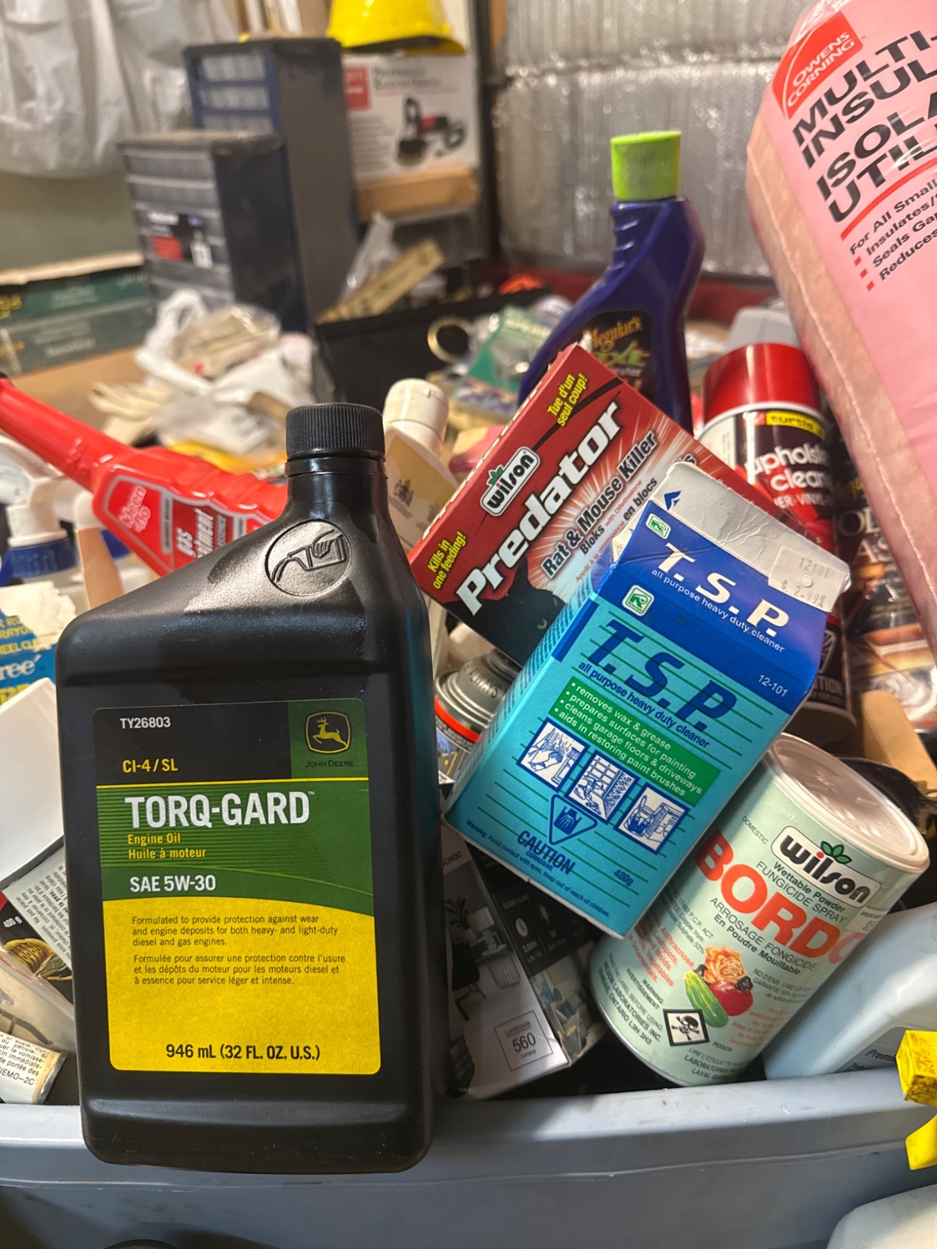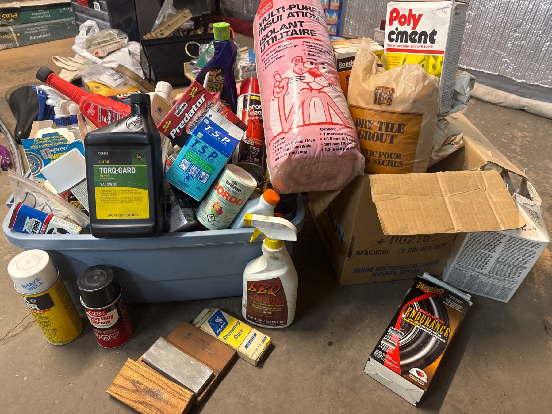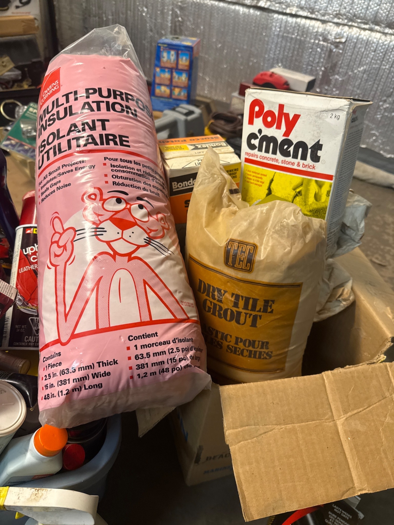 Collection includes assorted items for household repairs and maintenance. Visible contents comprise lubricants, cleaning agents, insulation materials, dry tile grout (multi-pack), a bag of poly cement, various size sanding blocks, grilling cleaner, and other household-use chemicals and tools. Dimensions of the blue storage bin: approximately 24in L x 18in W x 12in H. Items exhibit varying degrees of use and wear; specifics unknown.