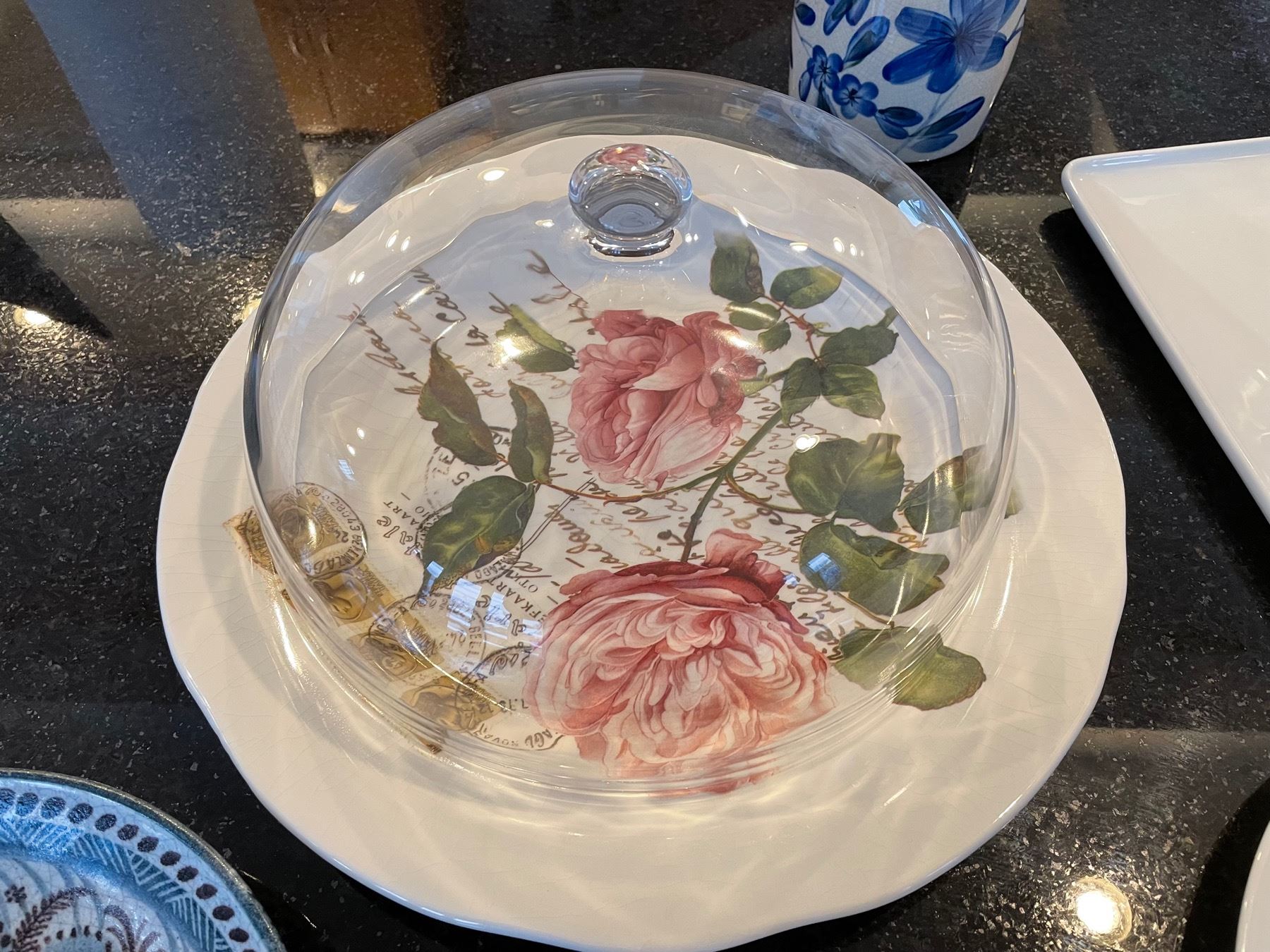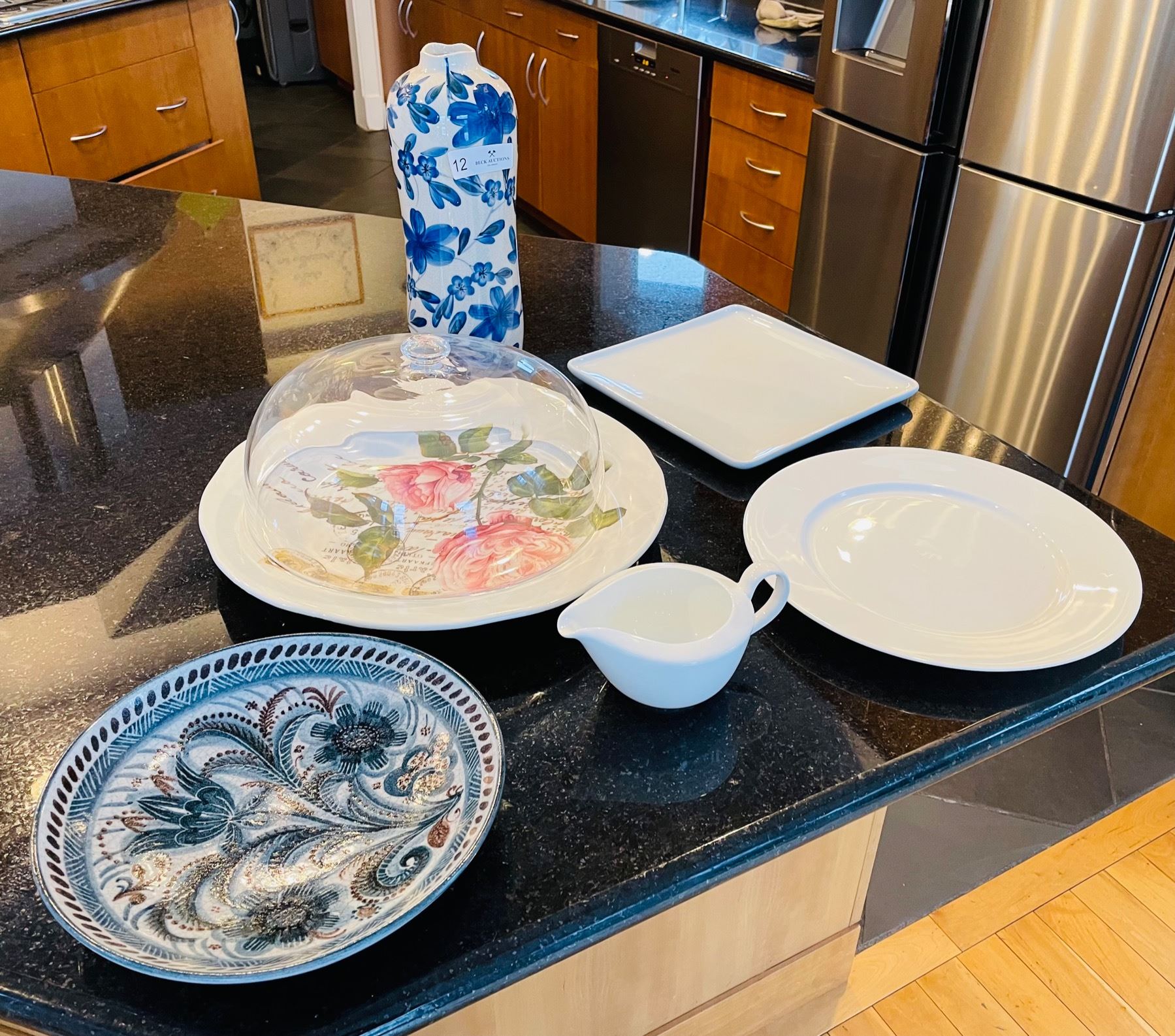 Tall decorative vase with faux crazing measures 13 - 1/2 inches tall. Big cake dome as well as a few other dining items.