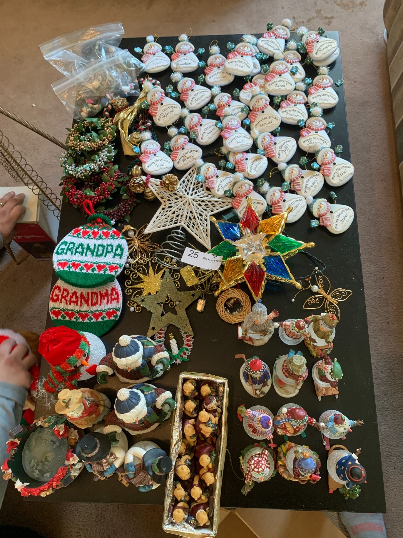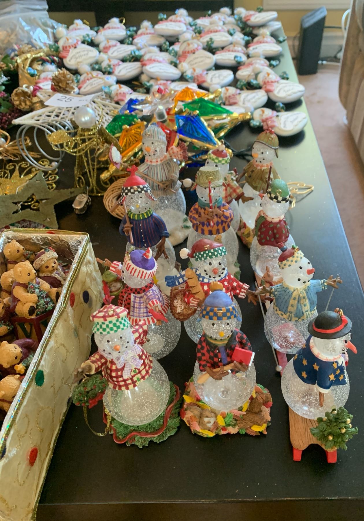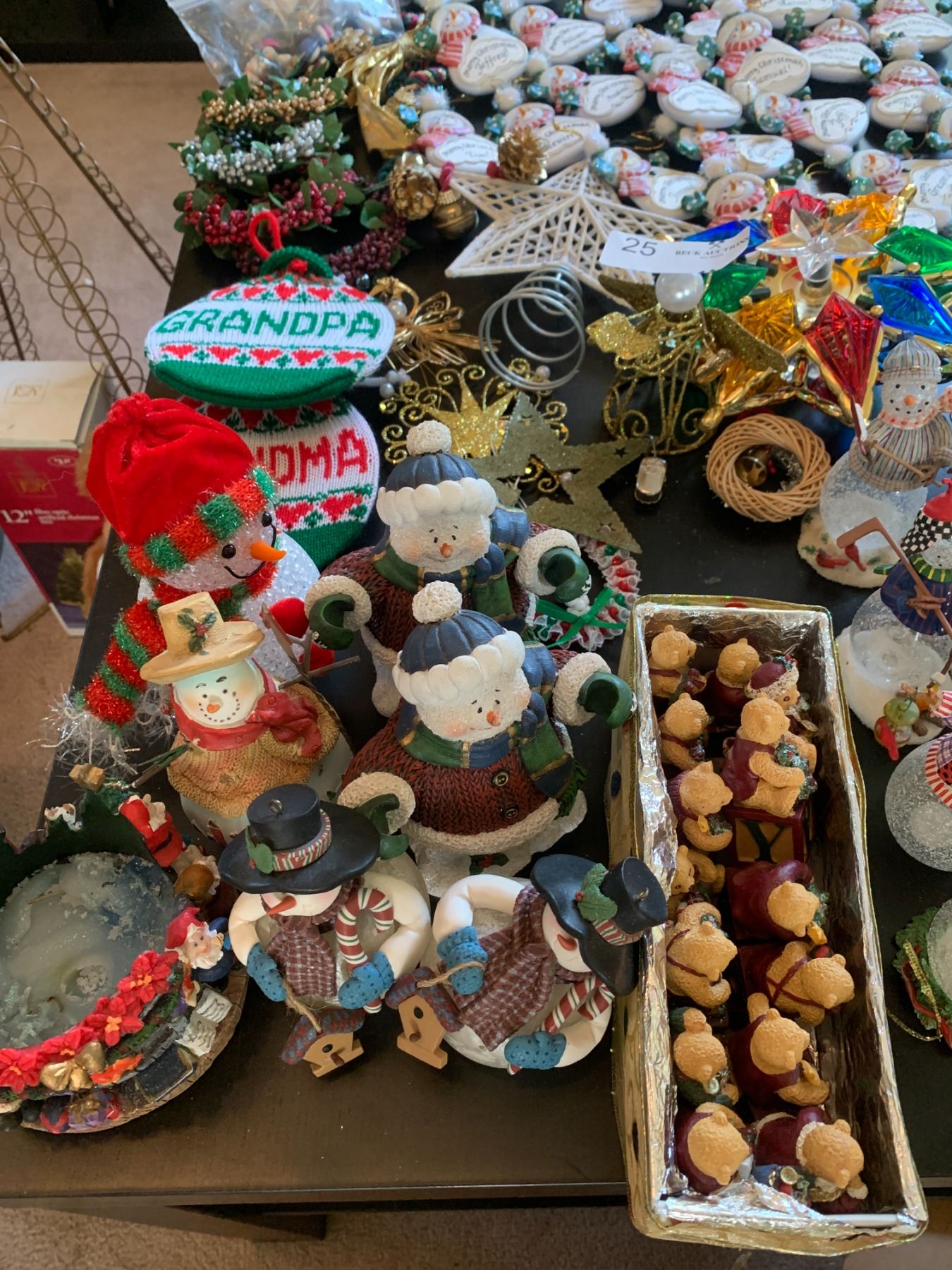 Huge Lot of Christmas Decorations. Includes Teddy bear, mini pine trees, snowman figurines, and "Santa's on the way" fiber optic balloon.