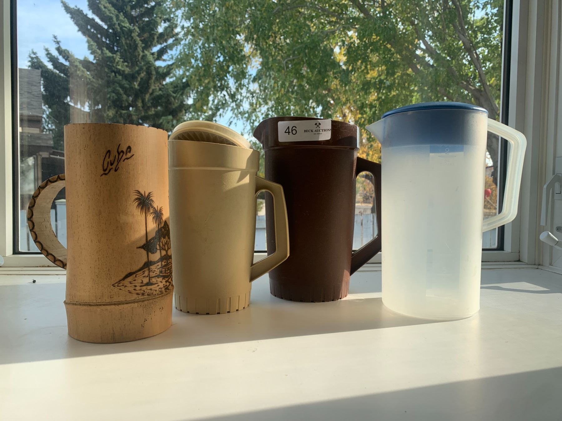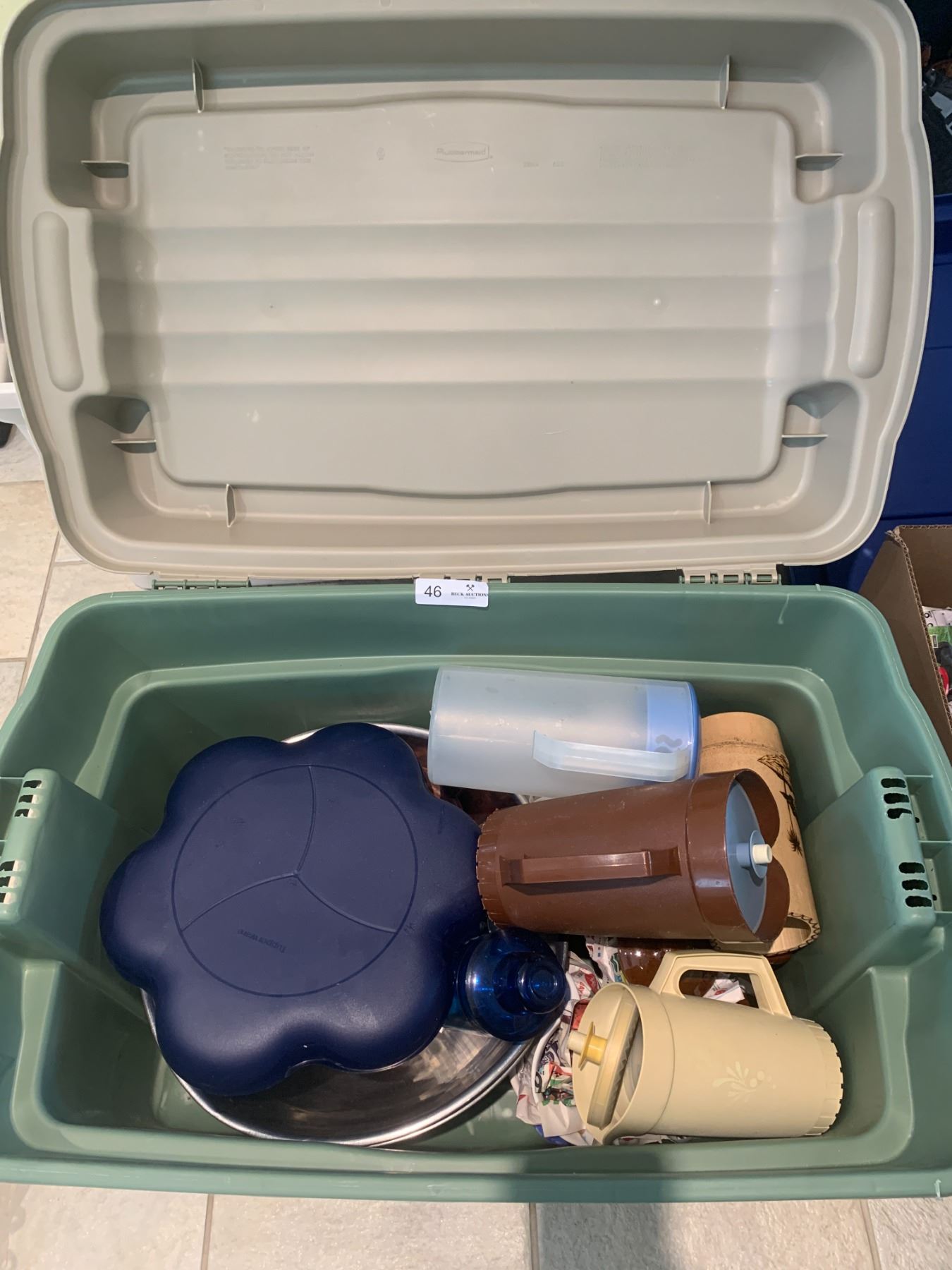 Huge Rubbermaid Tote of Kitchenware. Includes Tupperware pitchers, large metal mixing bowls, and French onion soup bowls.