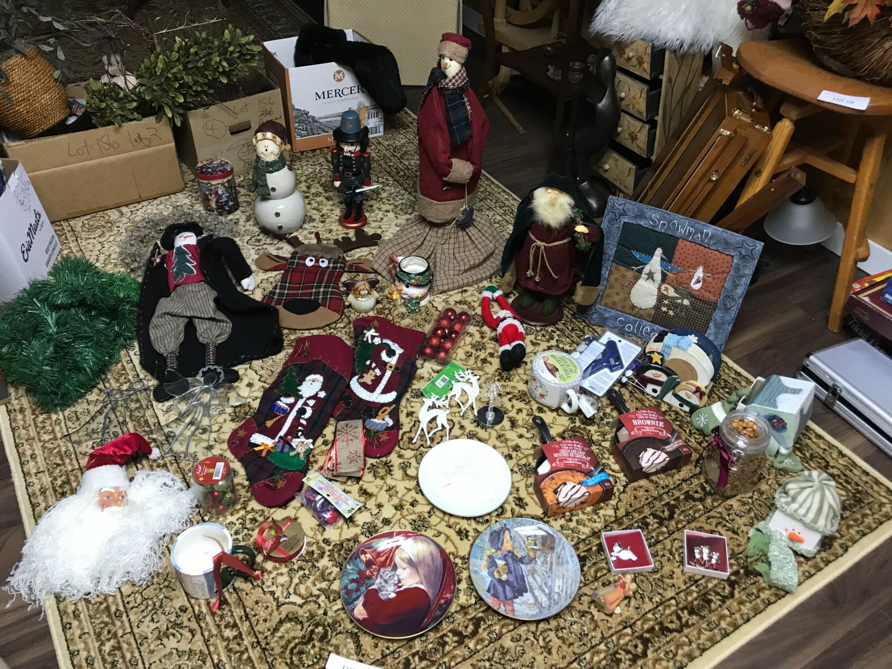Huge asst of Christmas stockings, plates, coasters, ornaments, pins, etc.