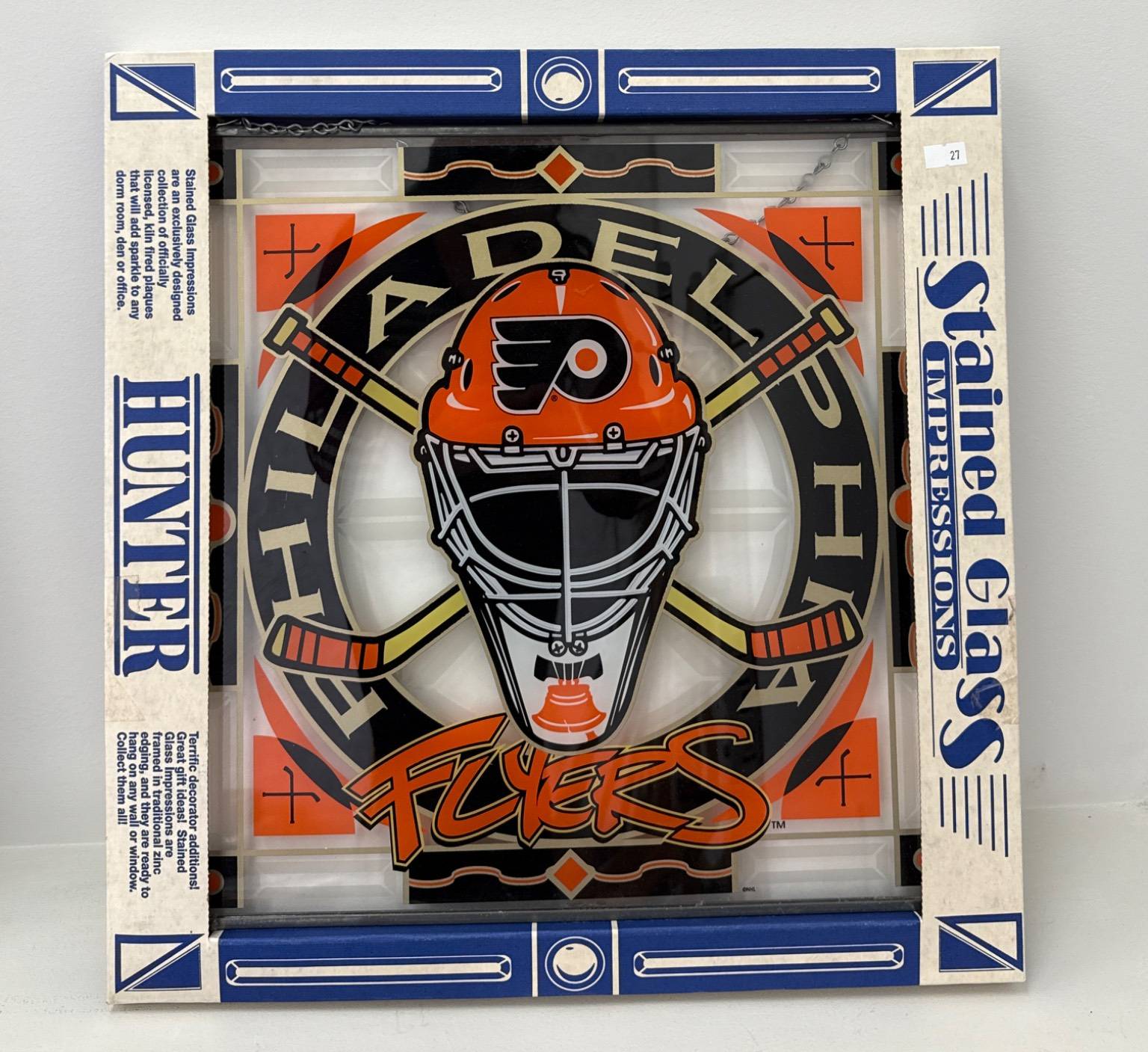 Stained glass wall art by Hunter featuring the Philadelphia Flyers logo, crossed hockey sticks, and a goaltender's mask. Designed in the team's signature colors. The piece is framed and measures 16x16 inches. Comes in original packaging labeled as Hunter Stained Glass Impressions.
