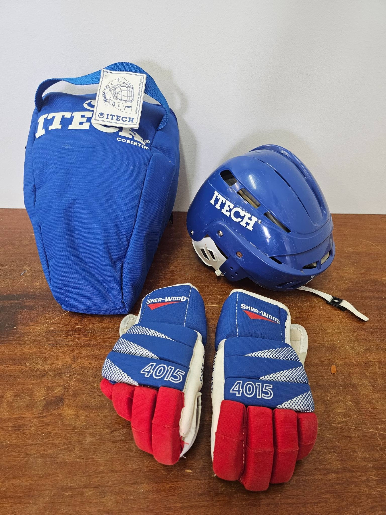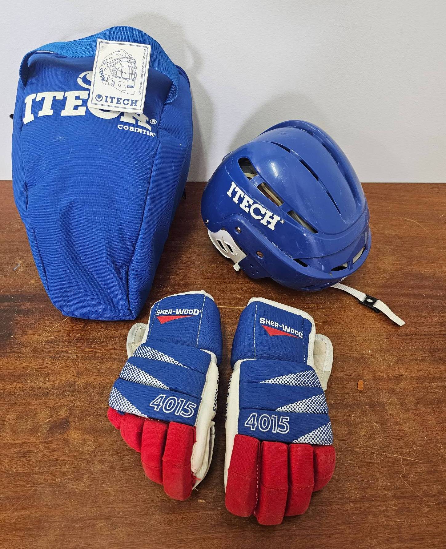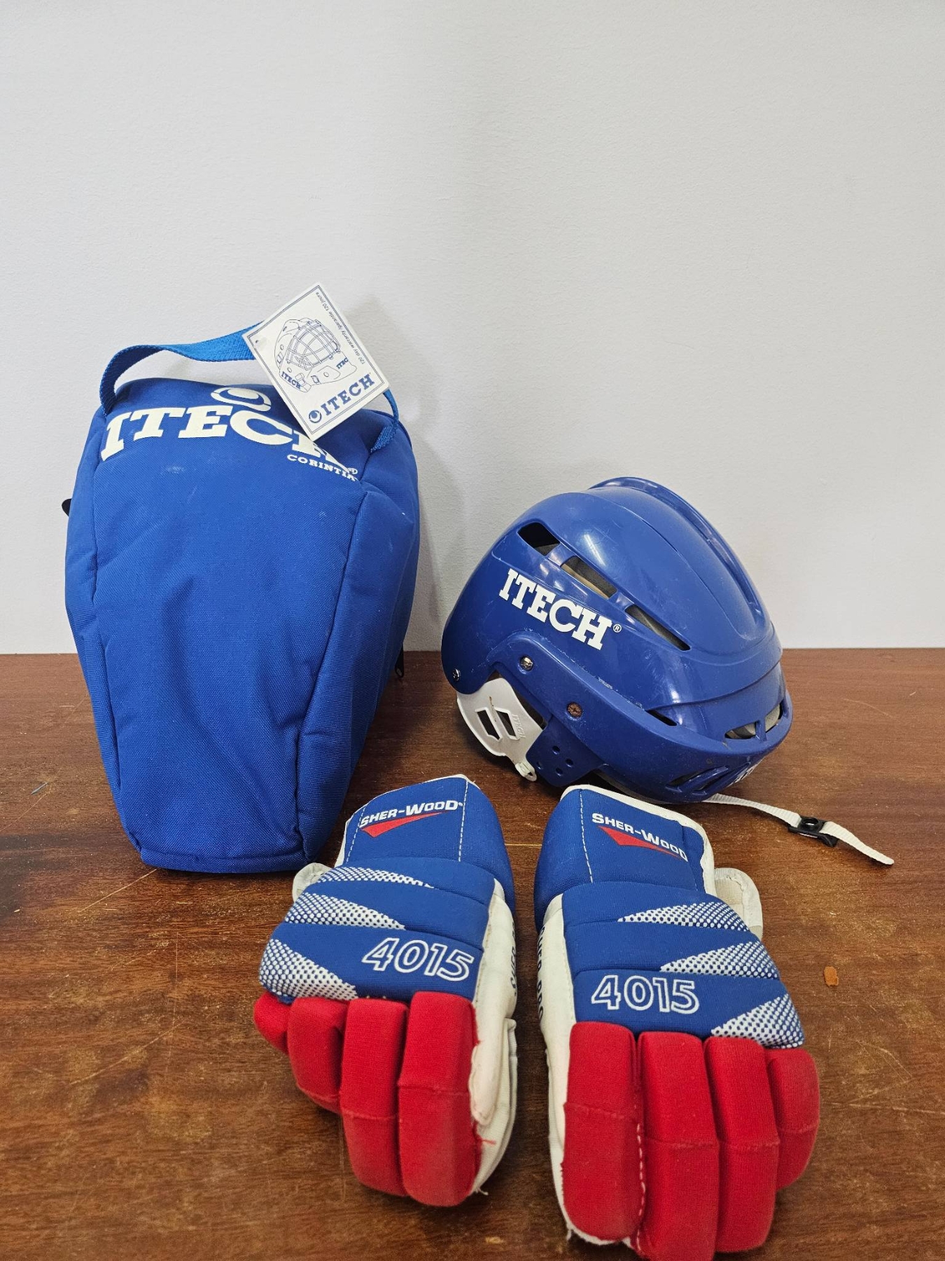 Includes an ITech blue hockey helmet with adjustable strap, a blue ITech carrying bag with original tag, and a pair of Sher-Wood 4015 gloves in blue and red. Helmet and gloves show minimal signs of use. Perfect for hockey enthusiasts or collectors.