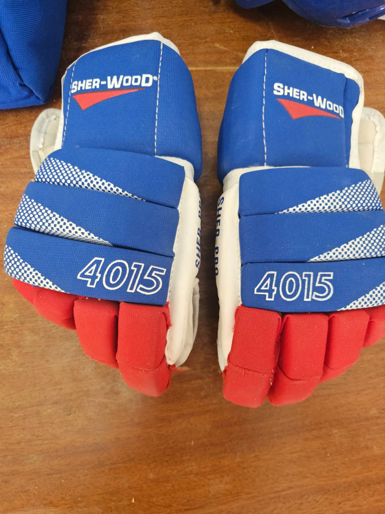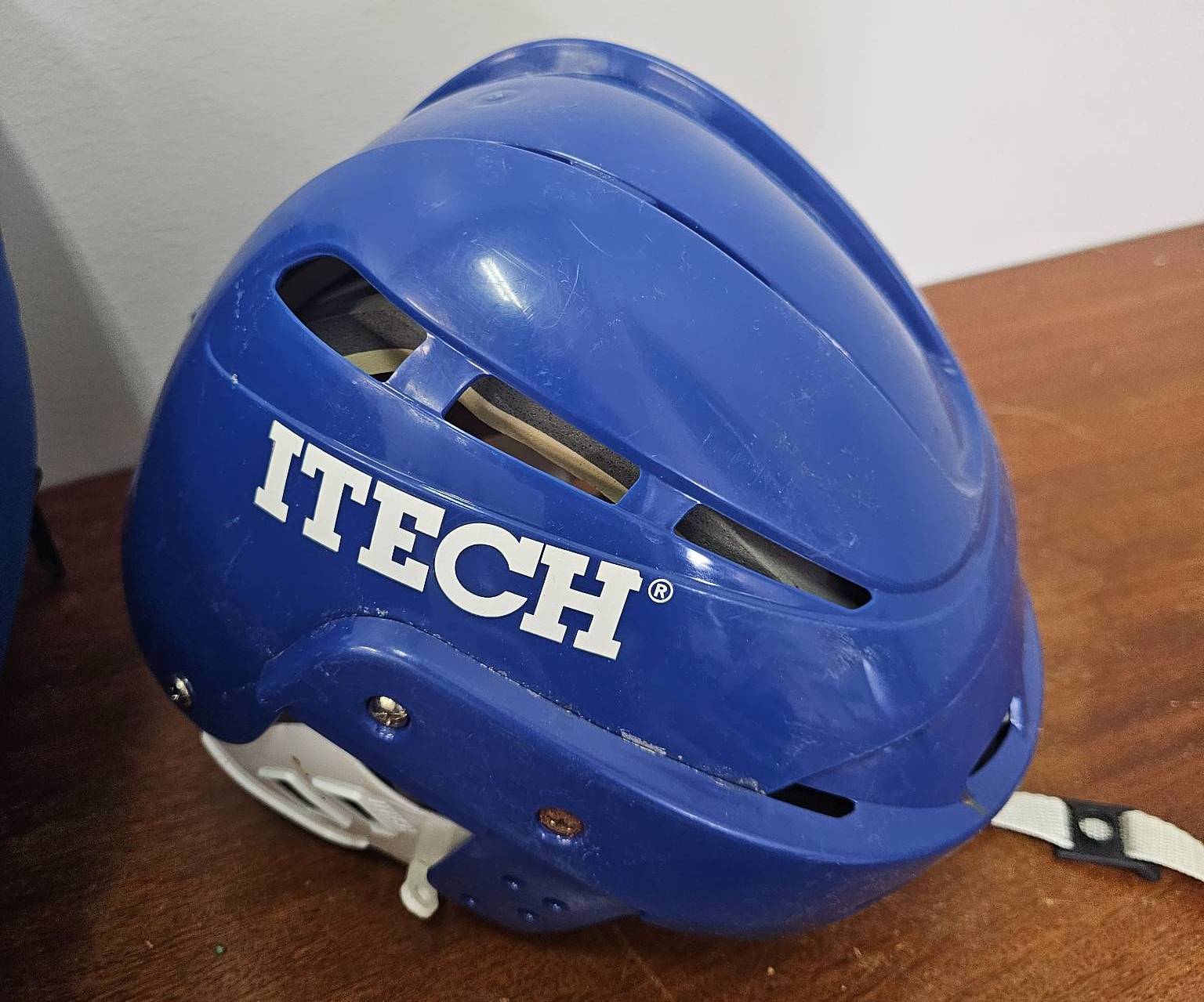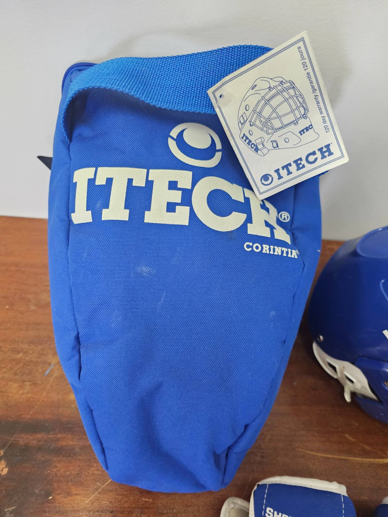 Includes an ITech blue hockey helmet with adjustable strap, a blue ITech carrying bag with original tag, and a pair of Sher-Wood 4015 gloves in blue and red. Helmet and gloves show minimal signs of use. Perfect for hockey enthusiasts or collectors.