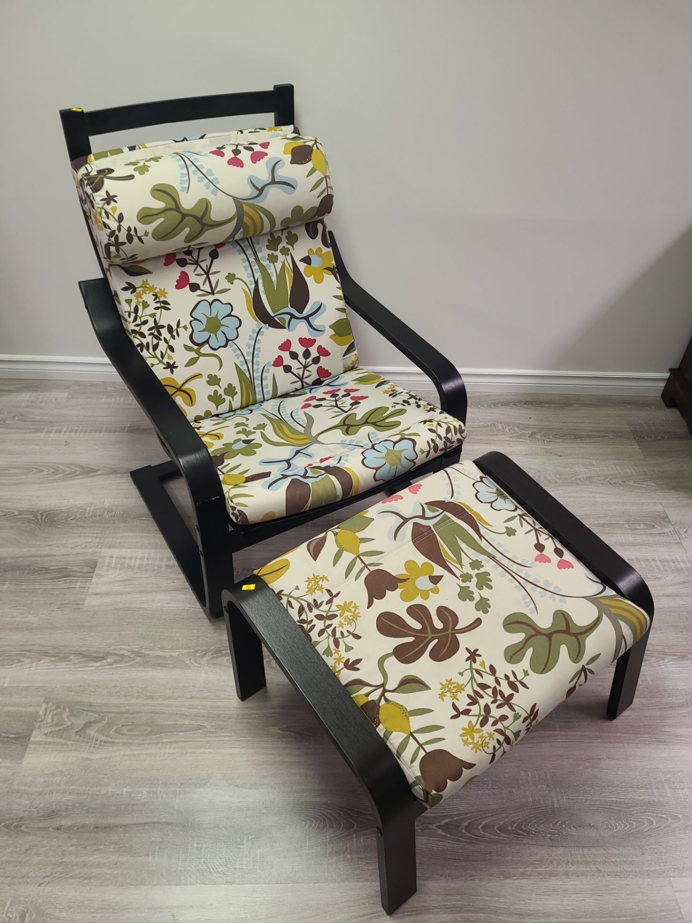 Ikea chair with footrest floral pattern - 22W, 36T, 22D and footrest 27W, 15T, 19D