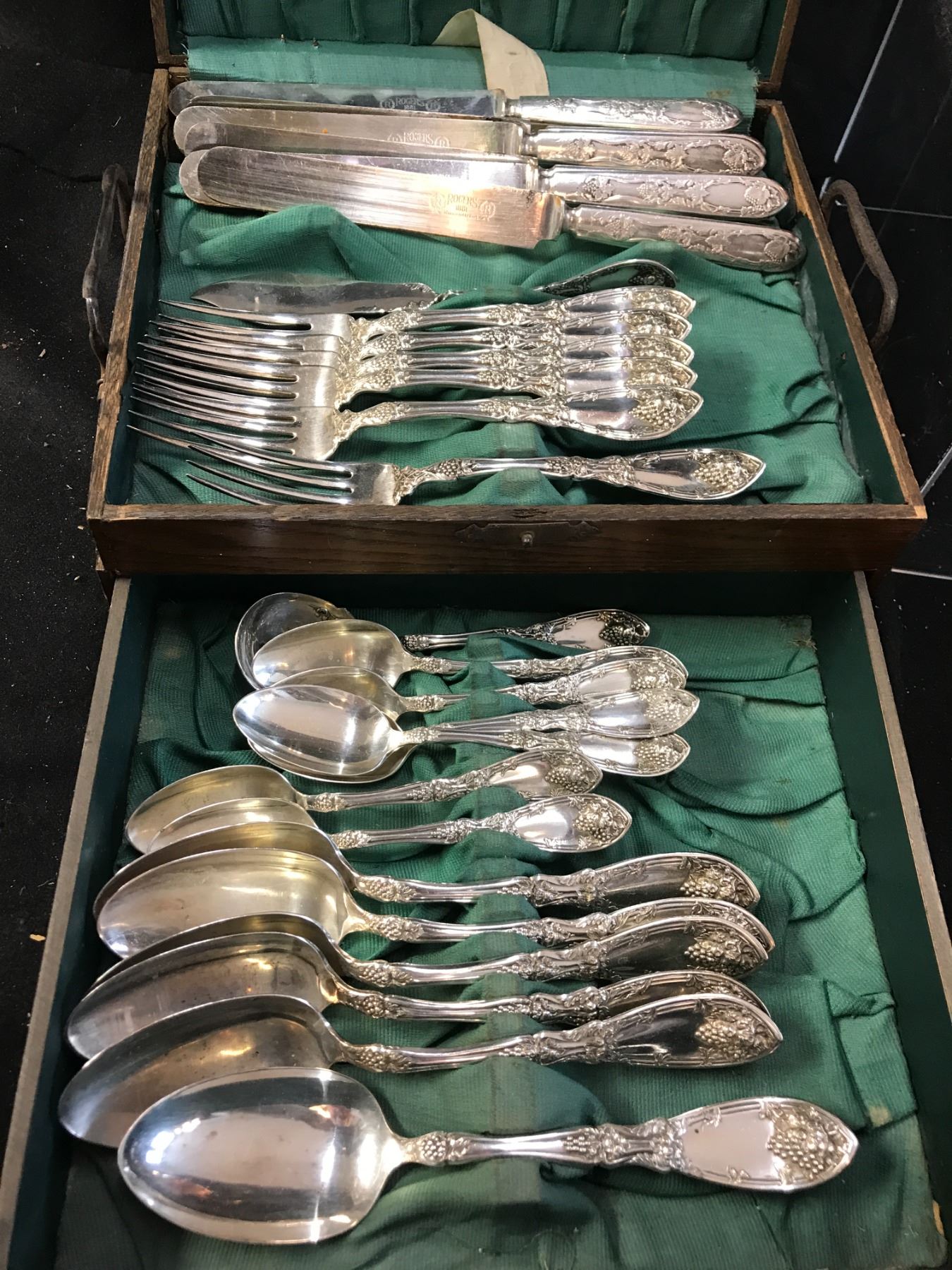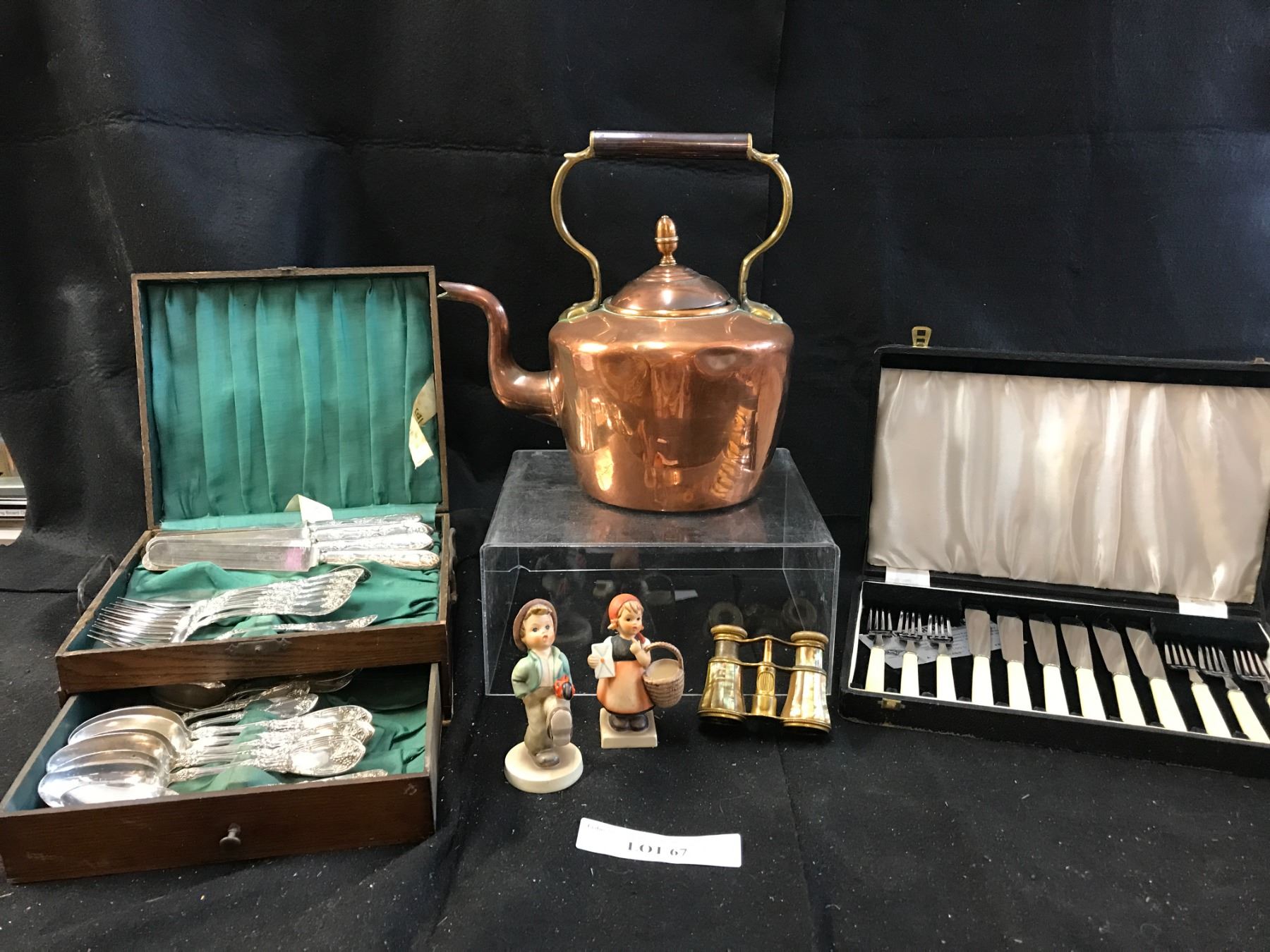 Incredible Antique Copper Kettle, Opera Glasses, Genuine Firth Staybrite Crusade Fisheater Set, 2 Goebel Figurines (Germany) Silverplate Coffee Pot/Cream/Sugar Bowl, 2 sets of Demi Cup/Saucers/Spoons, Vintage Candle HoldersAsst Plates, Mugs, White Casserole Dish, Butter Dish, Cream & Sugar Bowl, Sm Vase, 2 Bunny Figurines, 2 Wine Glasses, Precious Moments Momento Box & Sm Glass Bowl w Pinecones