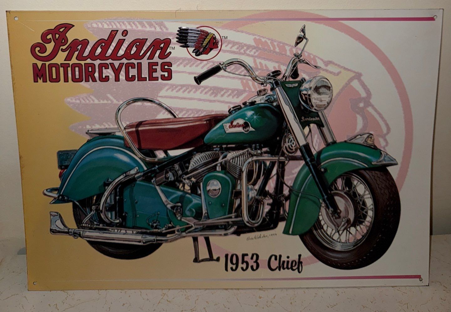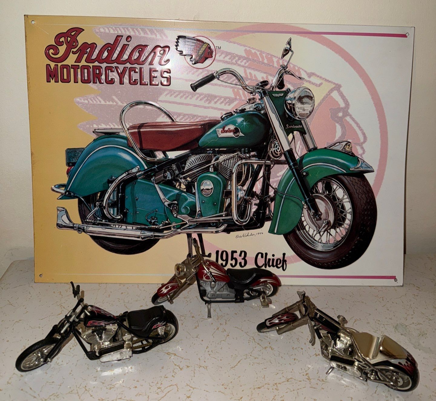 Indian Motorcycle Signage w/Three Model Motorcycles (One Has Broken Handlebars)