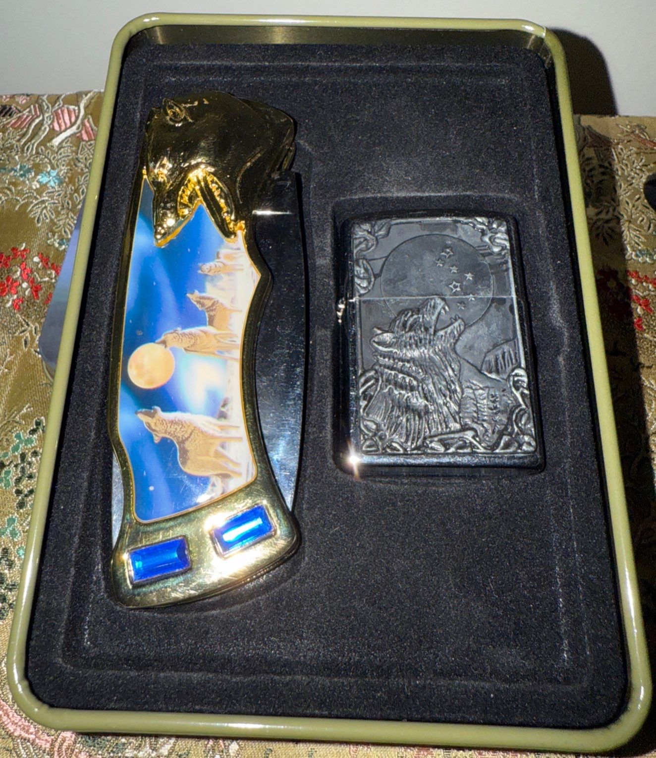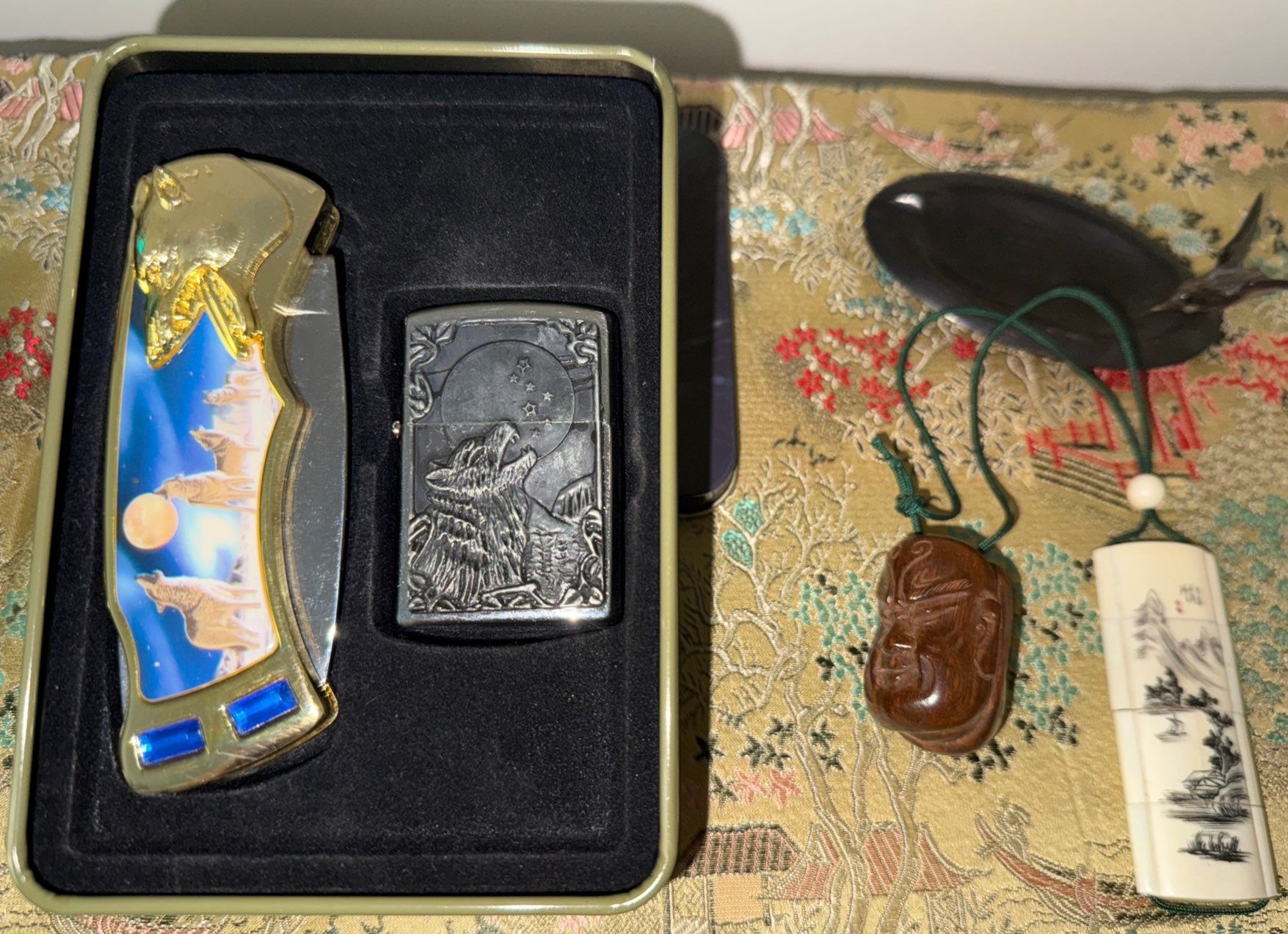 Indigenous Treasures -Wolf Pack Pocket Knife & Refillable Lighter w/ Bird Ash Tray Snuff Bottle & mo