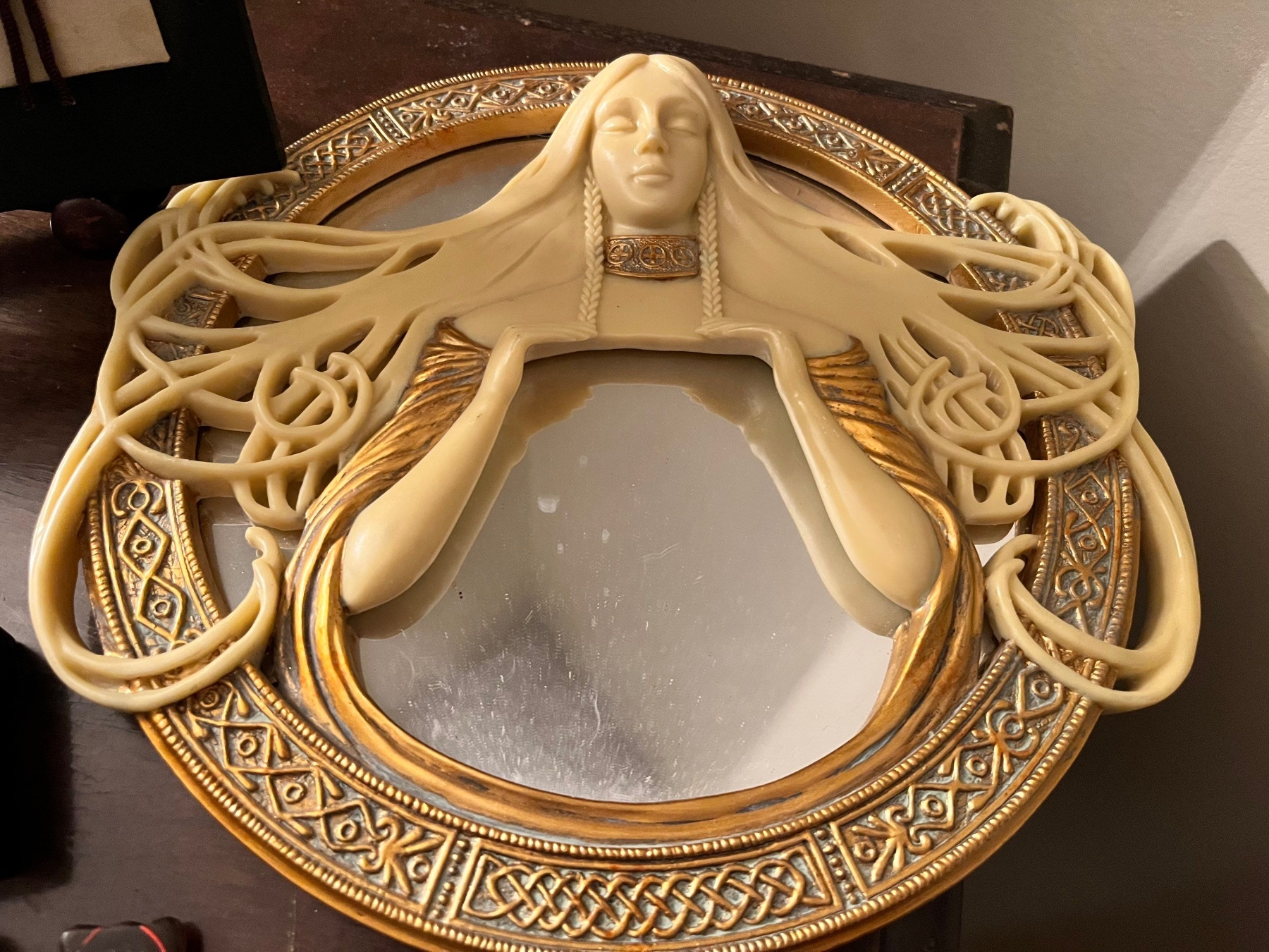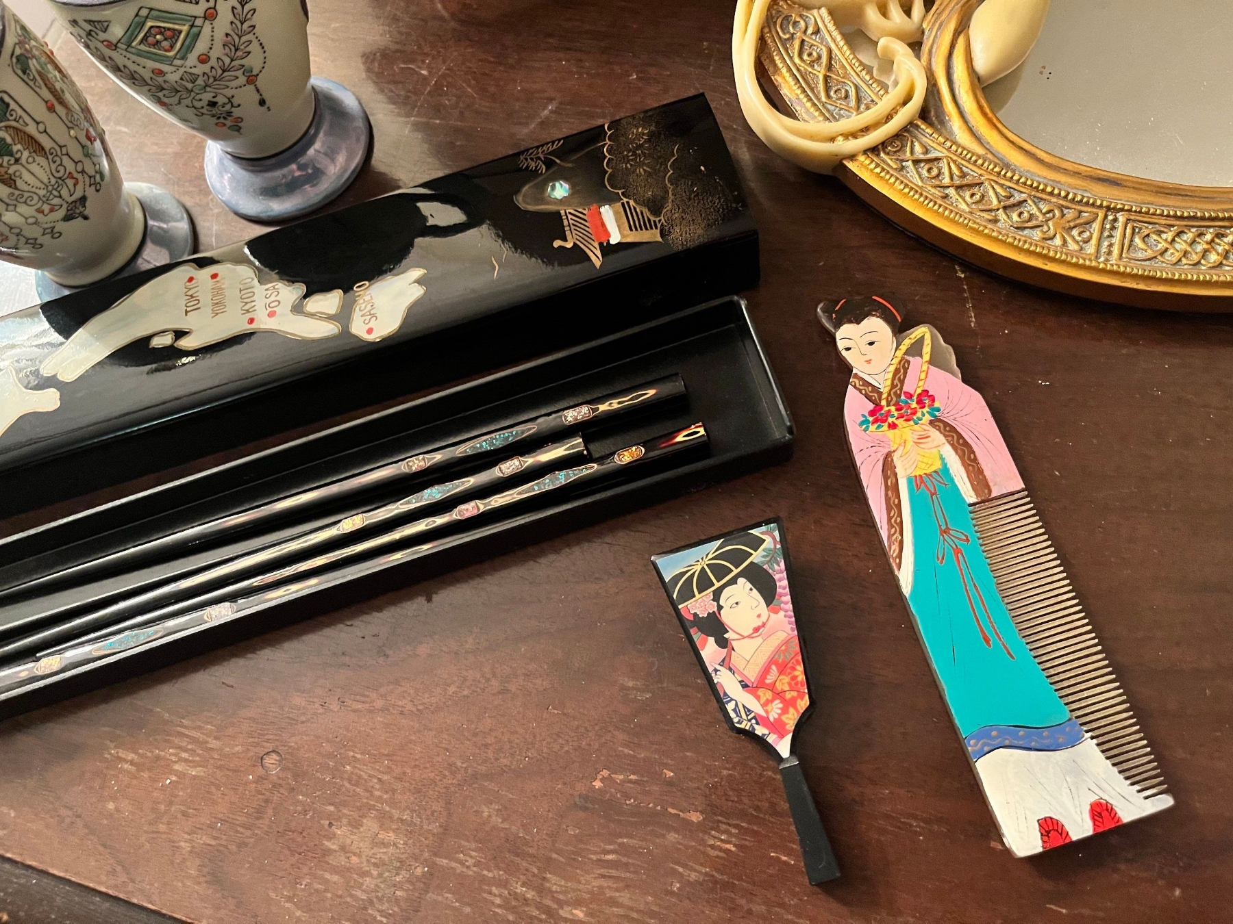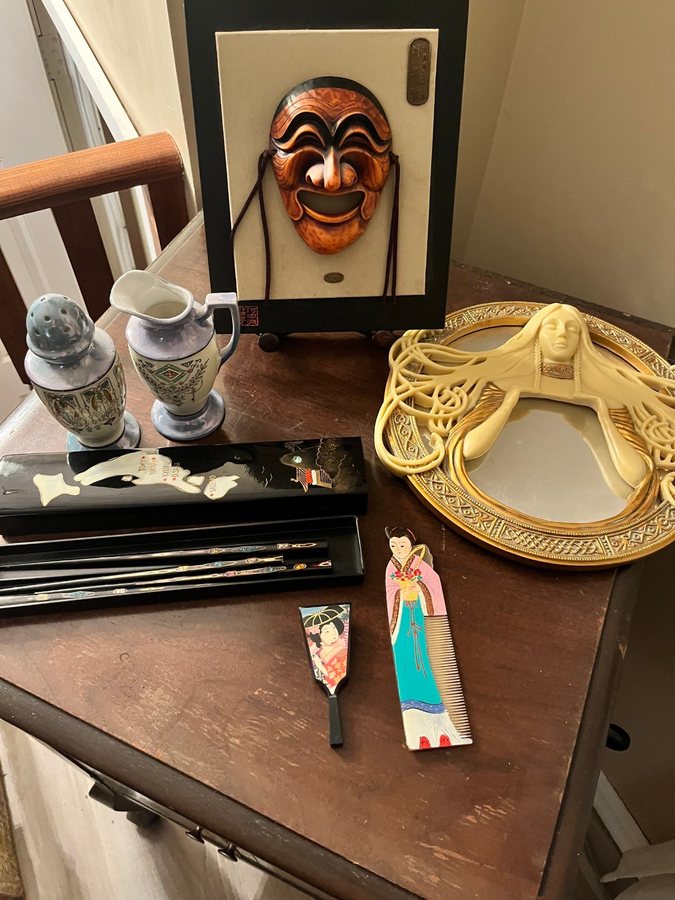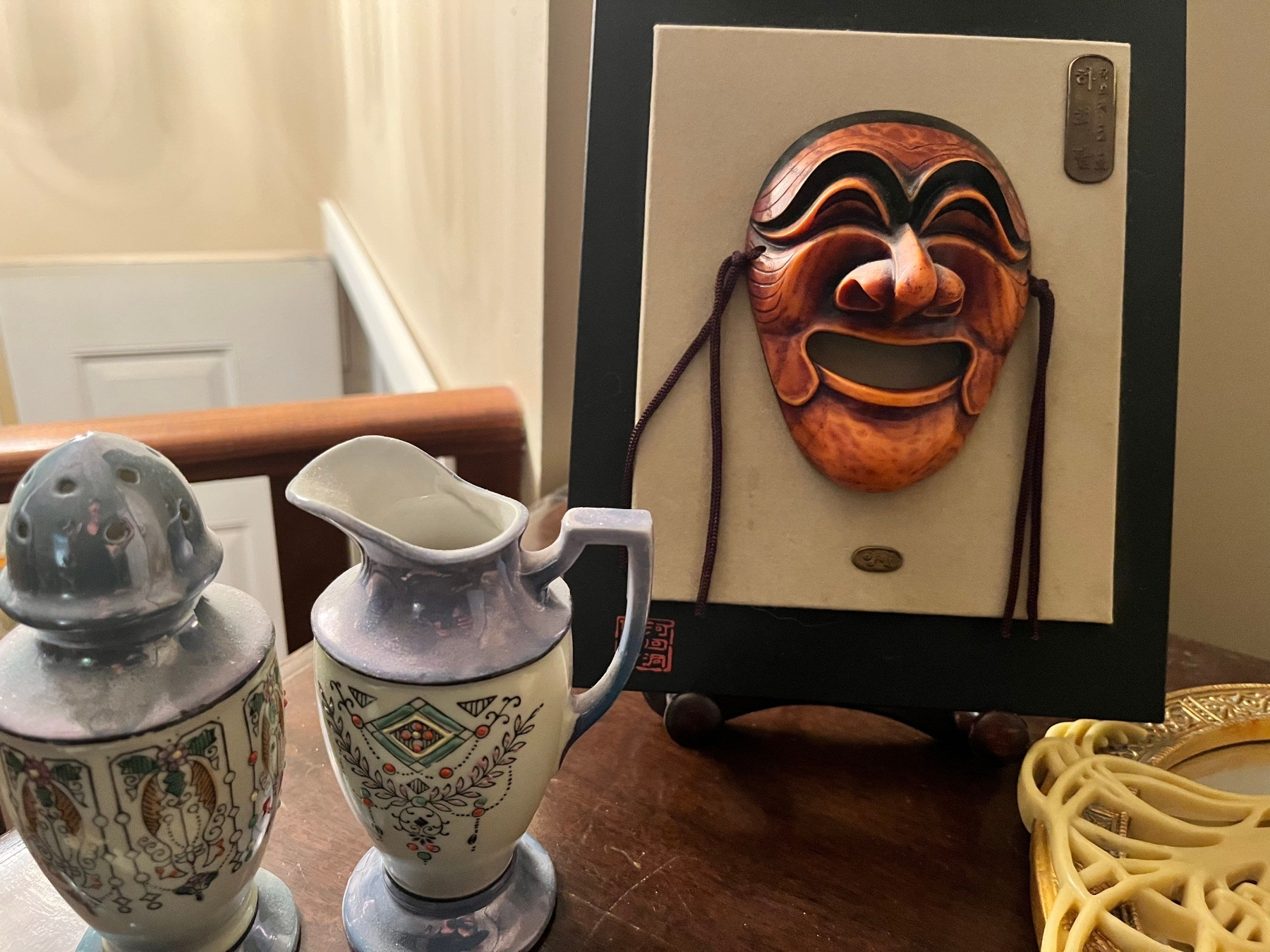 Indigenous, wood face mask, chopstick sets from Japan and your ornate mirror with ladies facing along with a small creamer and sugar bowl