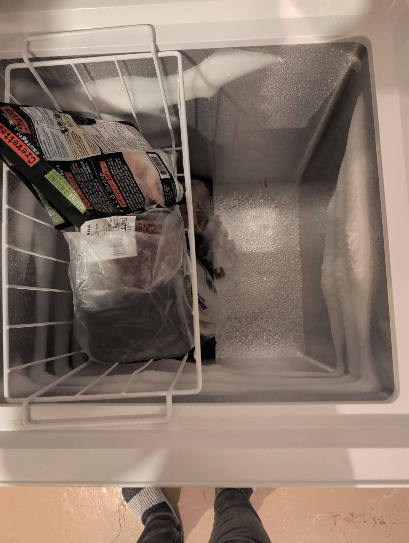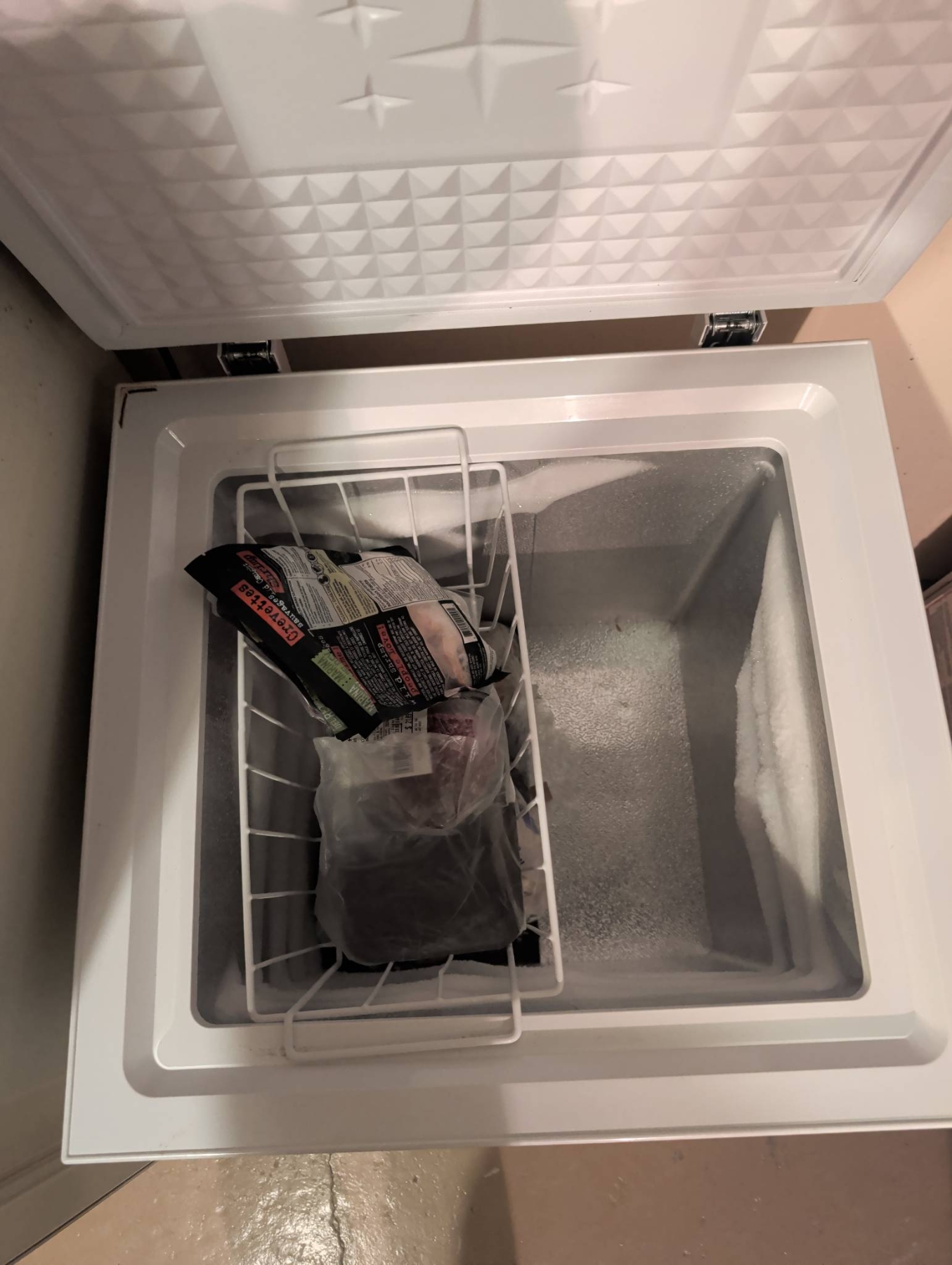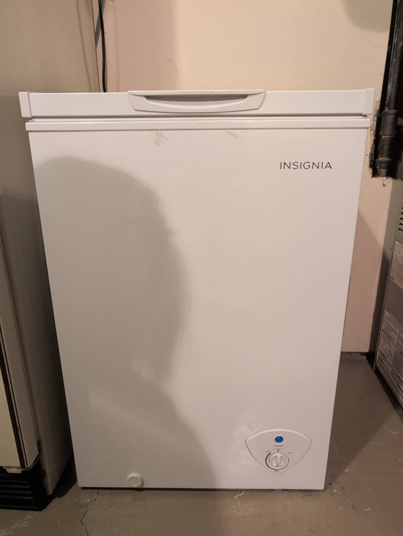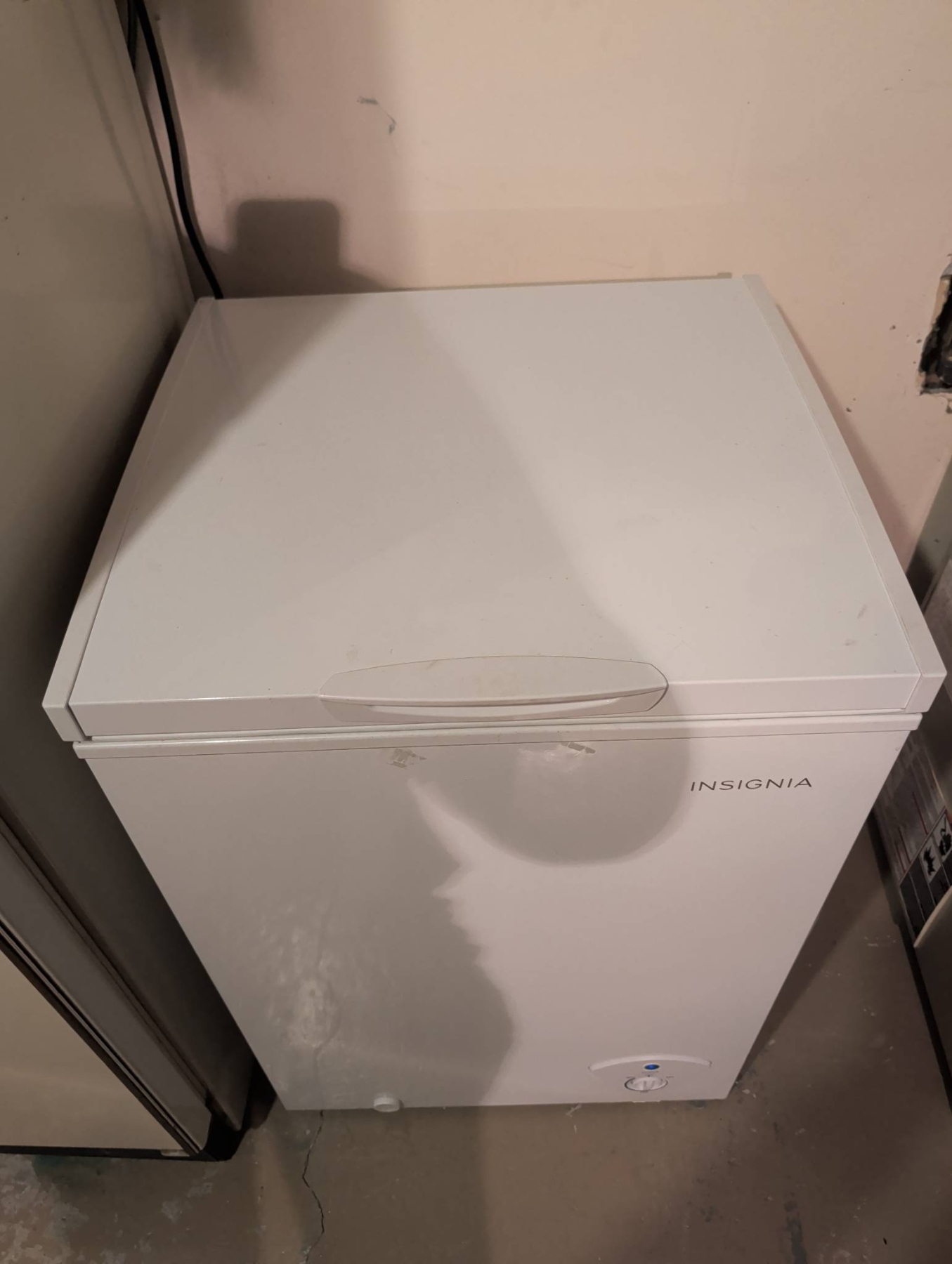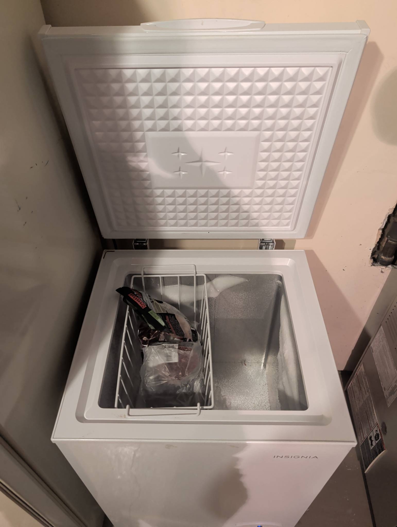 Insignia 5.0 cubic foot chest freezer in a white finish, designed for compact and efficient storage. Features a removable wire basket for organization and a temperature control knob for customizable settings. Ideal for storing frozen meats, vegetables, or bulk items. Exterior dimensions approximate: 27.5in H x 21.5in W x 20in D. Interior shows minor signs of use with some frost build-up. Power cord intact and freezer operational at time of inspection.