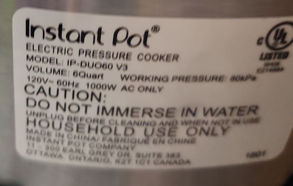 Instapot Model IP-DUO60 V3 Pressure Cooker