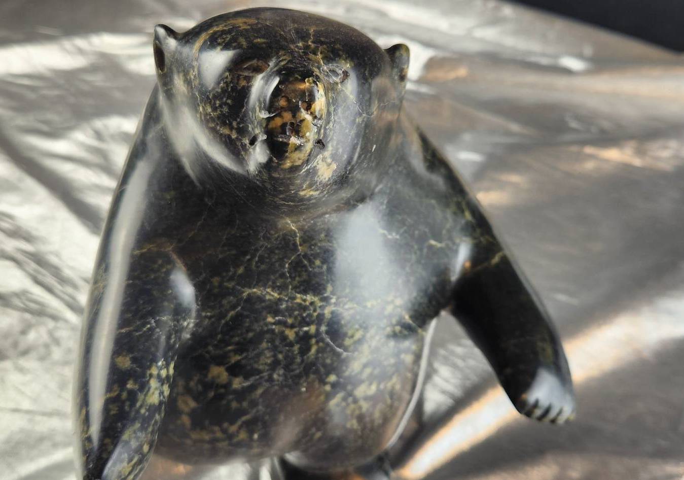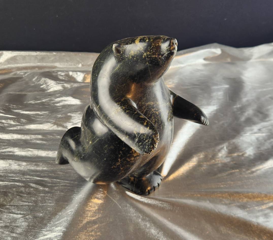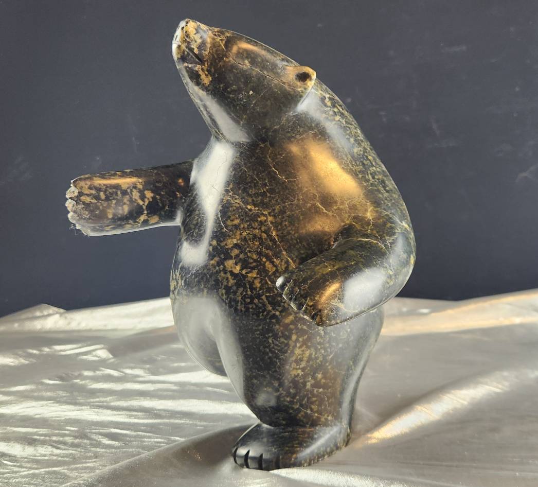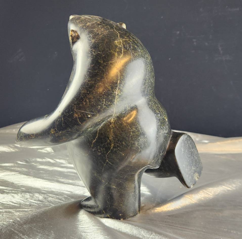 This detailed sculpture captures the enduring legend of the Inuit 'Dancing Bear' in serpentine or soapstone. | | | Measuring 12 inches in height by 7 inches in width and weighing over 20 lbs, this piece showcases exceptional craftsmanship and a rich cultural narrative. | Its elegant curves and balanced stance highlight the bear's dynamic movement, often symbolic of freedom and celebration in Inuit tradition.