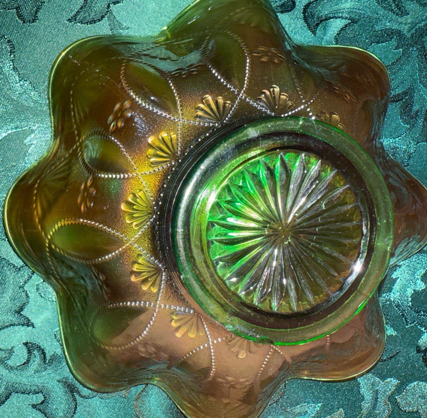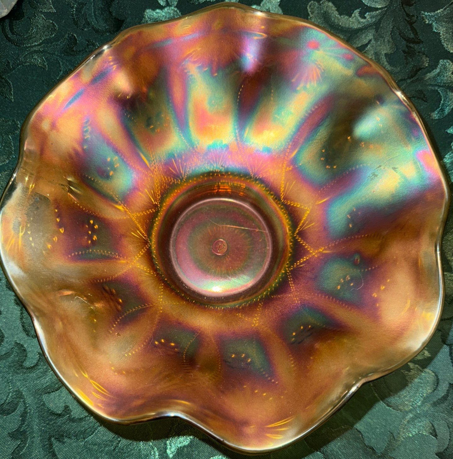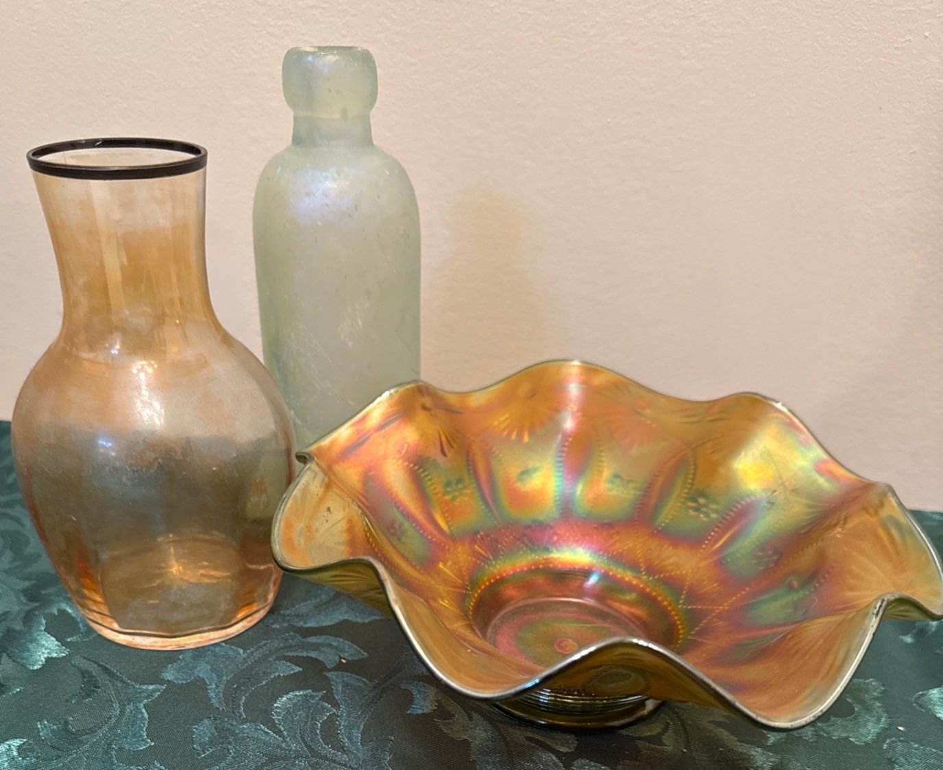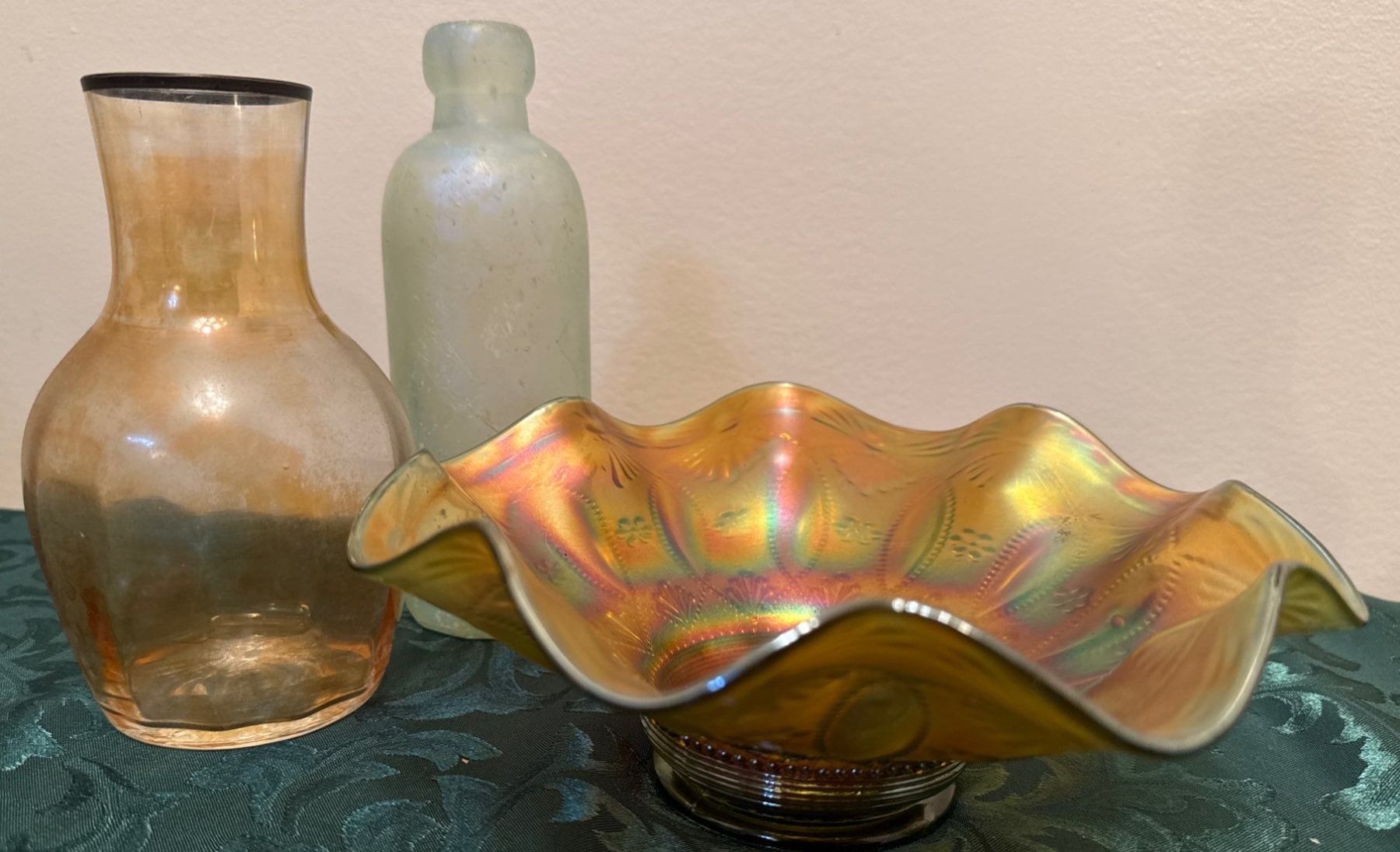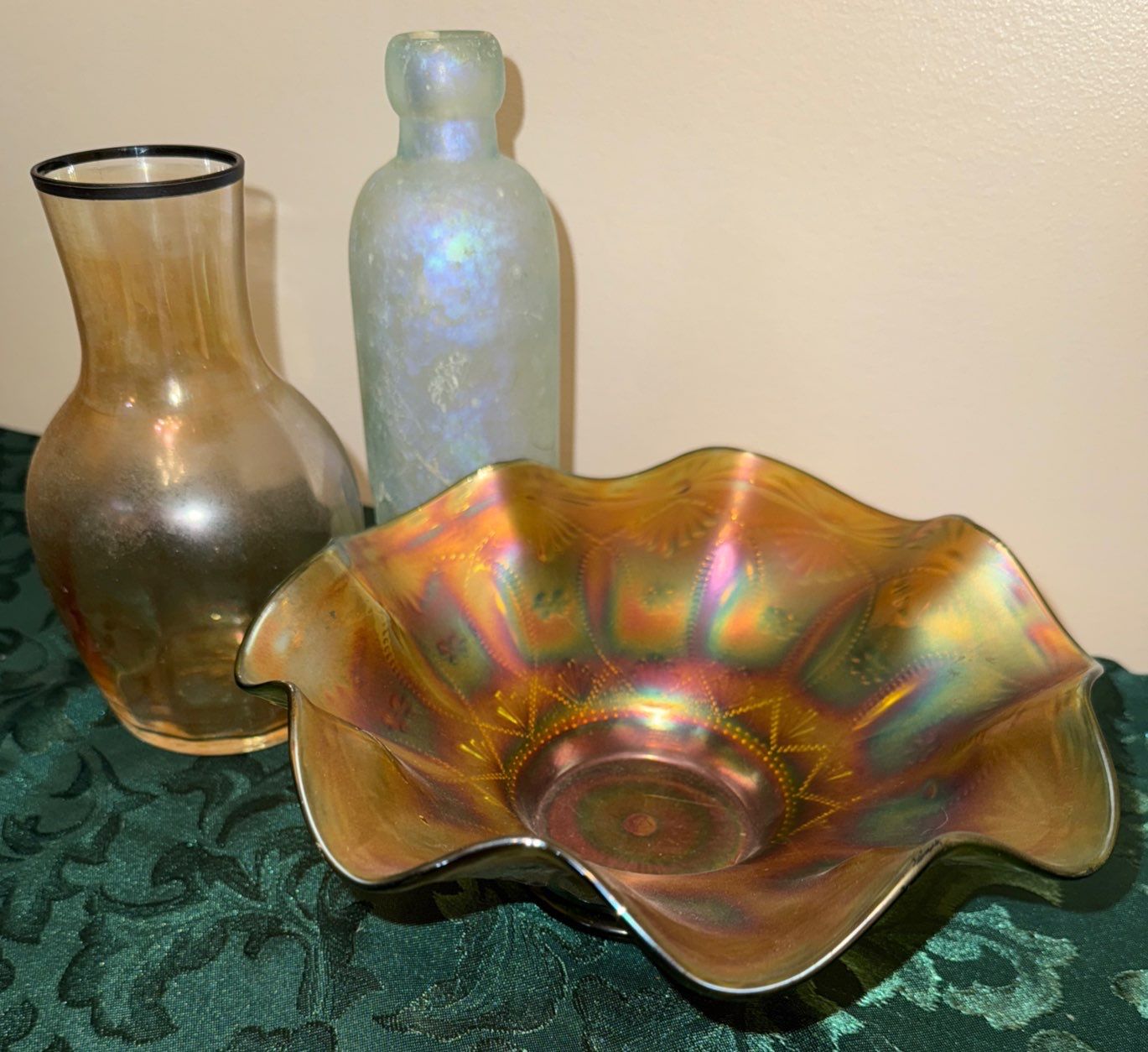 Iridescent Carnival Glass Ruffled Bowl, Decanter & Tall Frosted Bottle-Marigold Carnival Gls