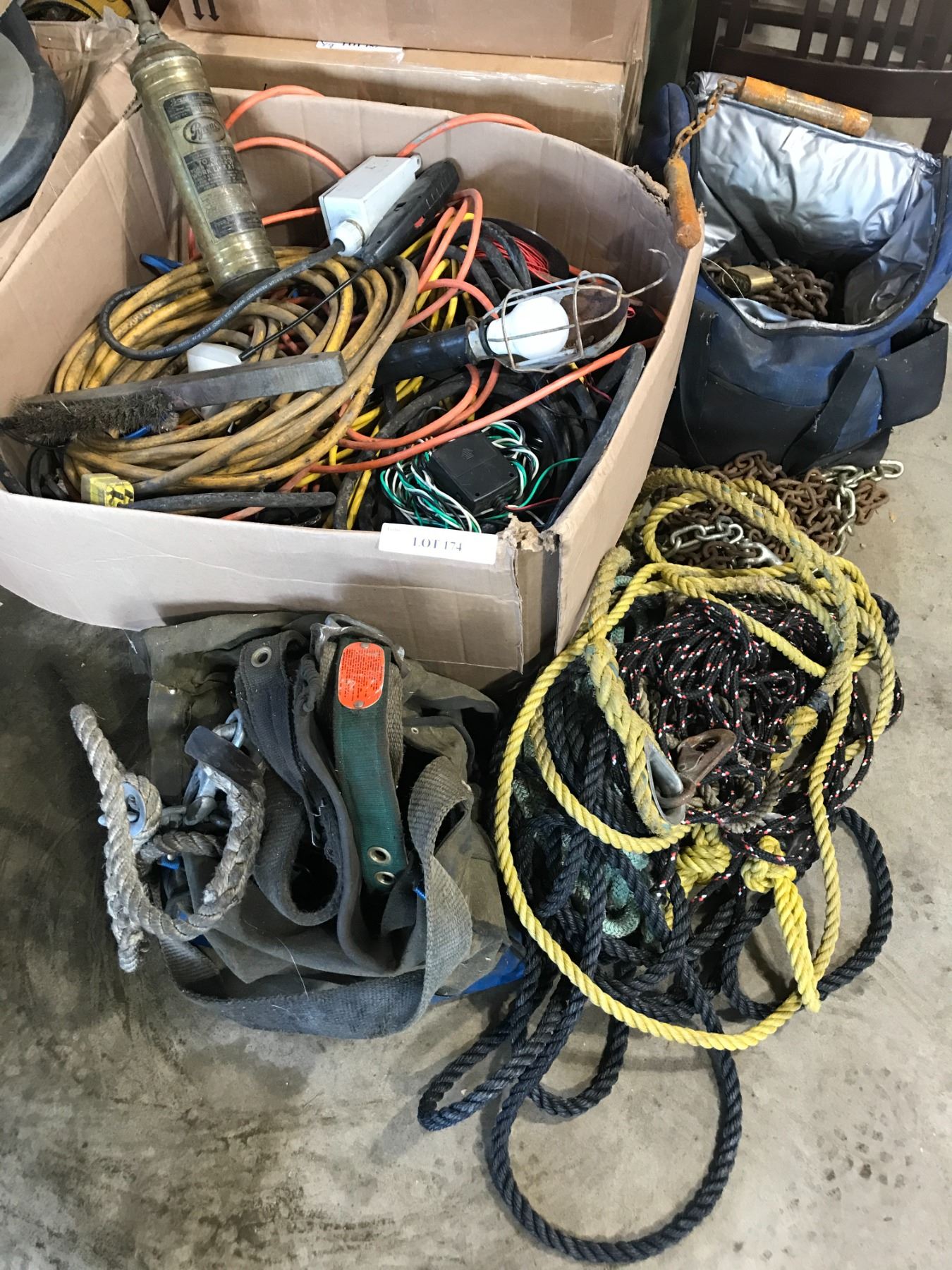 Iron Working Harness, Asst Ropes, Carabiner's, Chains, Extension Cords, Trouble Light, Wire Brush, A