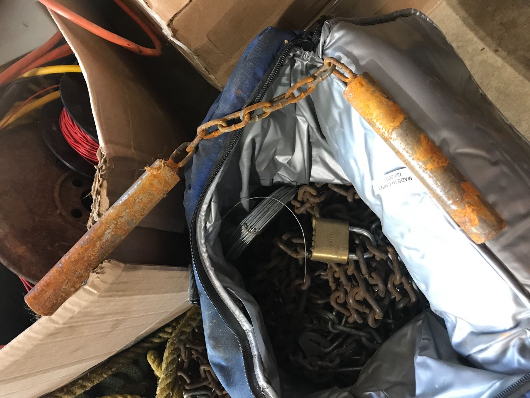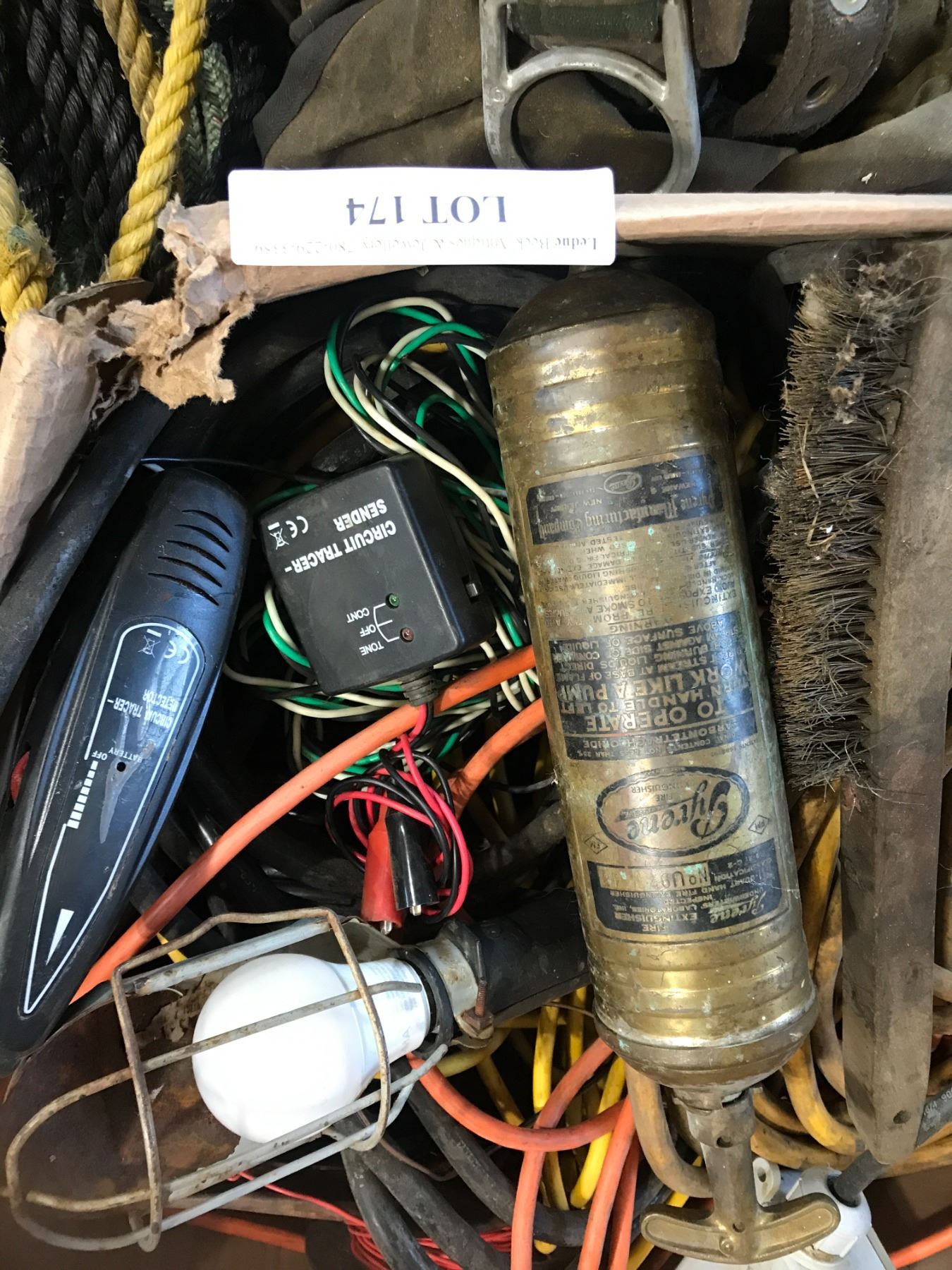 Iron Working Harness, Asst Ropes, Carabiner's, Chains, Extension Cords, Trouble Light, Wire Brush, Antique Fire Extinguishers, Homemade Nunchucks
