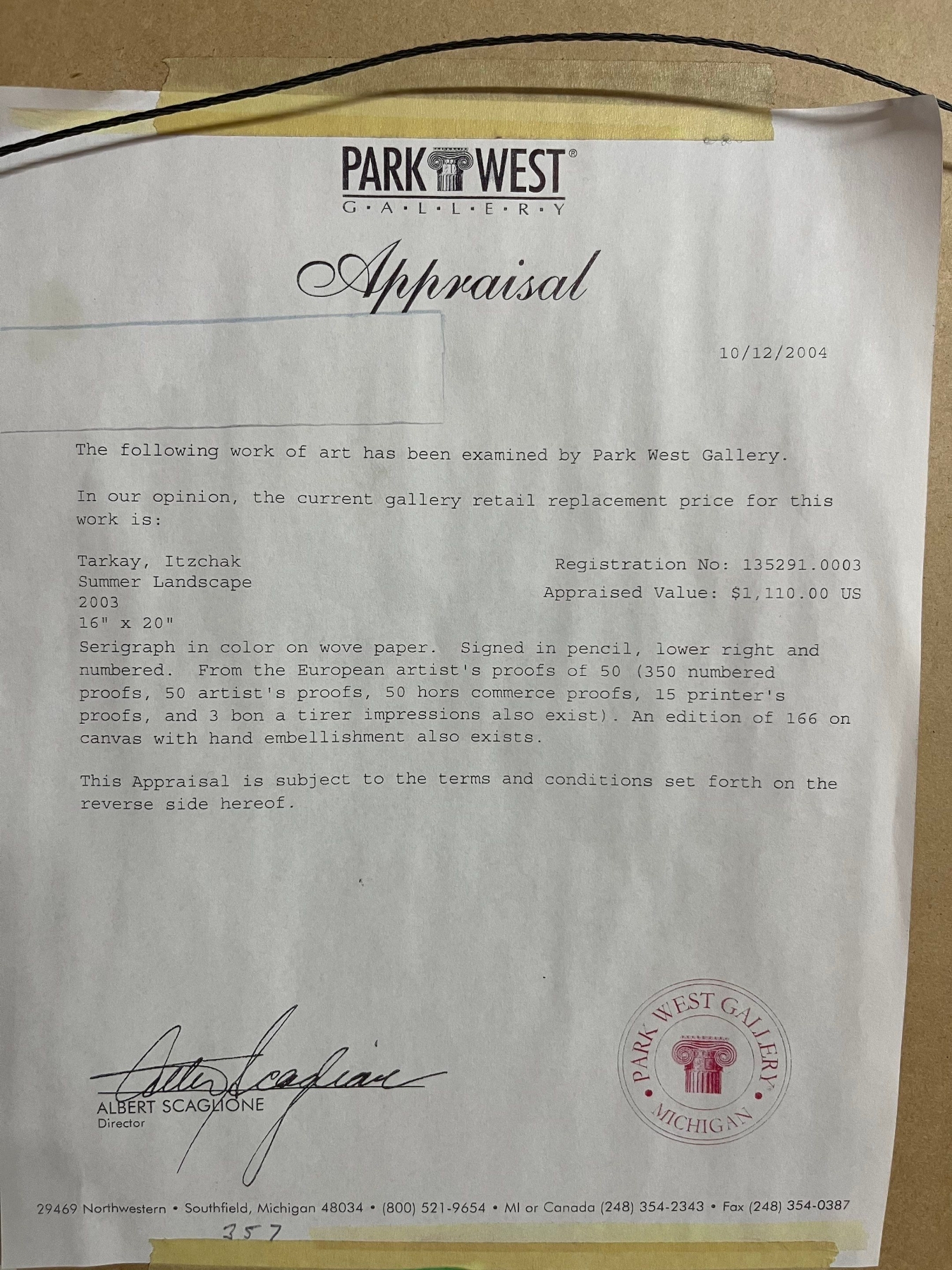 Itzahak Tarkay, Summer Landscape Serigraph in Color On Wove Paper Signed In Pencil on the lower right and numbered .European Artists Proofs 16 X 20