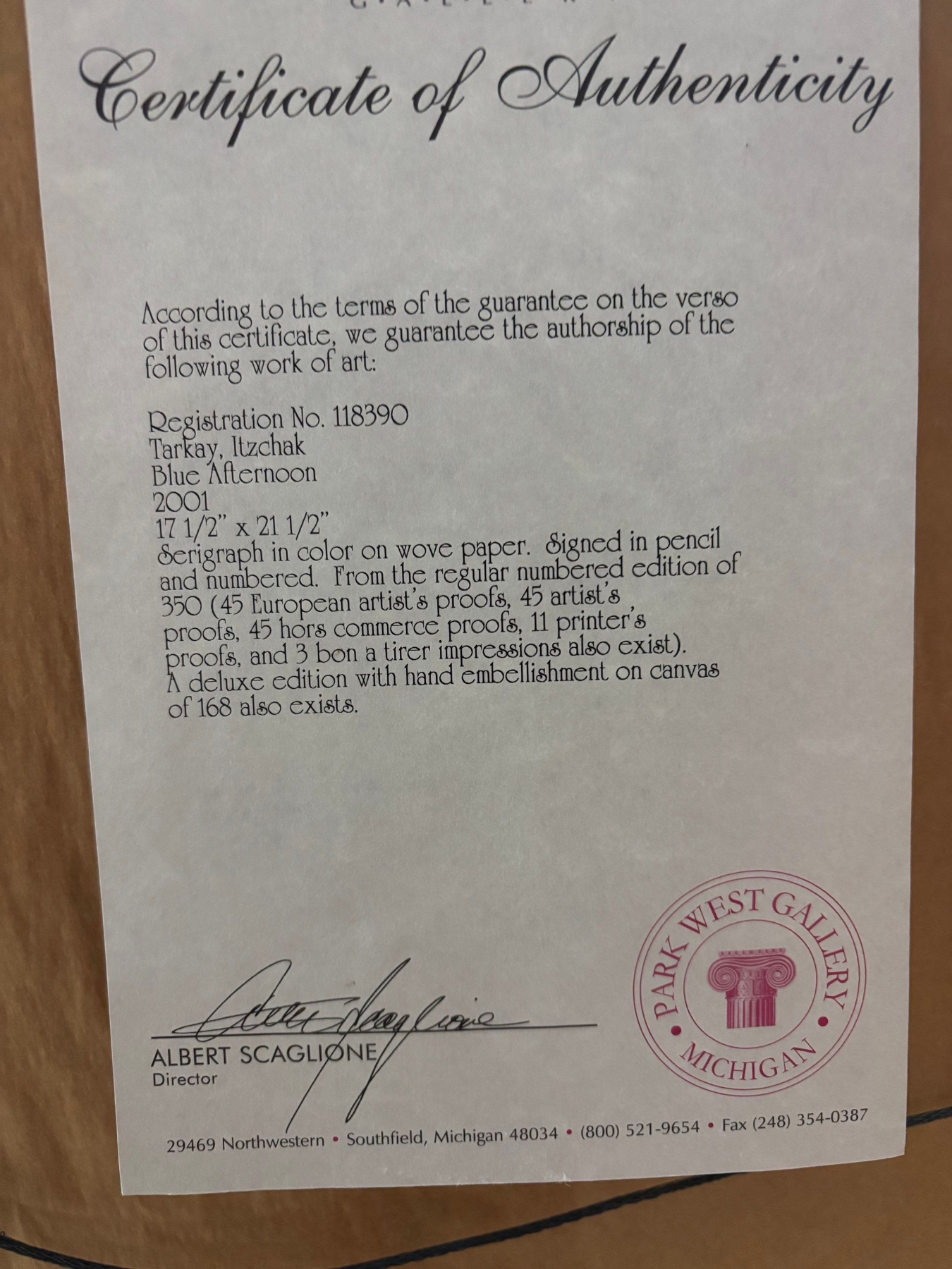 Itzchak Tarkay Titled Blue Afternoon 158/350 Serigraph in color on woven paper Hand signed in pencil