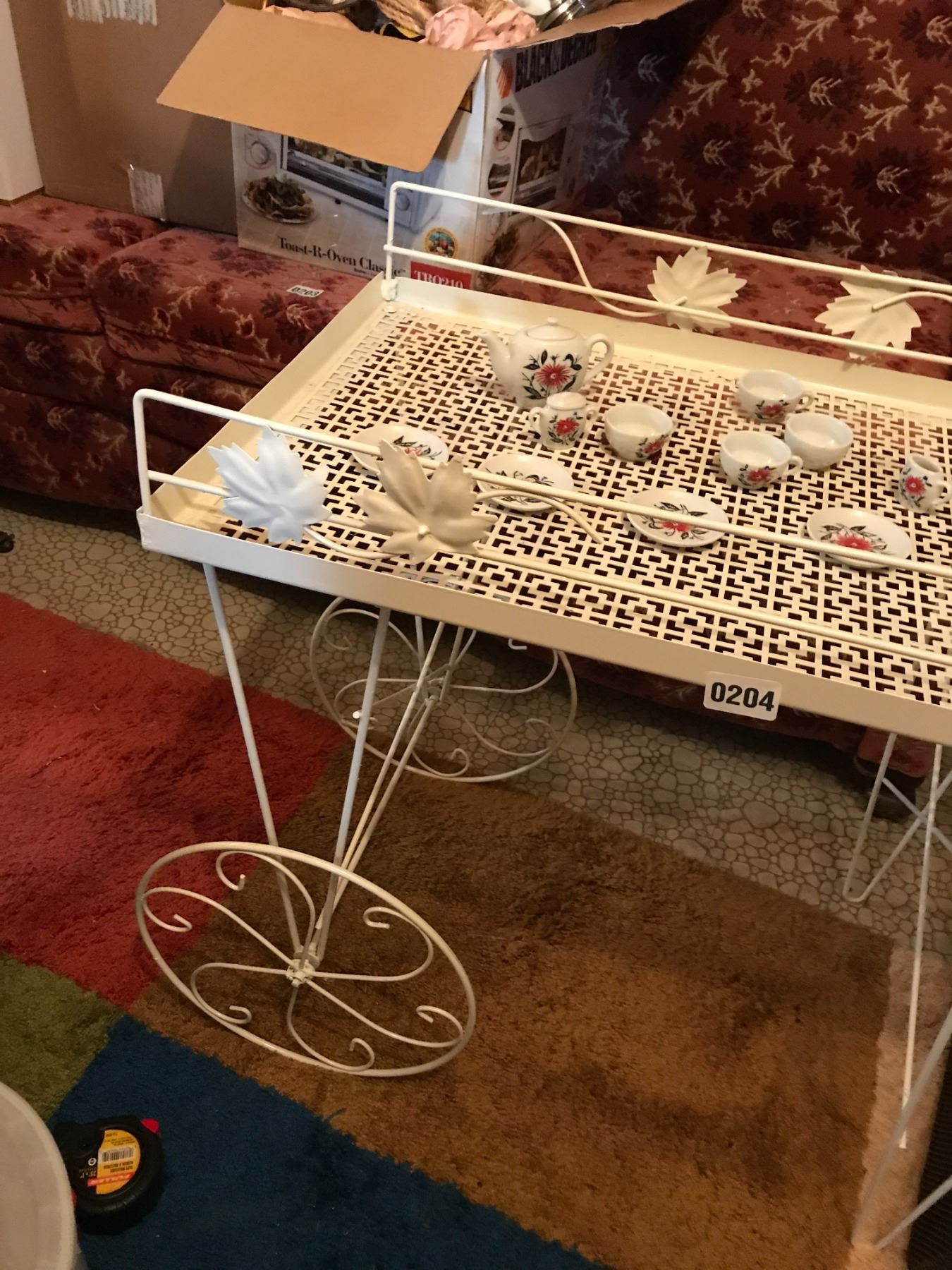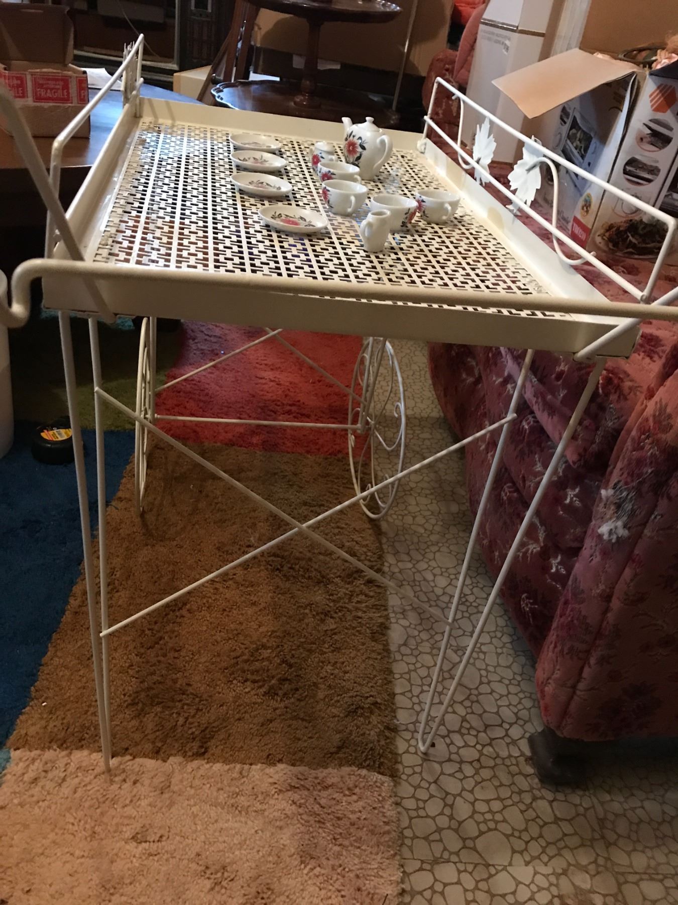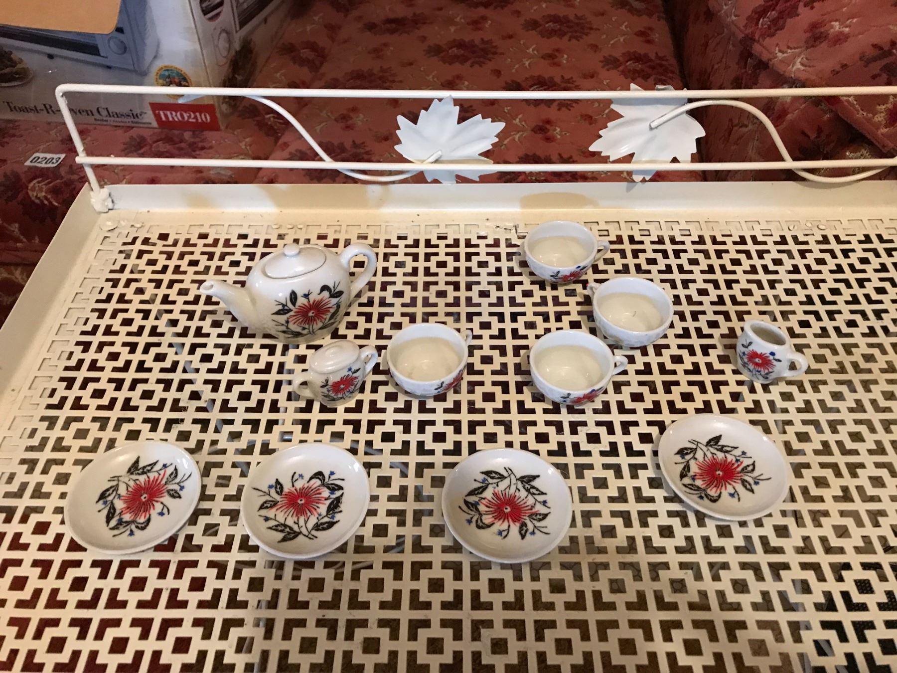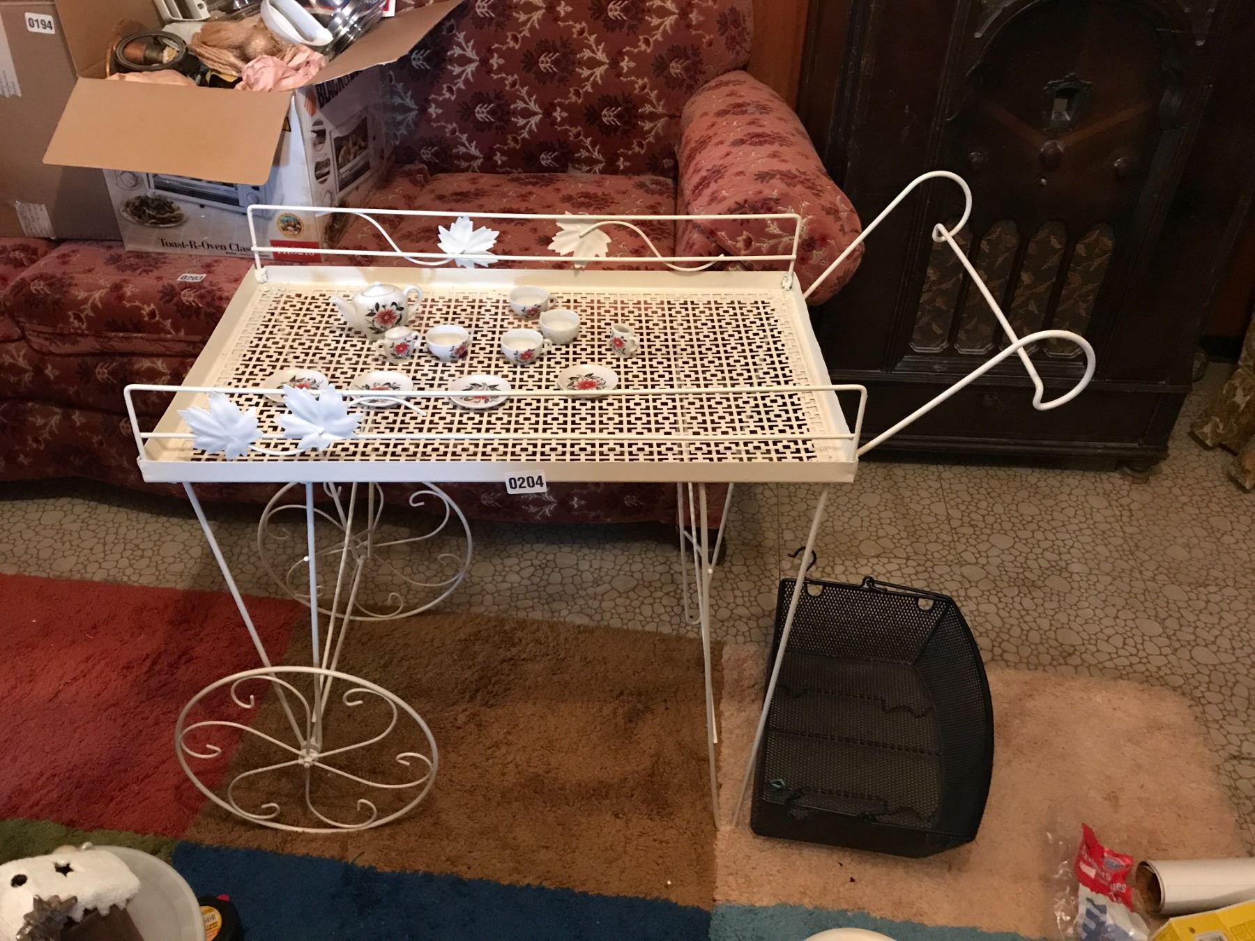 Ivory Metal Tea-cart, Miniature Children;s Tea Set & Metal Basket