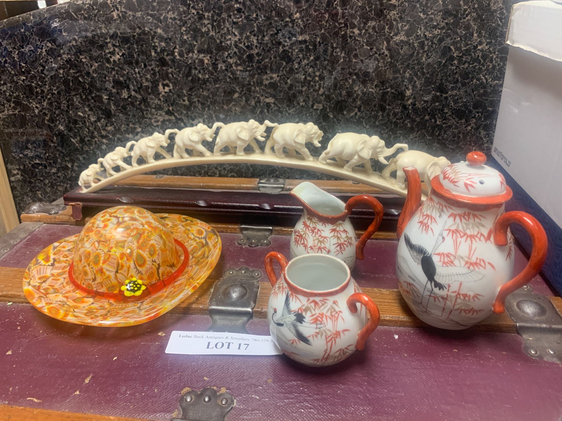 Japanese Teapot, Cream & Sugar Set, Synthetic Ivory Elephant Sculpture, Glass Garden Hat