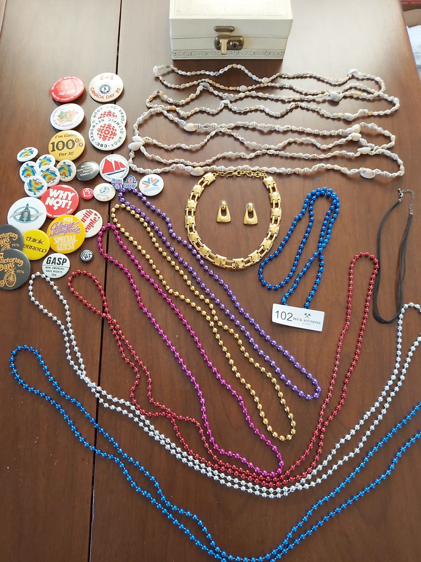 Jewellery Box with Costume Jewellery, Mardis Gras Beads, Pins & Buttons