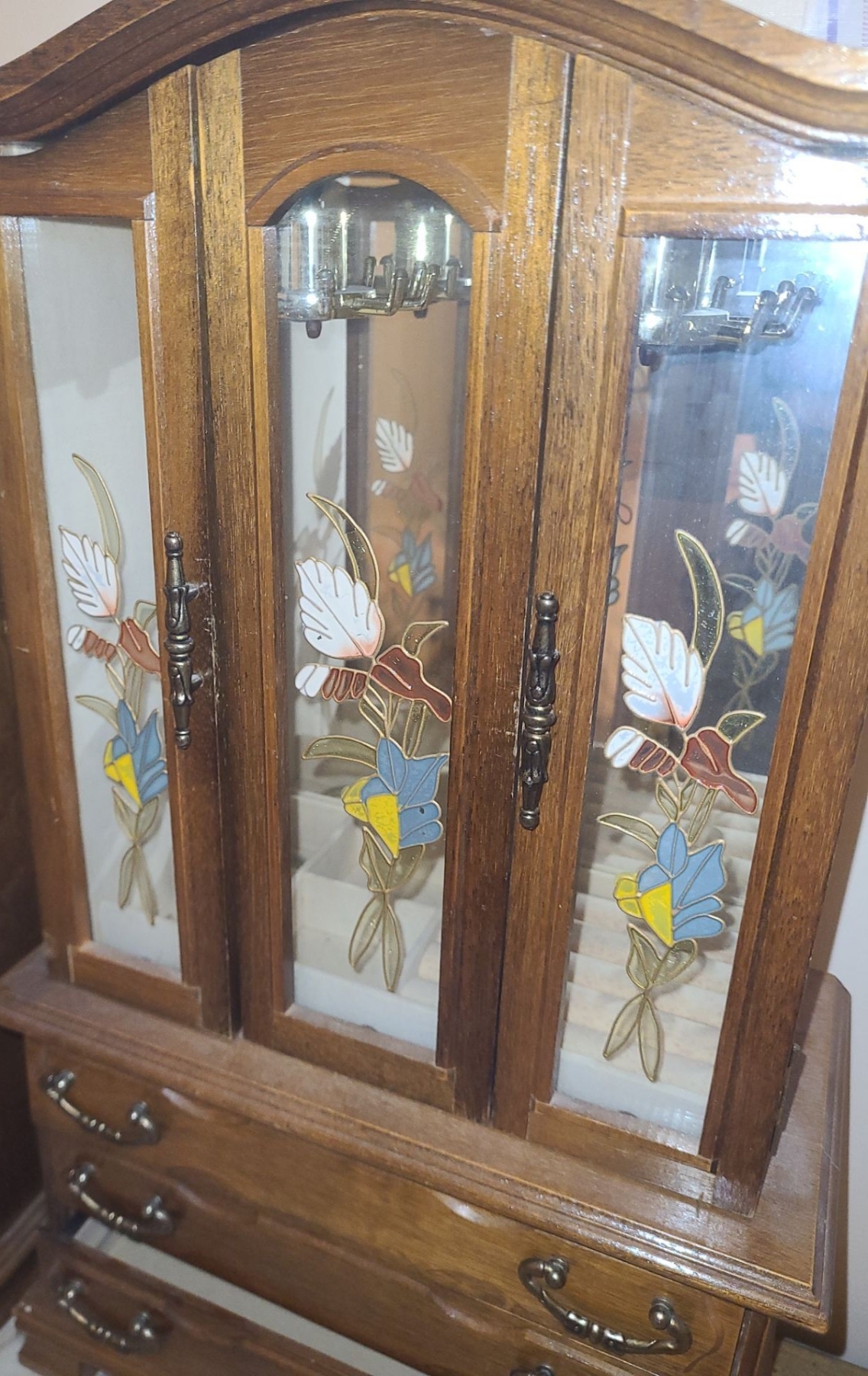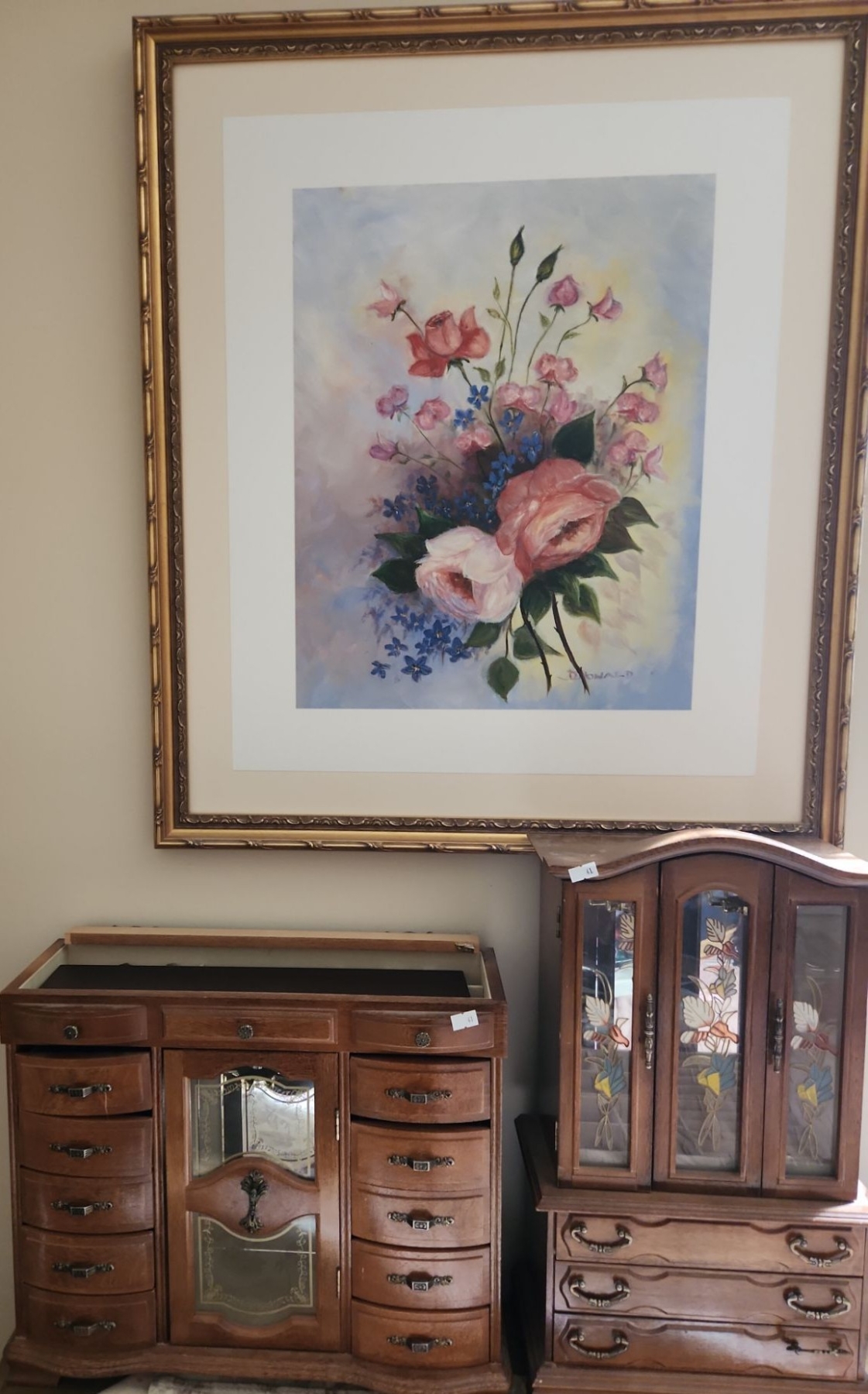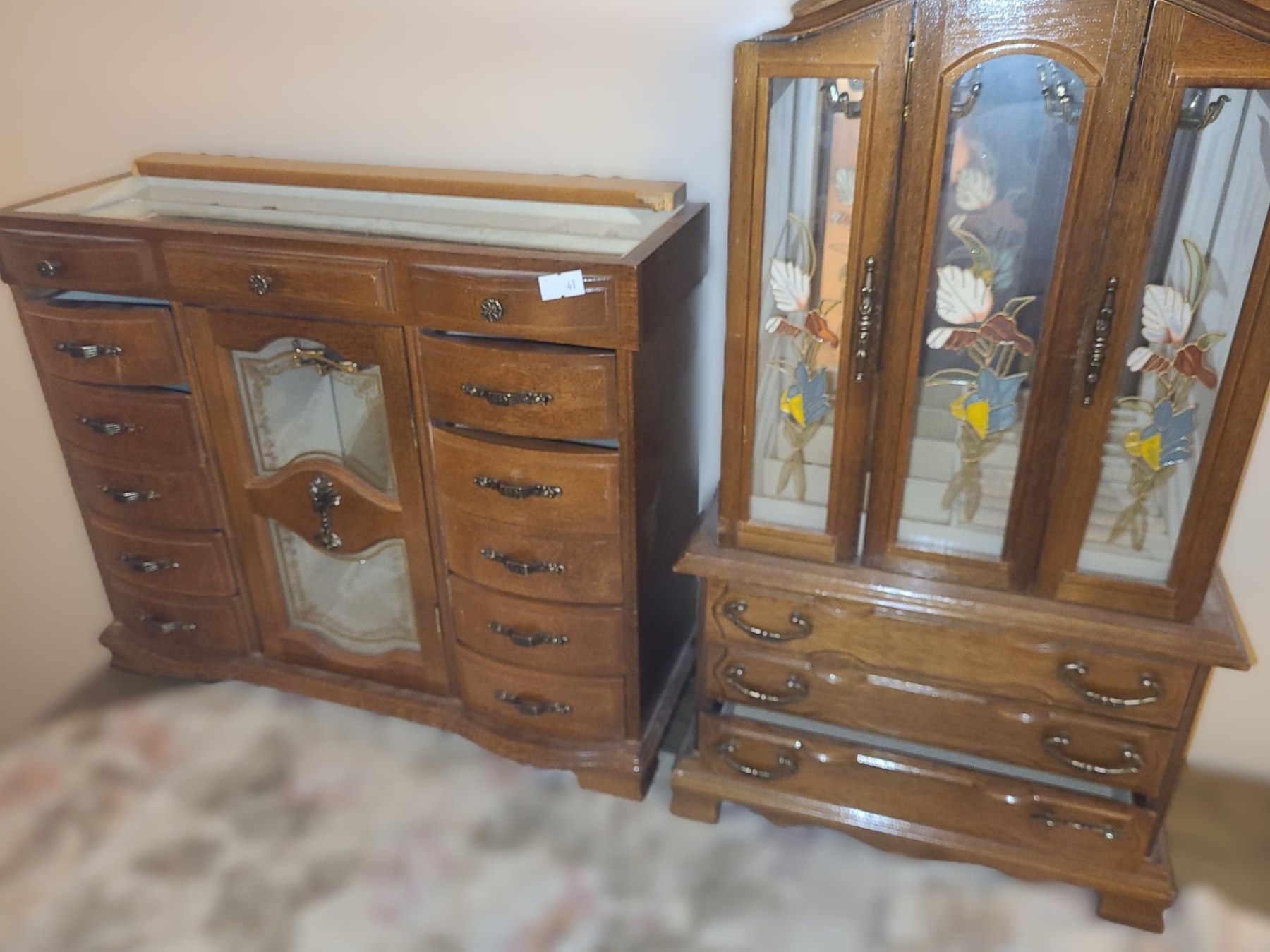 Jewelry Boxes: 17.5 W, 6 D, 14.5 T (Lid Missing) and 11.5 W, 6 D, 20 T, Roses Print 26 X 30